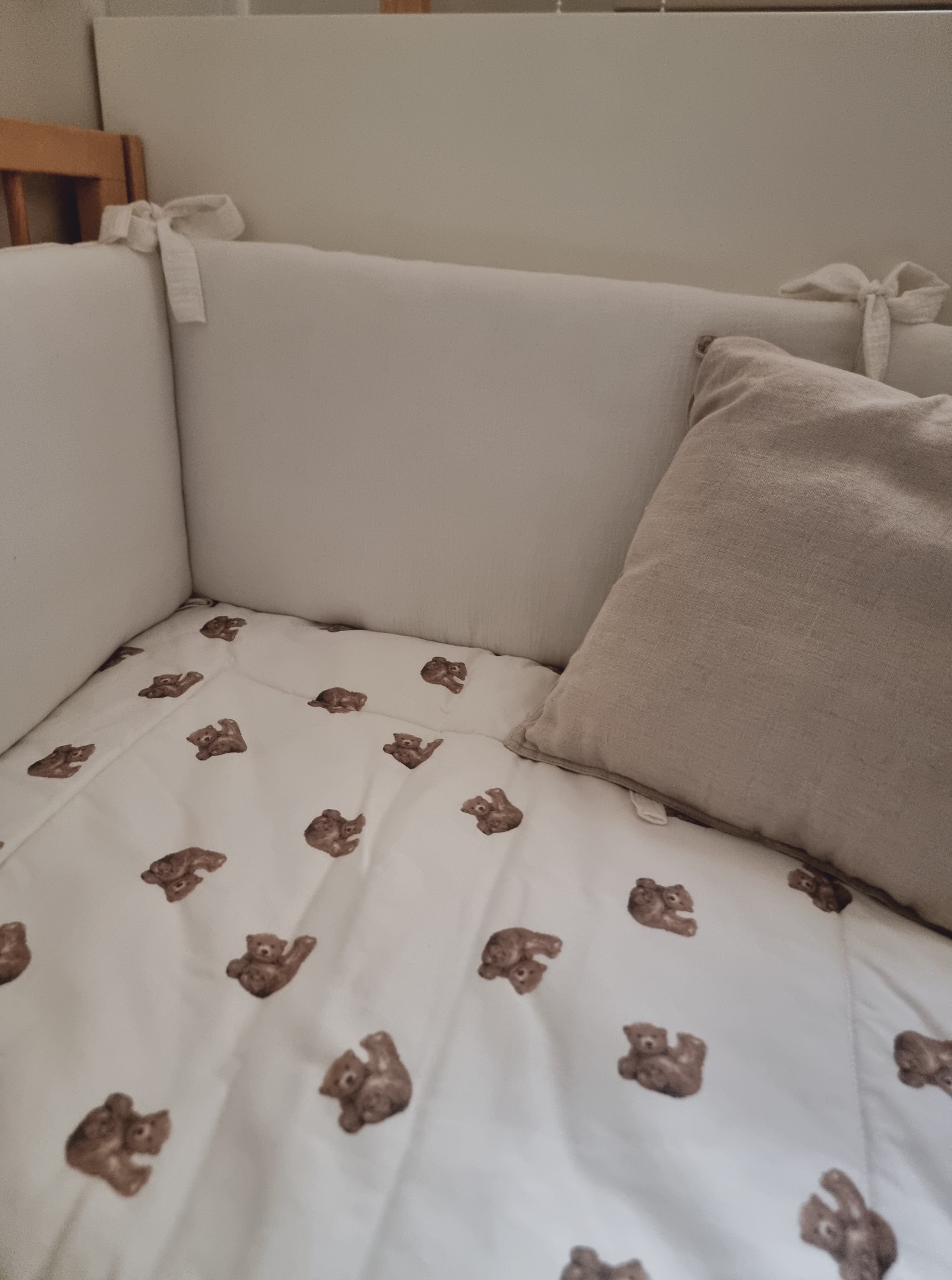 Acolchado para cuna Funcional confeccionado en gabardina estampada 100% algodón y relleno de guata siliconada.