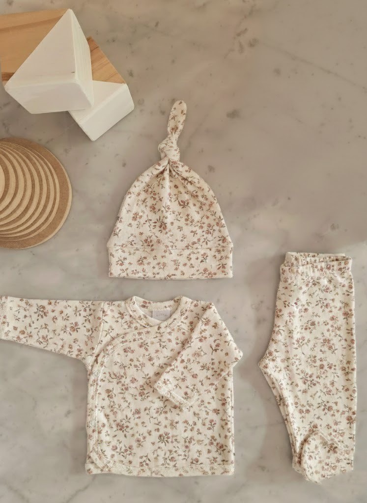 Este ajuar incluye batita, ranita y gorrito, confeccionados en algodón Pima: suave, respirable e hipoalergénico, perfecto para la piel sensible del bebé.