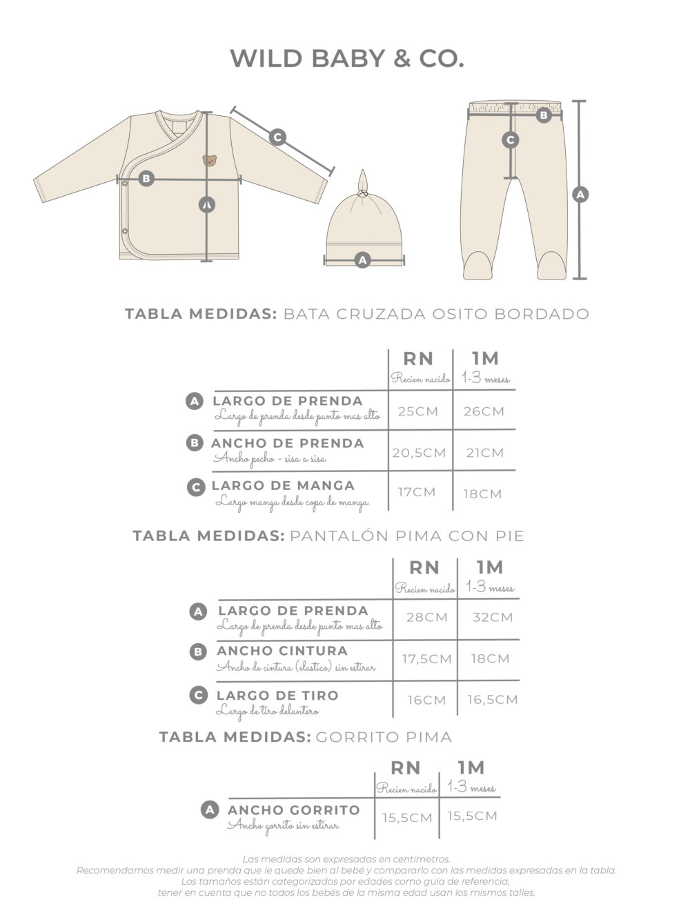 Talles disponibles: RN (Recién Nacido) y 1 mes (1 a 3 meses).