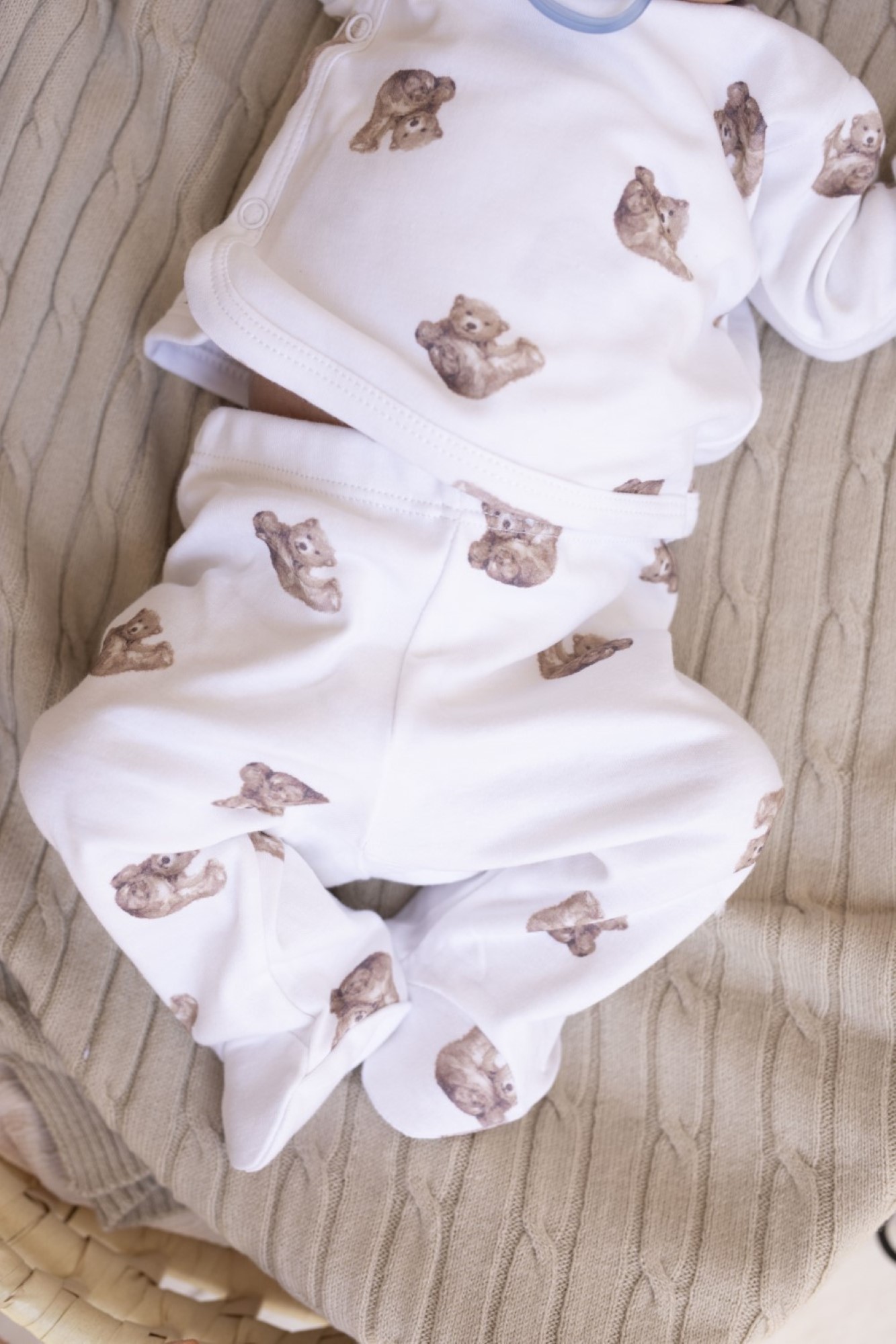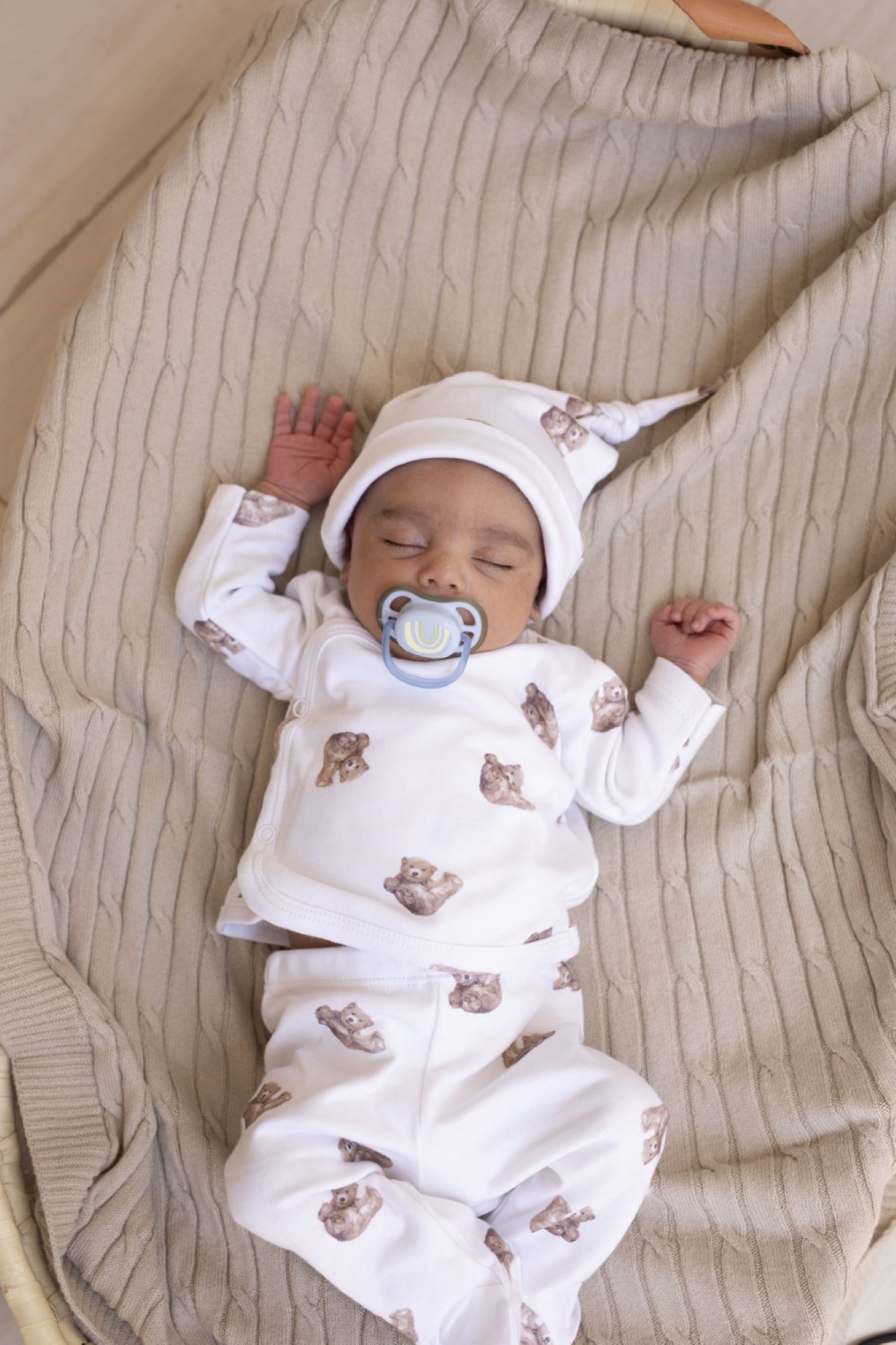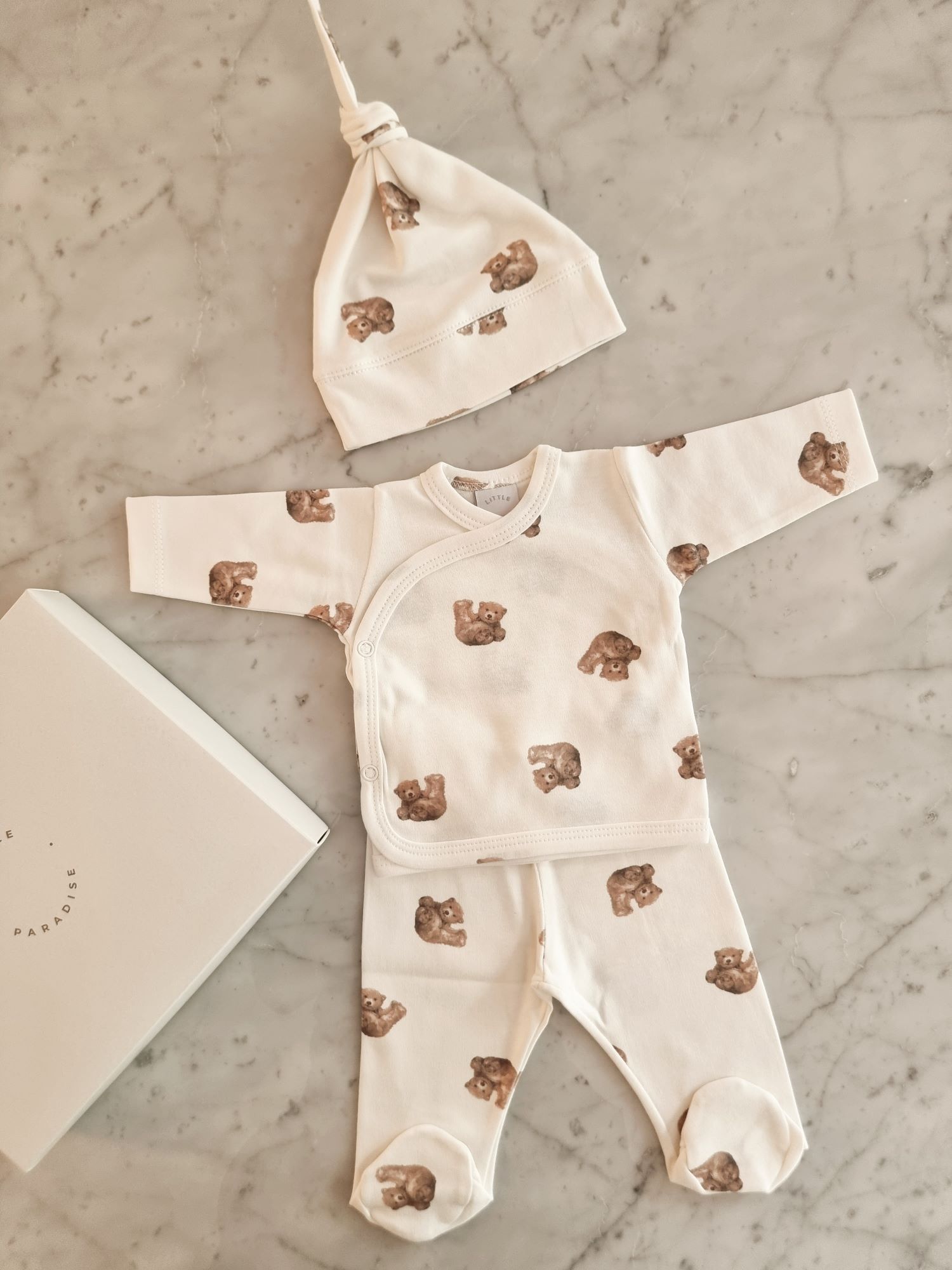 Este hermoso ajuar incluye batita, ranita y gorrito, confeccionados en algodón Pima, con nuestro exclusivo diseño de ositos 🐻.
