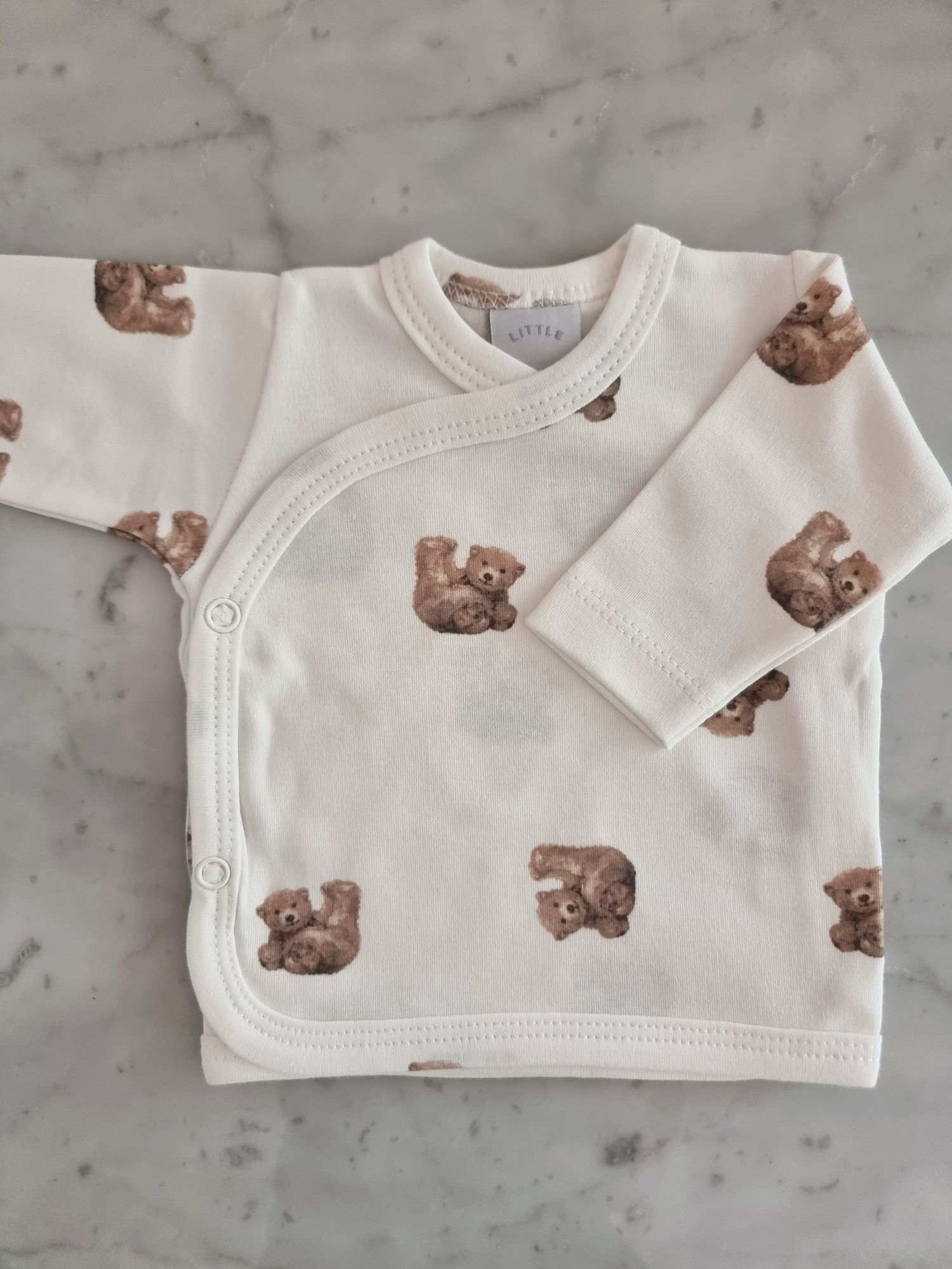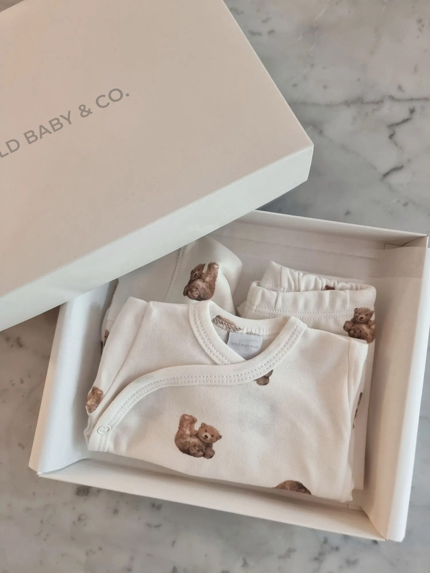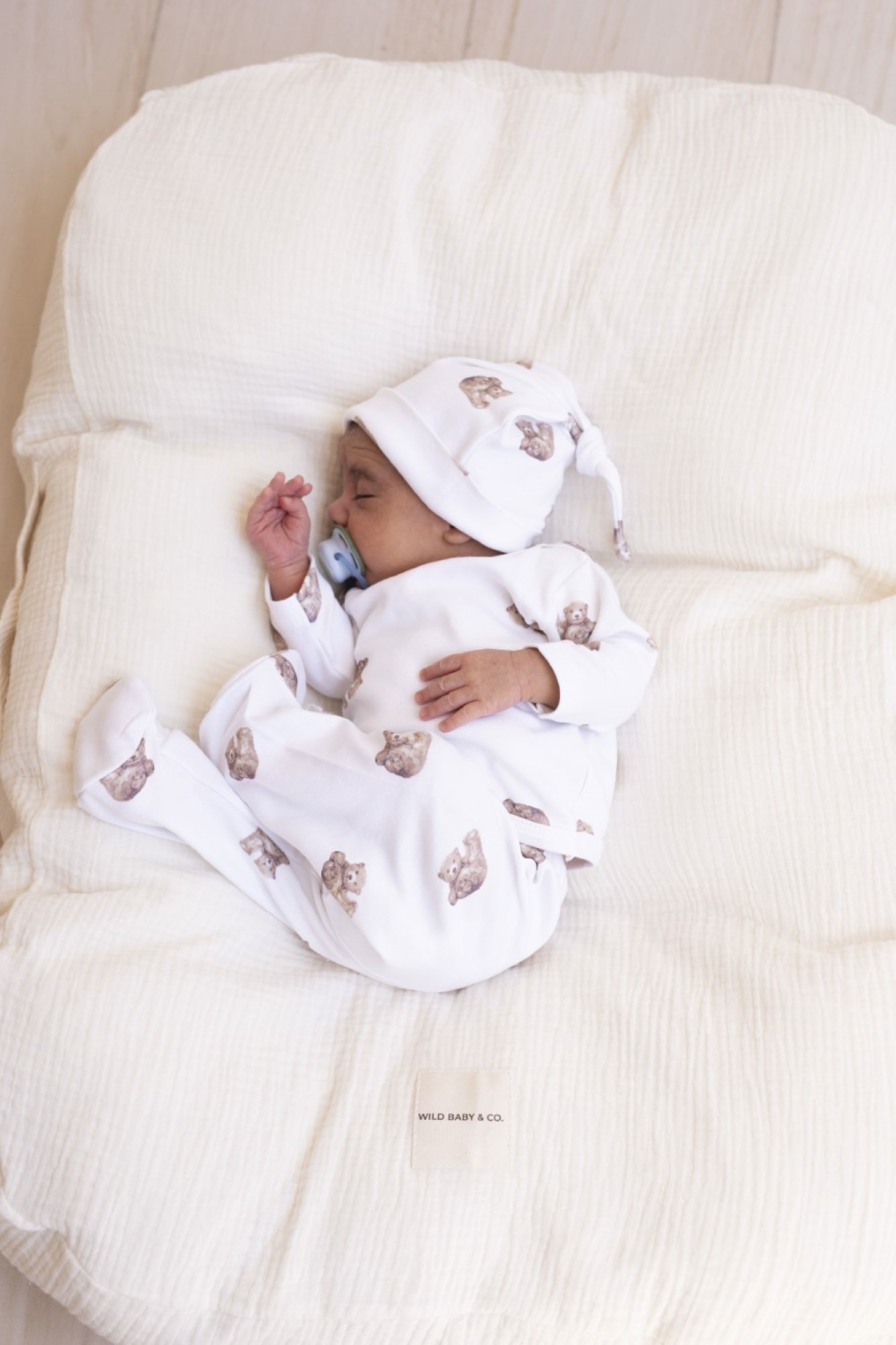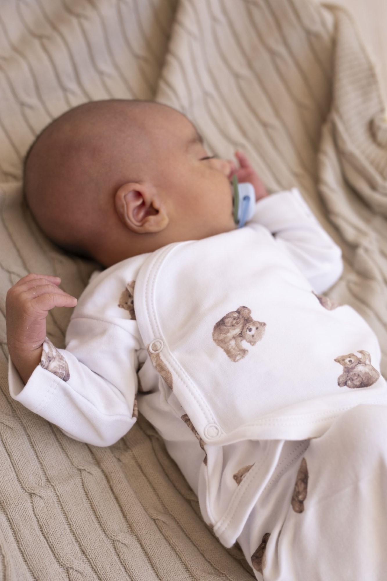 Este hermoso ajuar incluye batita, ranita y gorrito, confeccionados en algodón Pima, con nuestro exclusivo diseño de ositos 🐻.