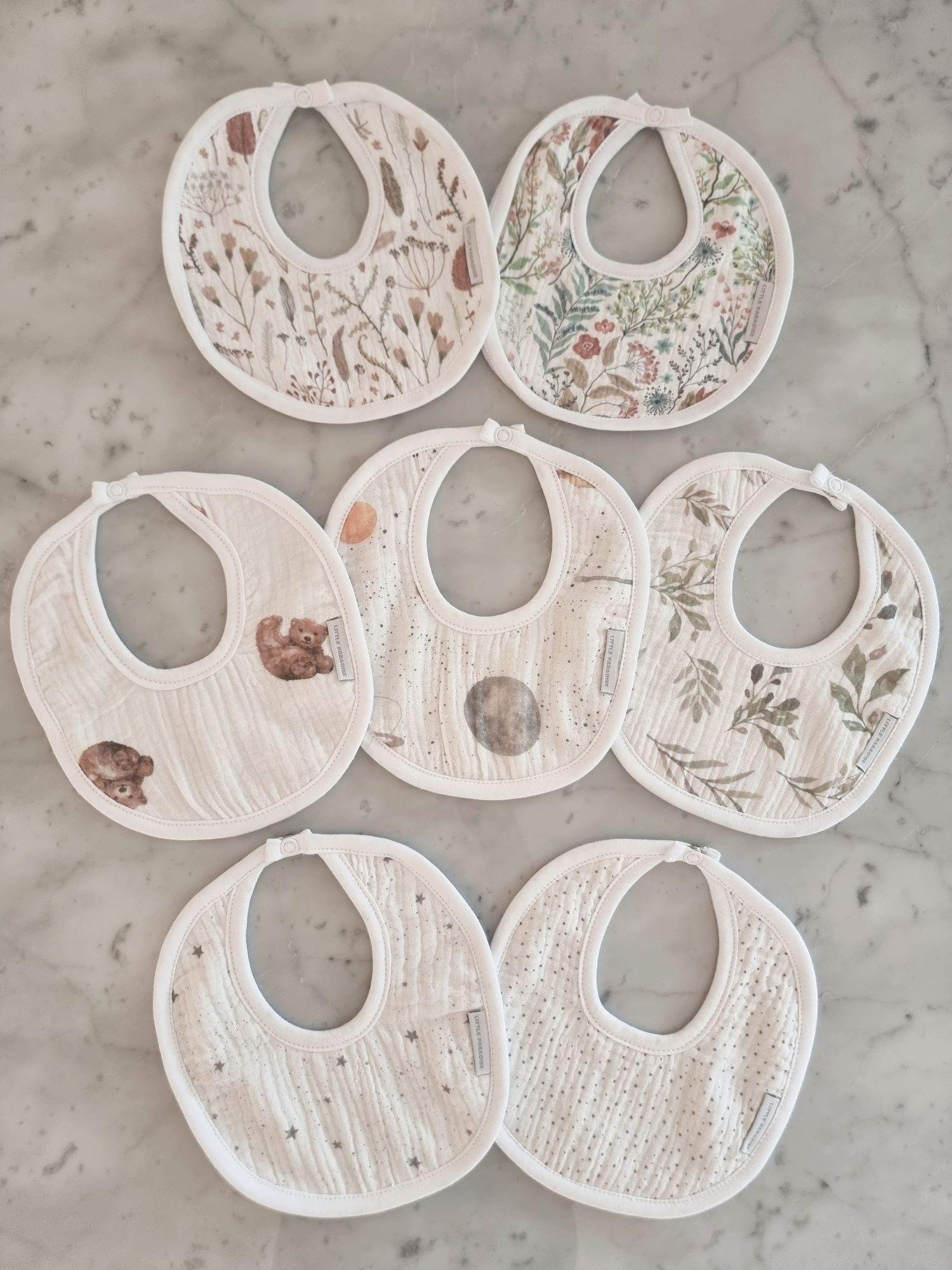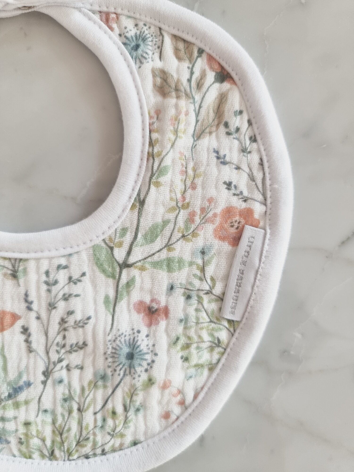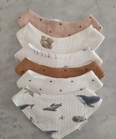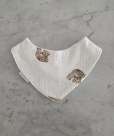 Confeccionado en gasa puro algodón y reverso de towel super absorbente. Botón clip para abrochar.