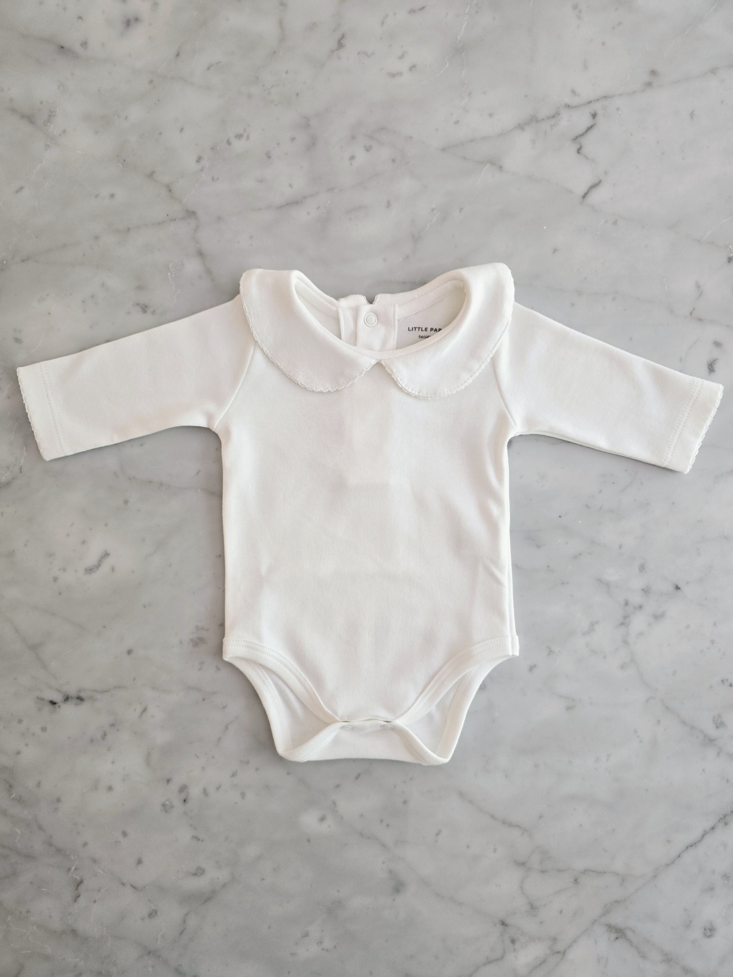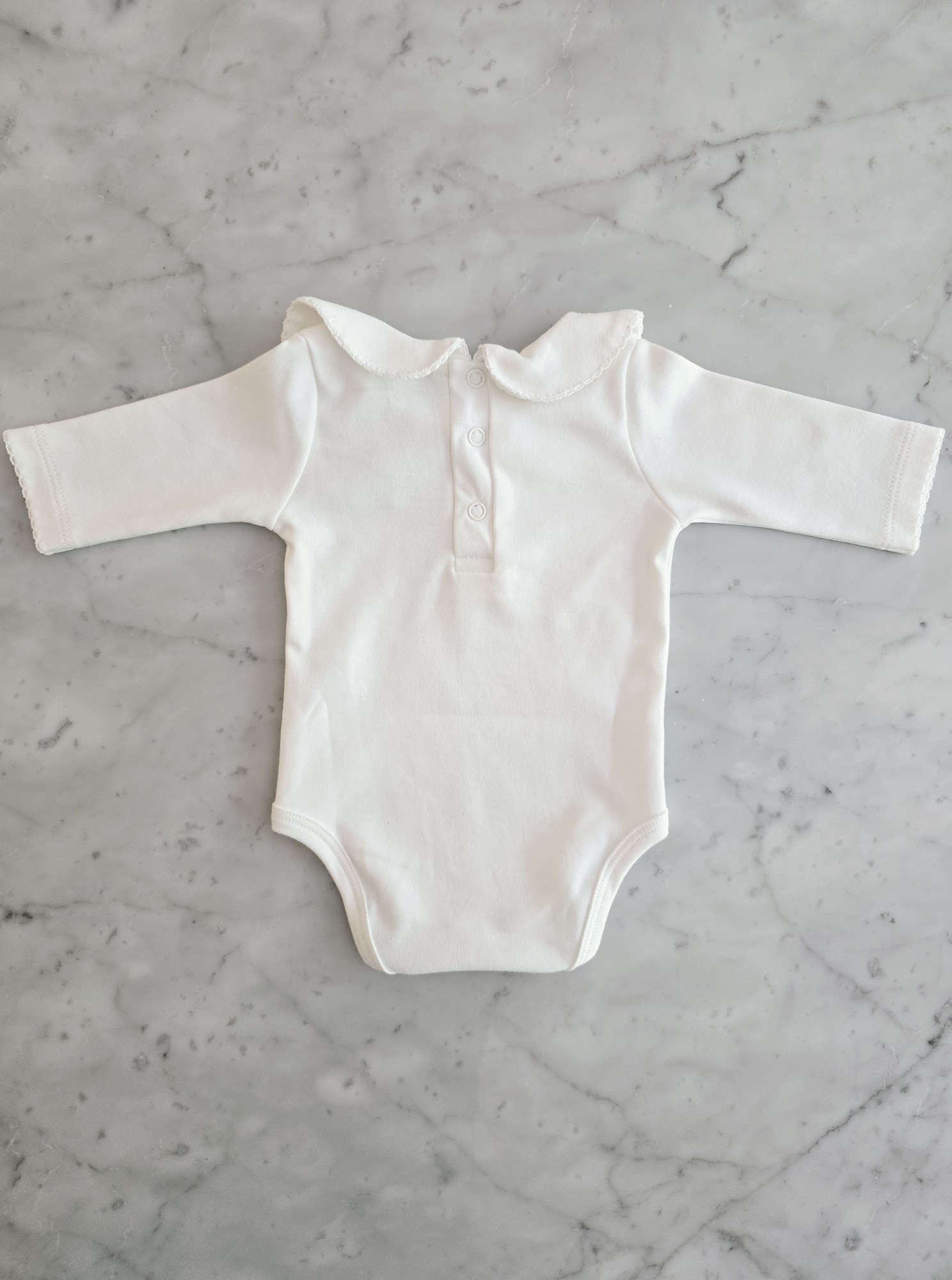 Modelo en manga larga, con cuellito redondo y terminaciones en picot. Espalda con cartera con botones para su apertura.