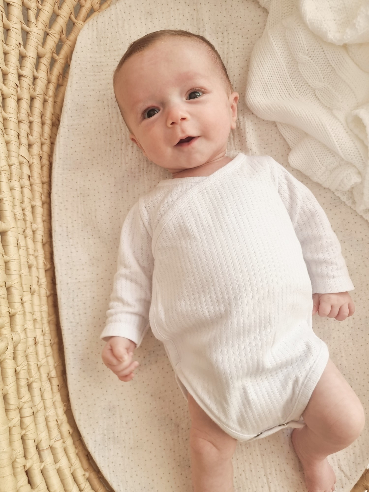 Este body estilo kimono está confeccionado en 100% algodón labrado, un tejido súper delicado ideal para la piel sensible de tu bebé.