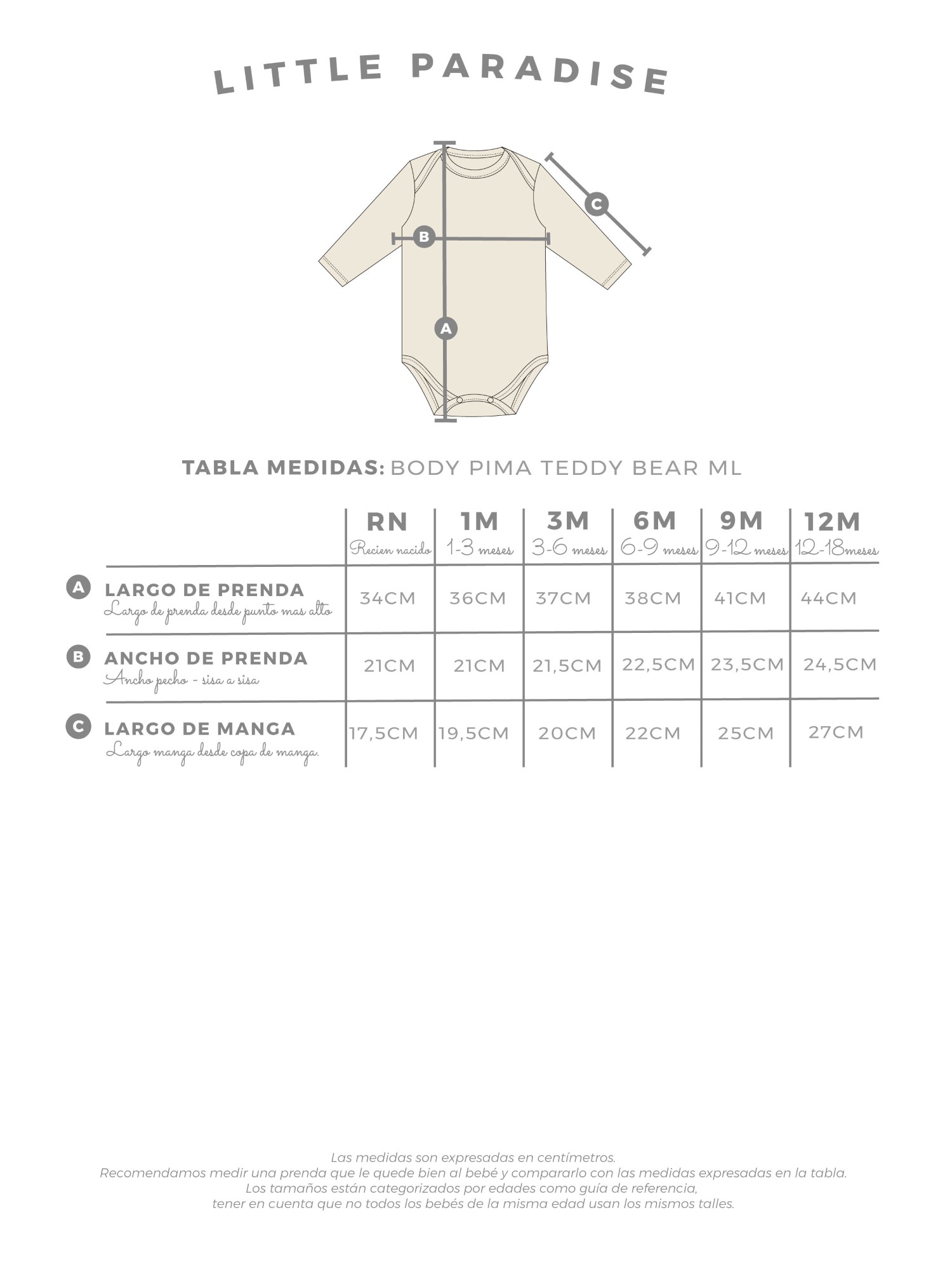 Confeccionado en algodón Pima, un tejido delicado, respirable e hipoalergénico que cuida la piel desde el primer día. Incluye hombro cruzado para vestir con facilidad y broches en la entrepierna para un cambio práctico y cómodo.