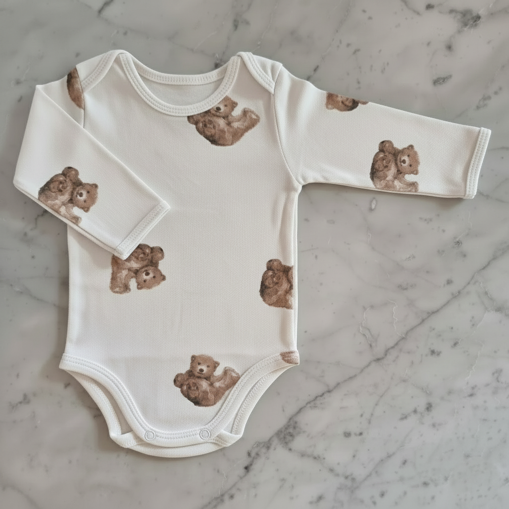 Body estampado 100% algodón Pima. Modelo de mangas largas, con cuello americano y broches en entrepierna para el cambio de pañal.