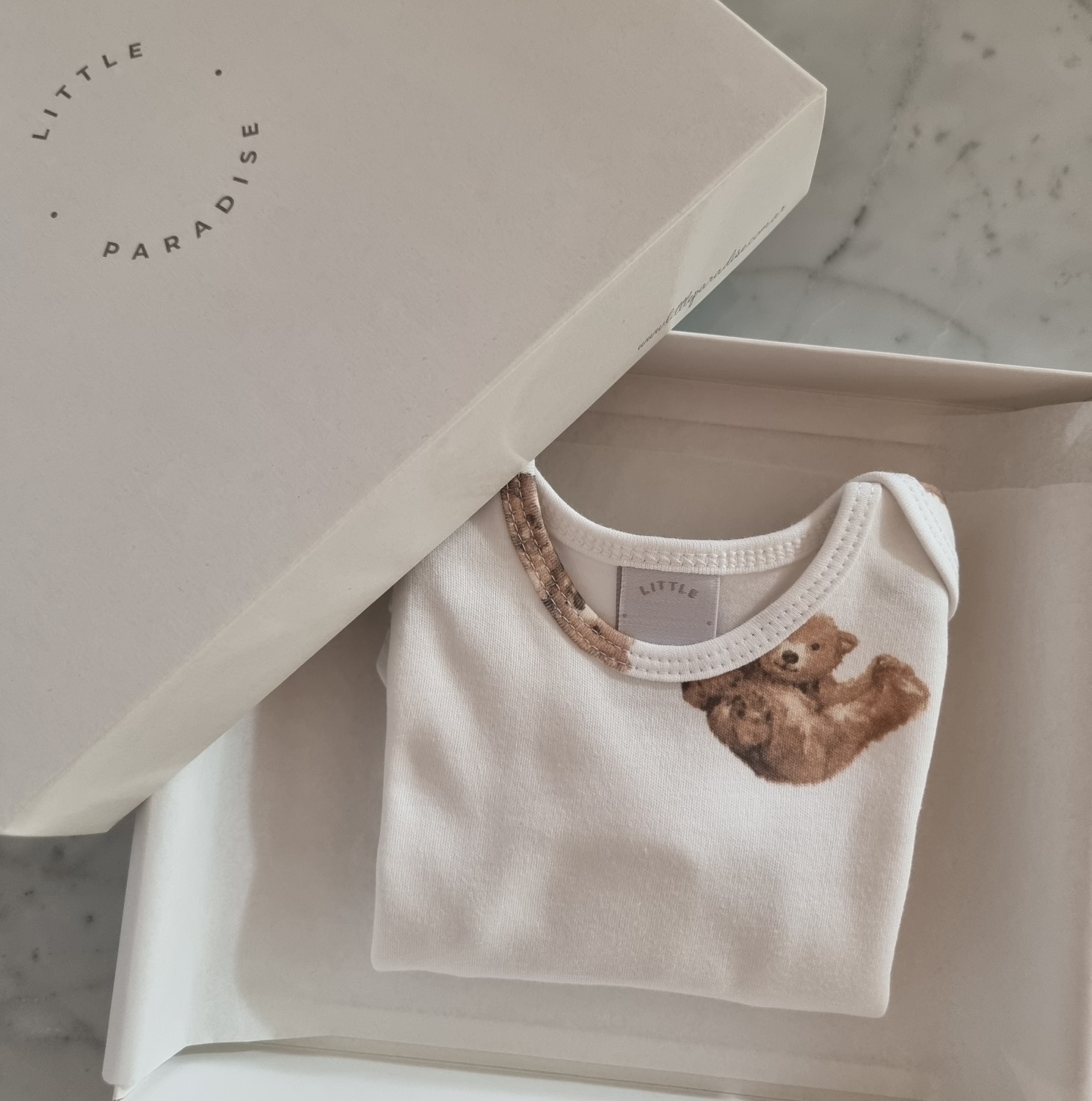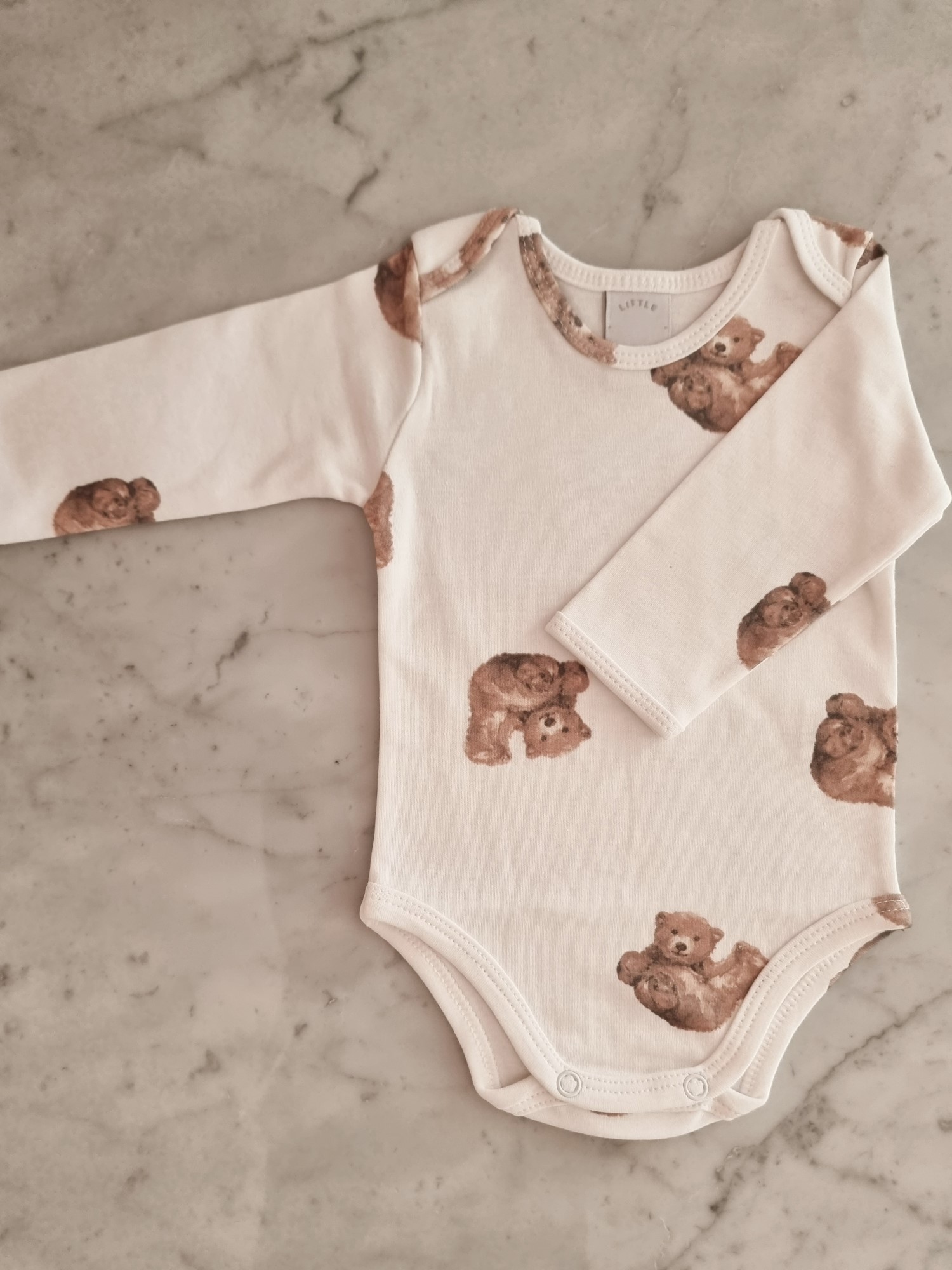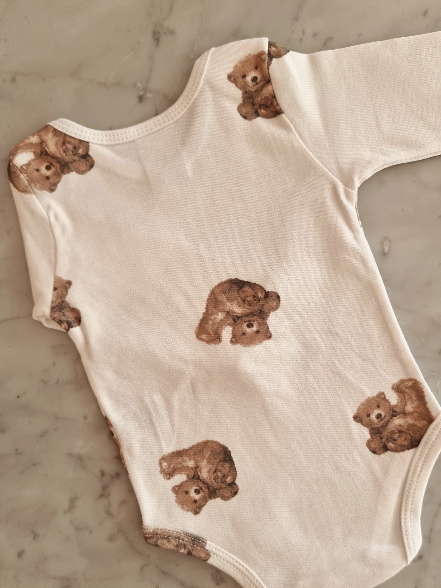 Body estampado 100% algodón Pima. Modelo de mangas largas, con cuello americano y broches en entrepierna para el cambio de pañal.
