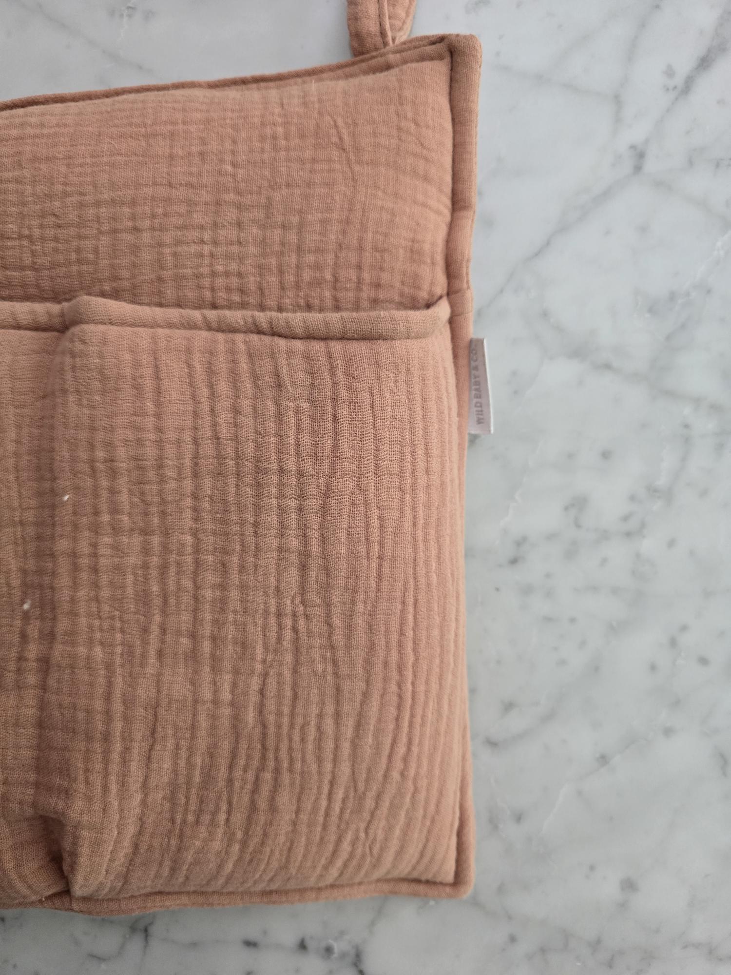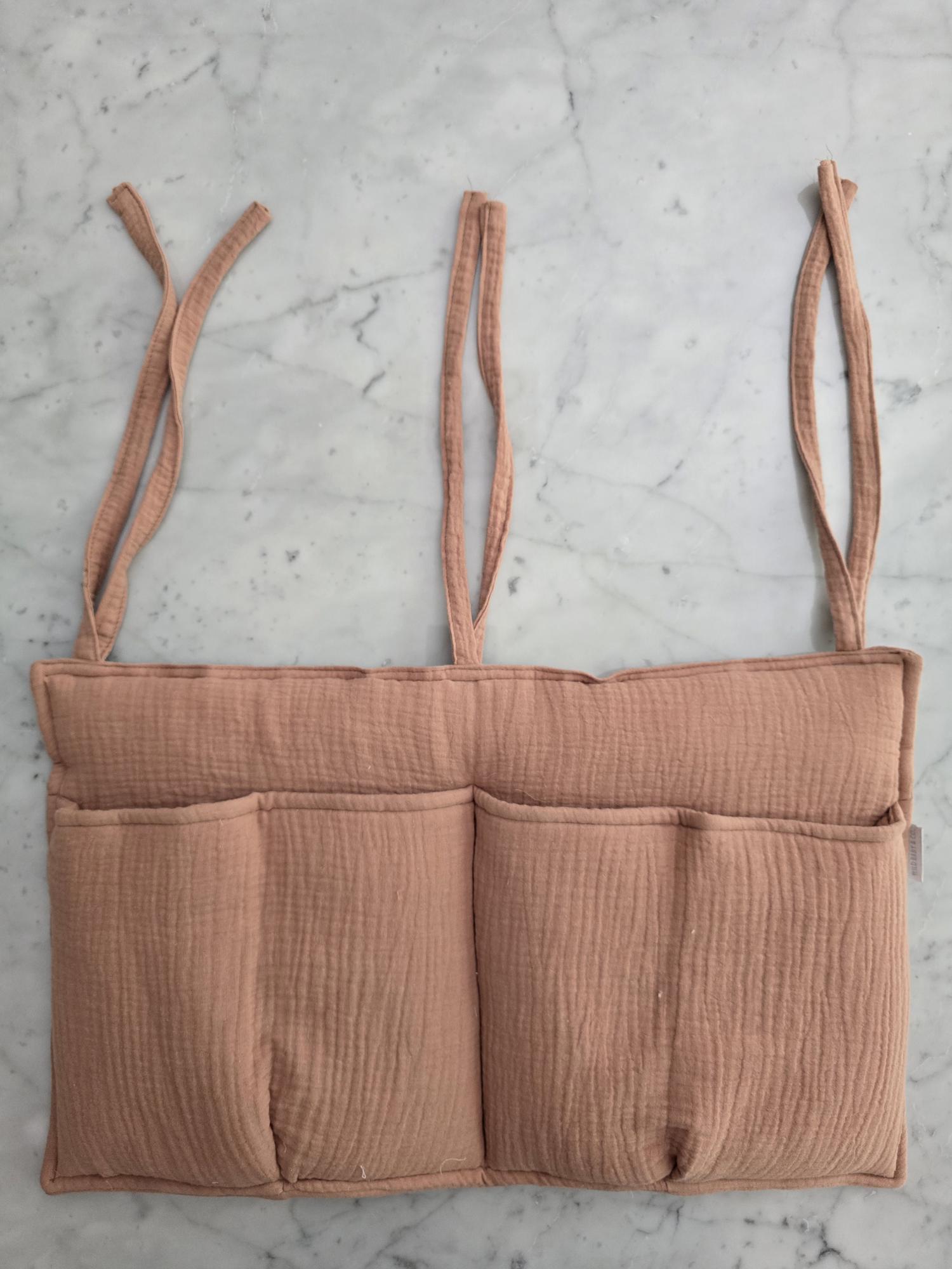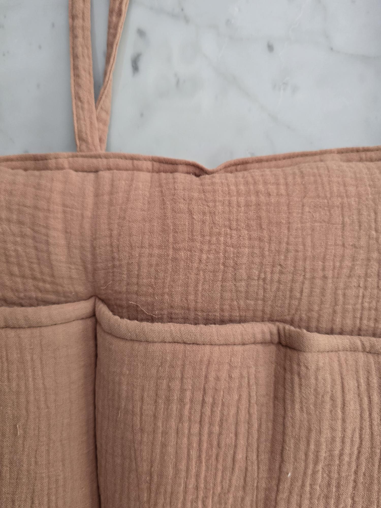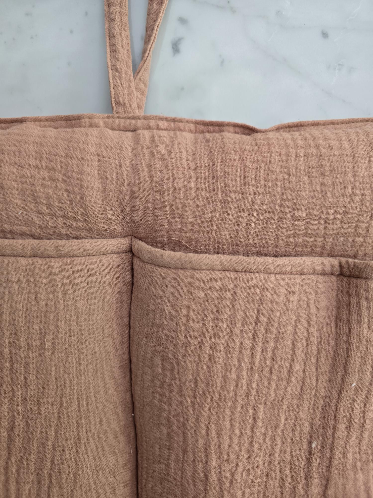 Confeccionado en 100% algodón, este bolsillero es una pieza funcional que aporta calidez y equilibrio visual al espacio del bebé. Ideal para mantener pañales, chupetes, juguetes pequeños o babitas siempre al alcance, sin resignar estética.