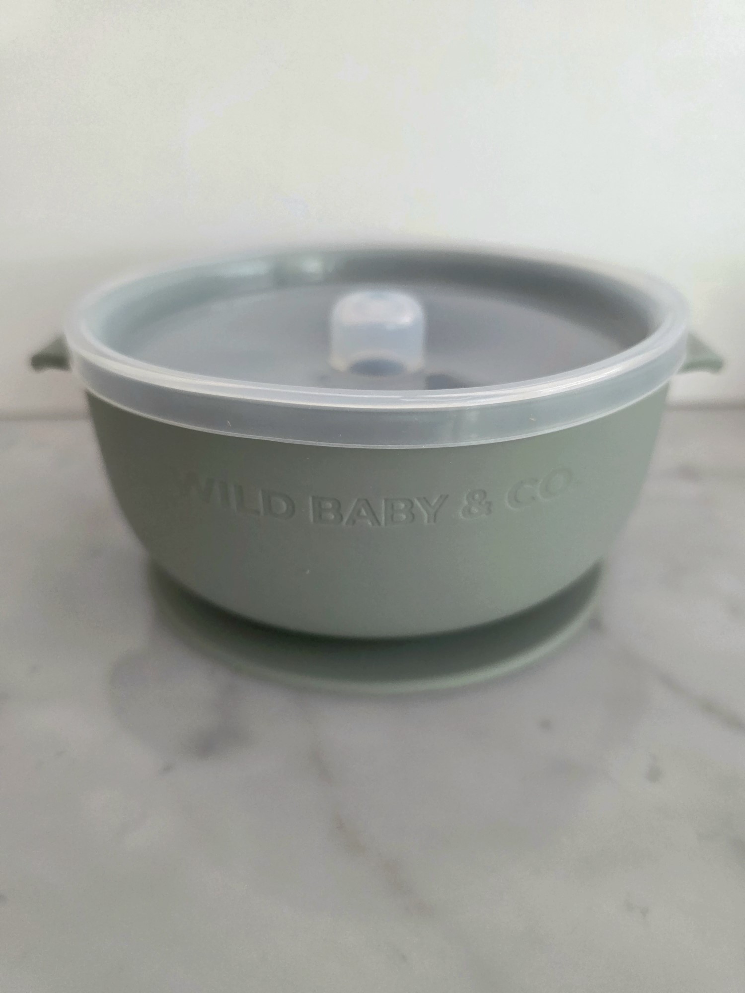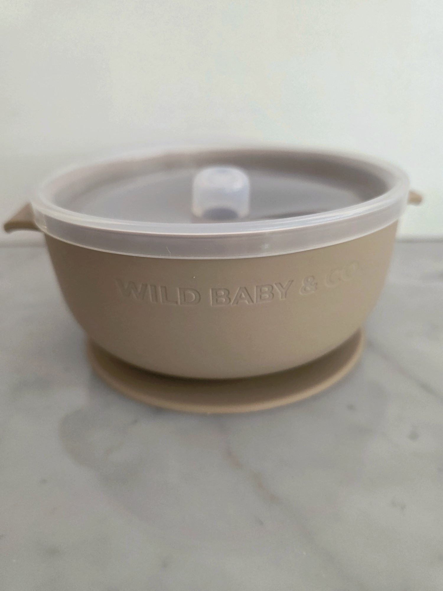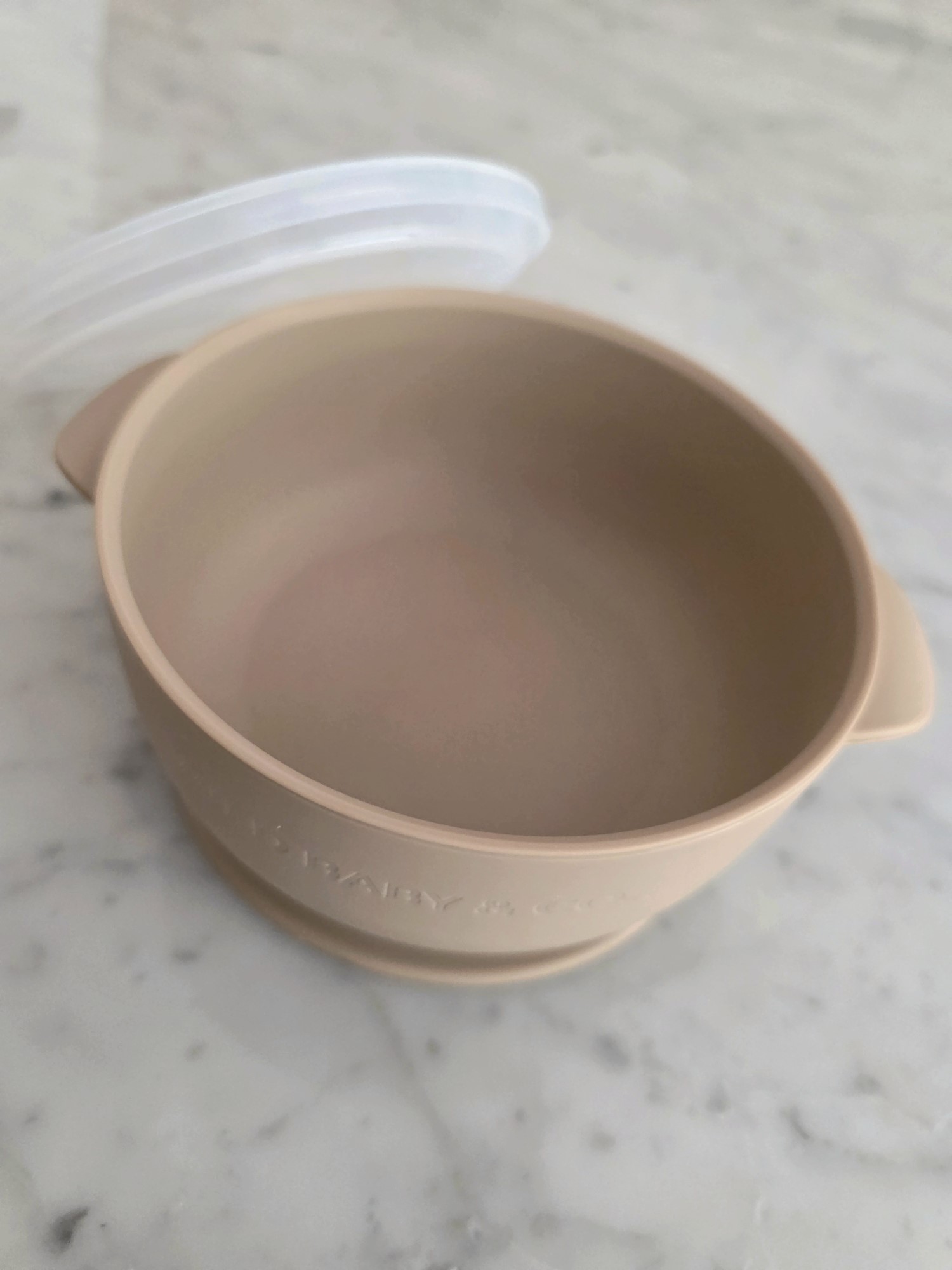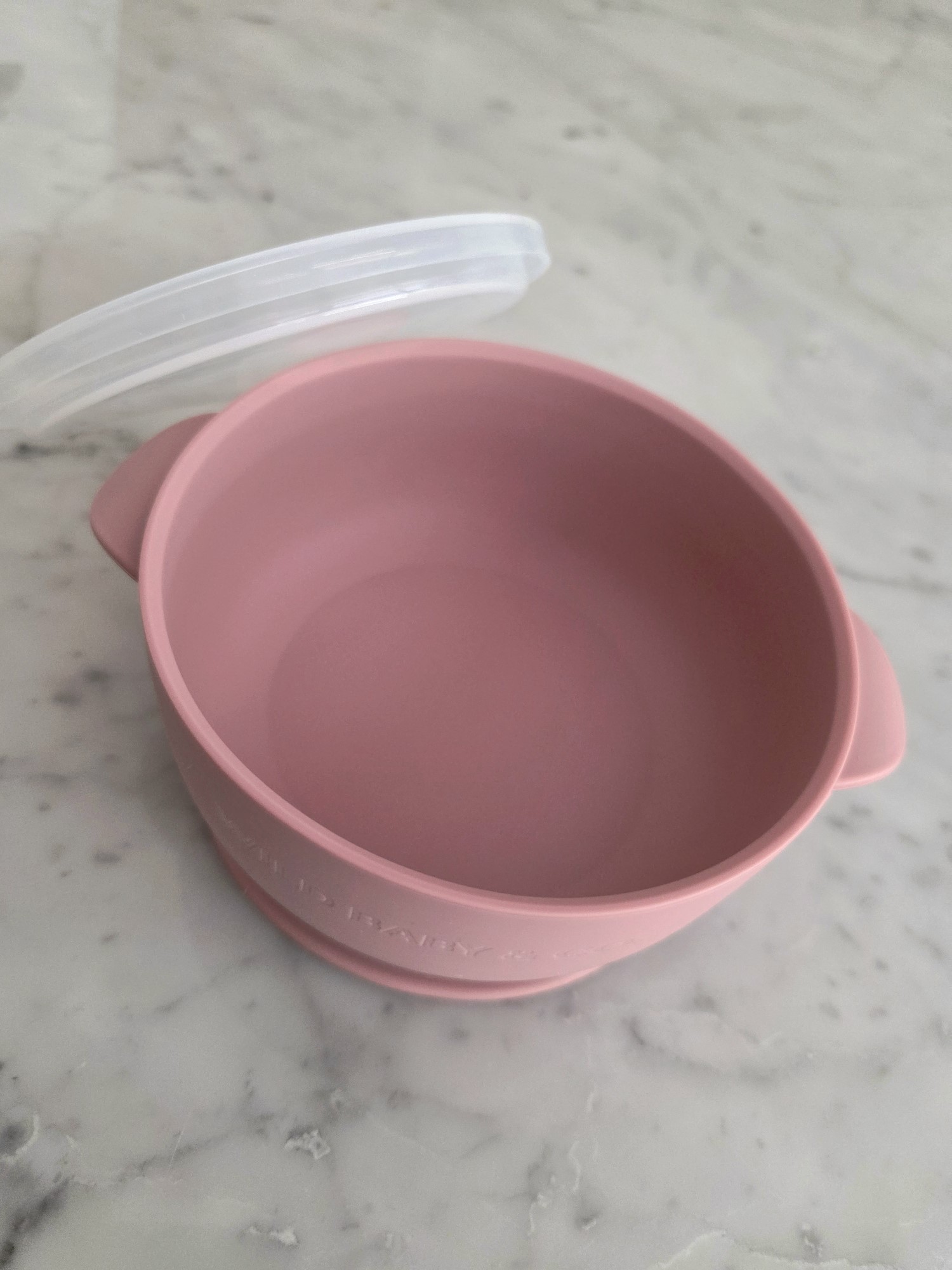 Bowl de silicona antivuelco con tapa, diseñado especialmente para acompañar las comidas del bebé con practicidad, seguridad y estética.
