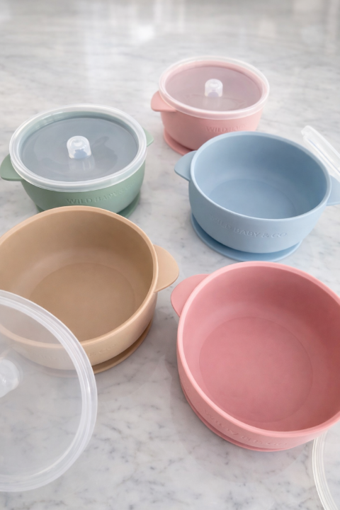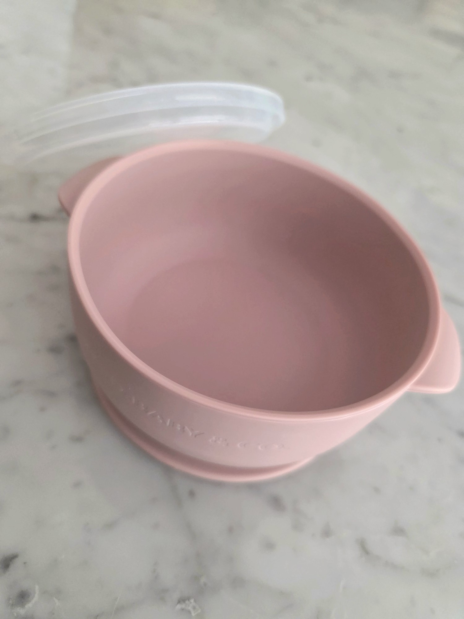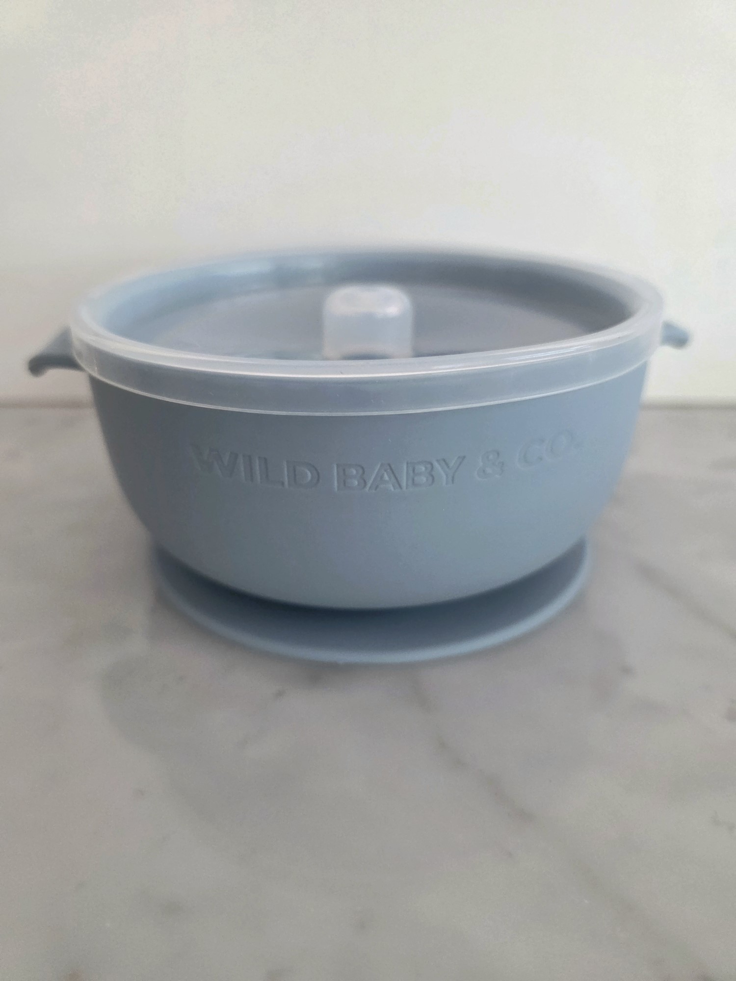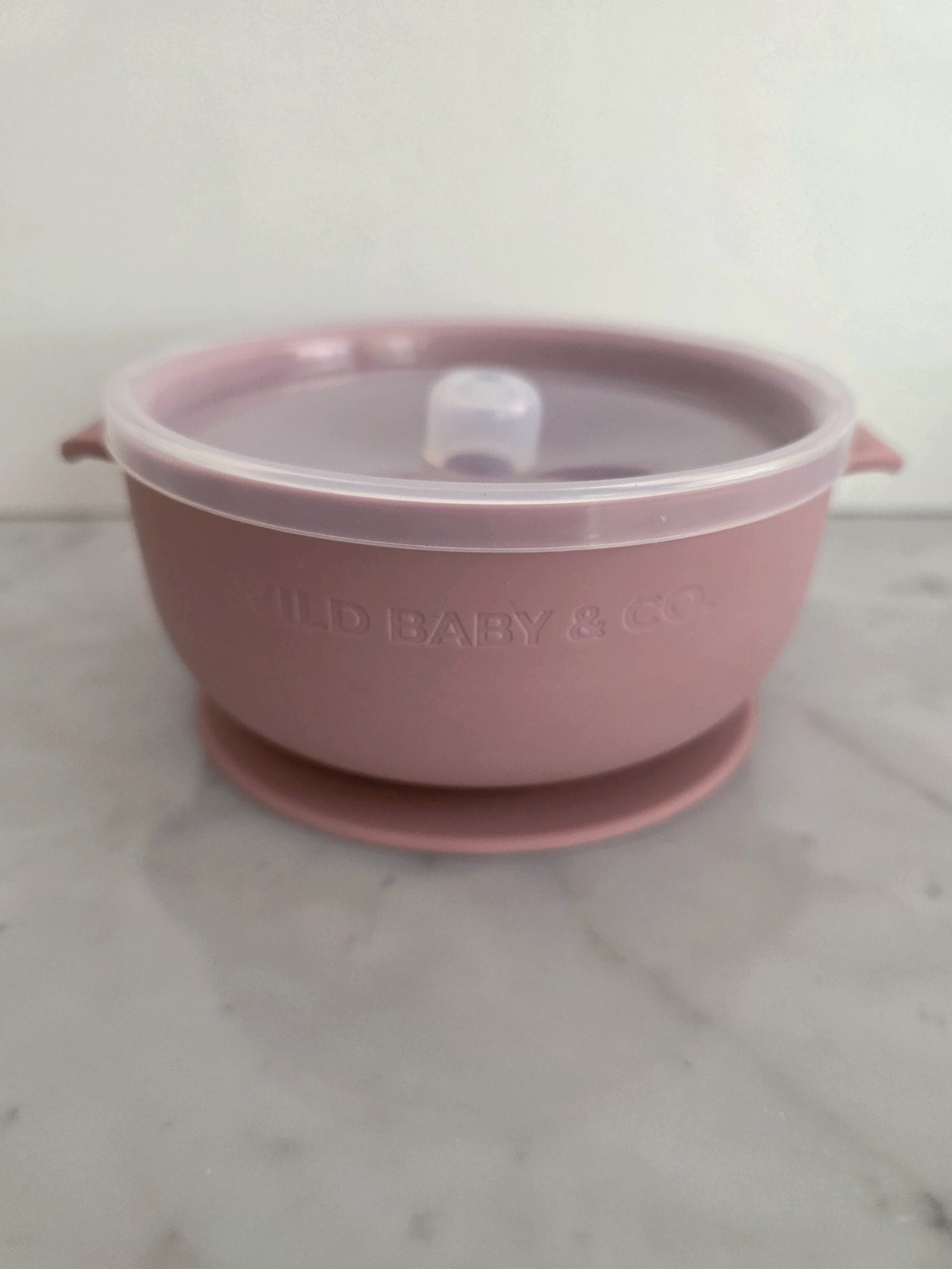 Bowl de silicona antivuelco con tapa, diseñado especialmente para acompañar las comidas del bebé con practicidad, seguridad y estética.