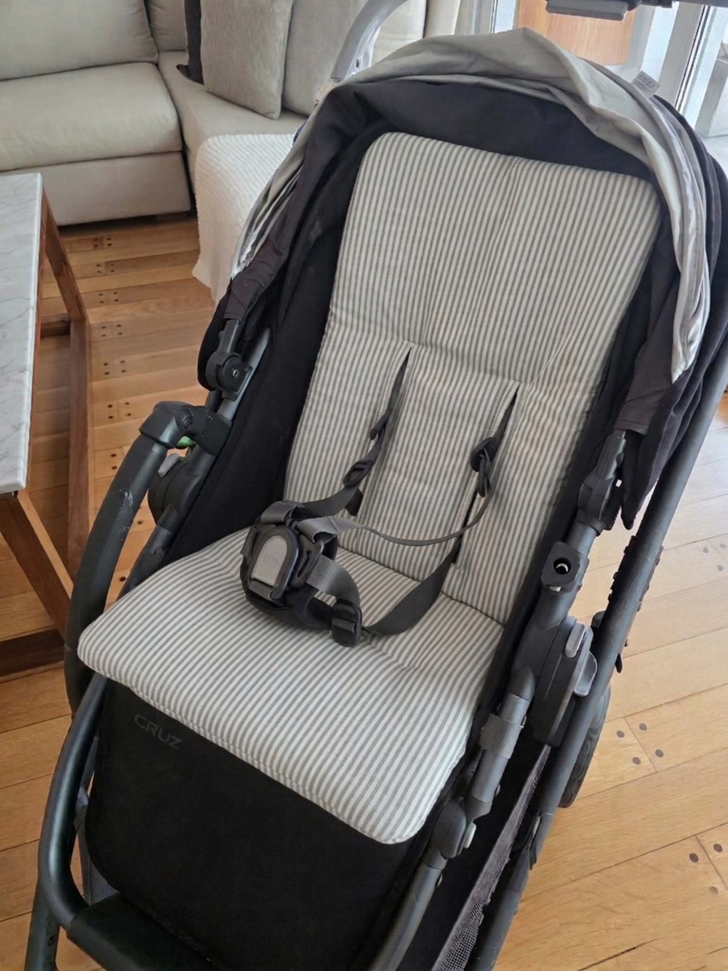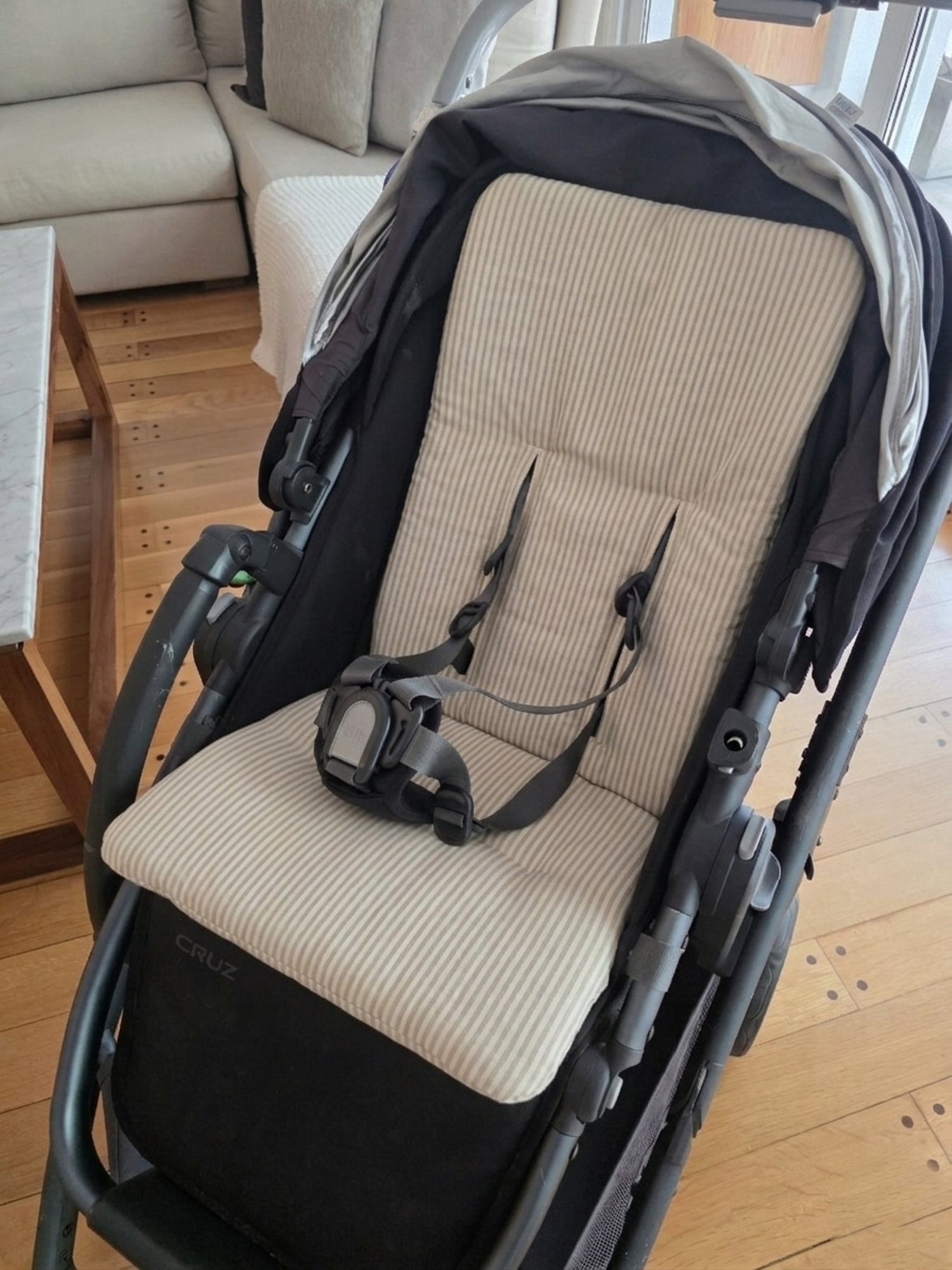 Cuenta con tres ojales universales, amplios y reforzados, que permiten pasar las tiras de agarre y colocar el cinturón sin necesidad de desengancharlo del respaldo del cochecito.