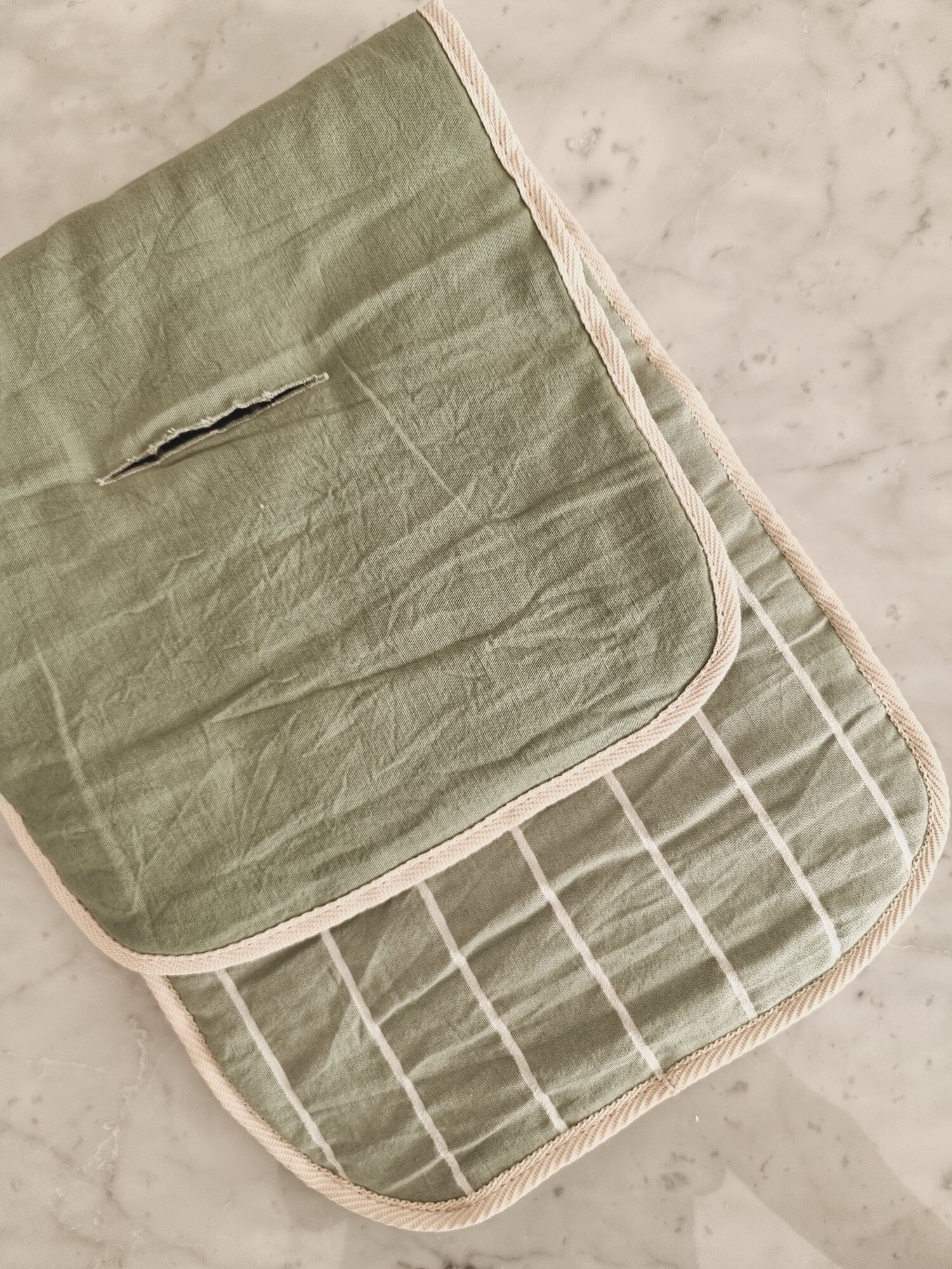 Cuenta con tres ojales universales, amplios y reforzados, que permiten pasar las tiras de agarre y colocar el cinturón sin necesidad de desengancharlo del respaldo del cochecito.
