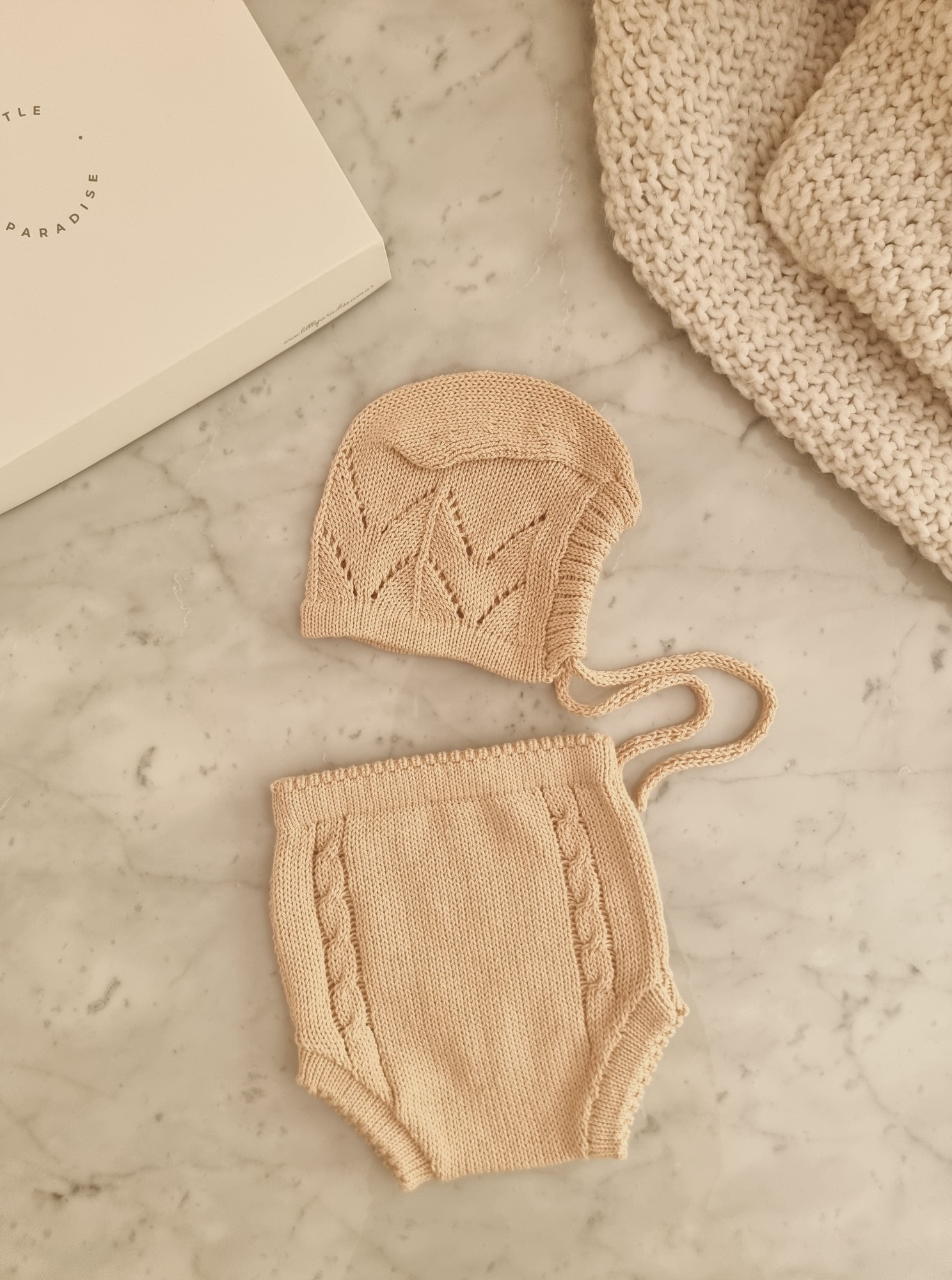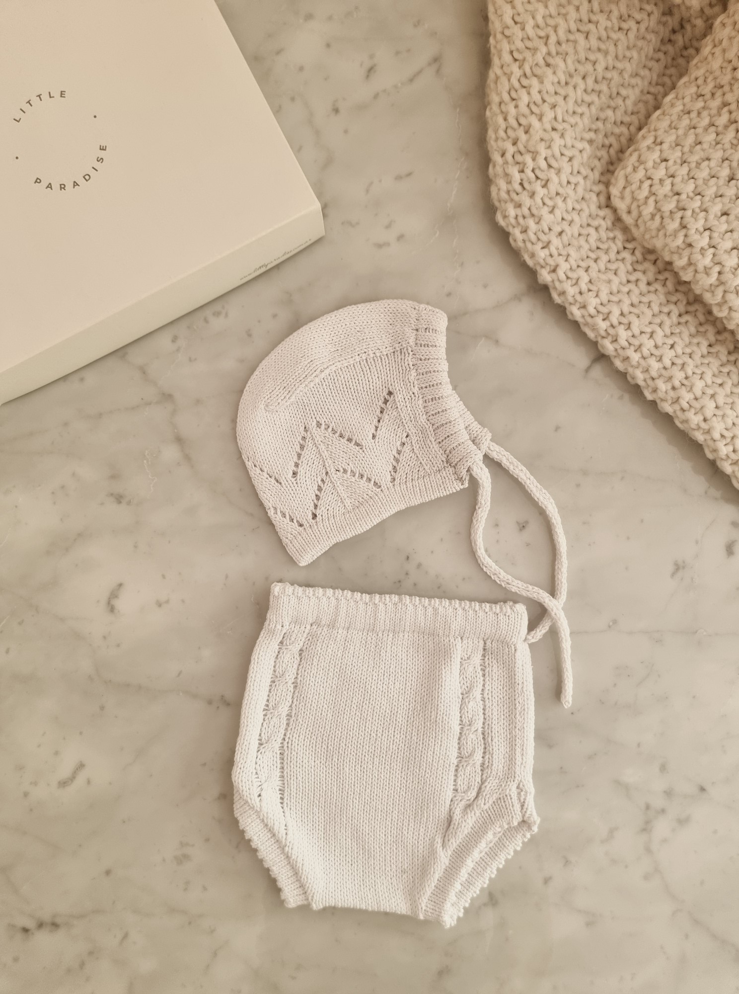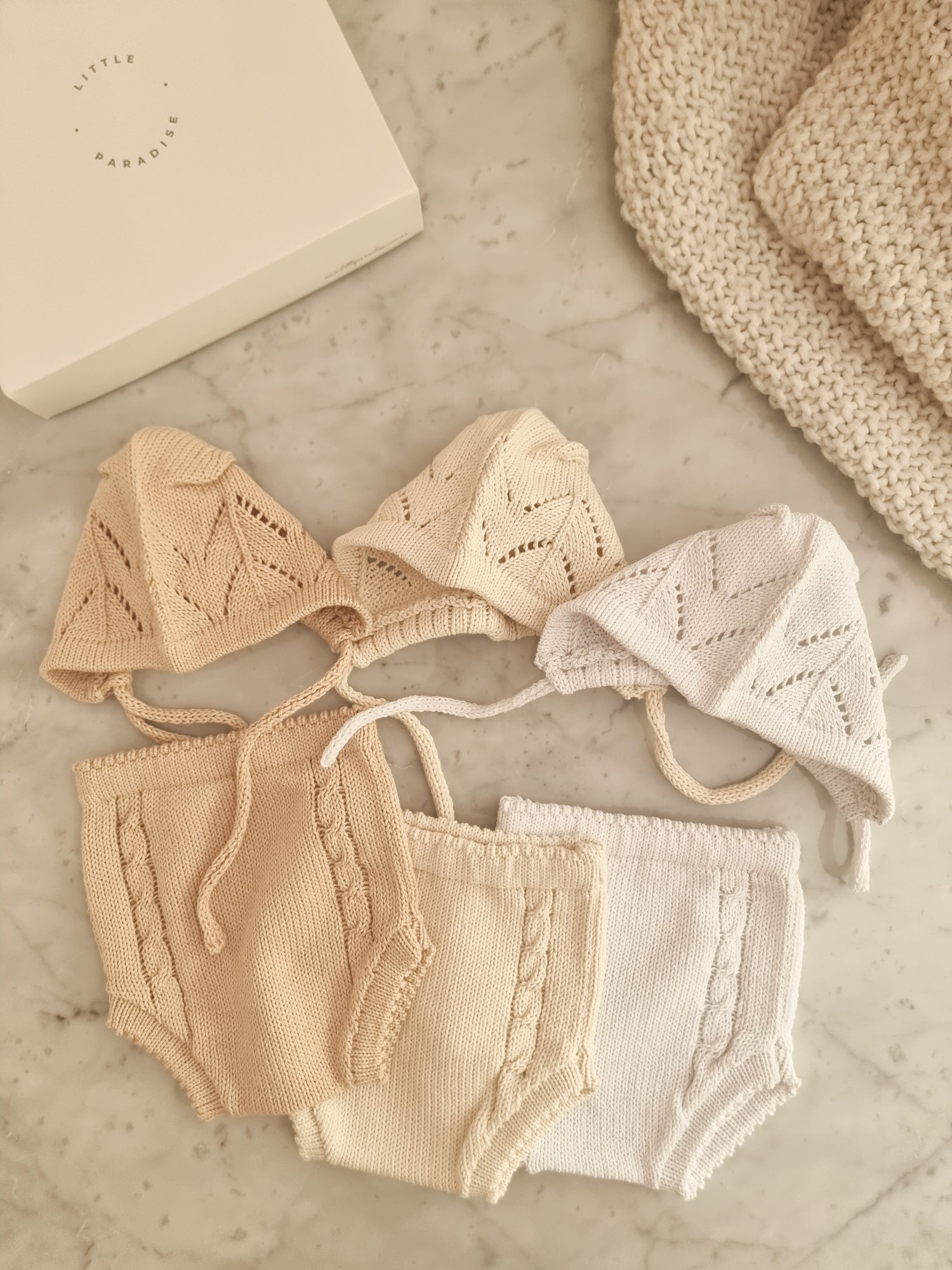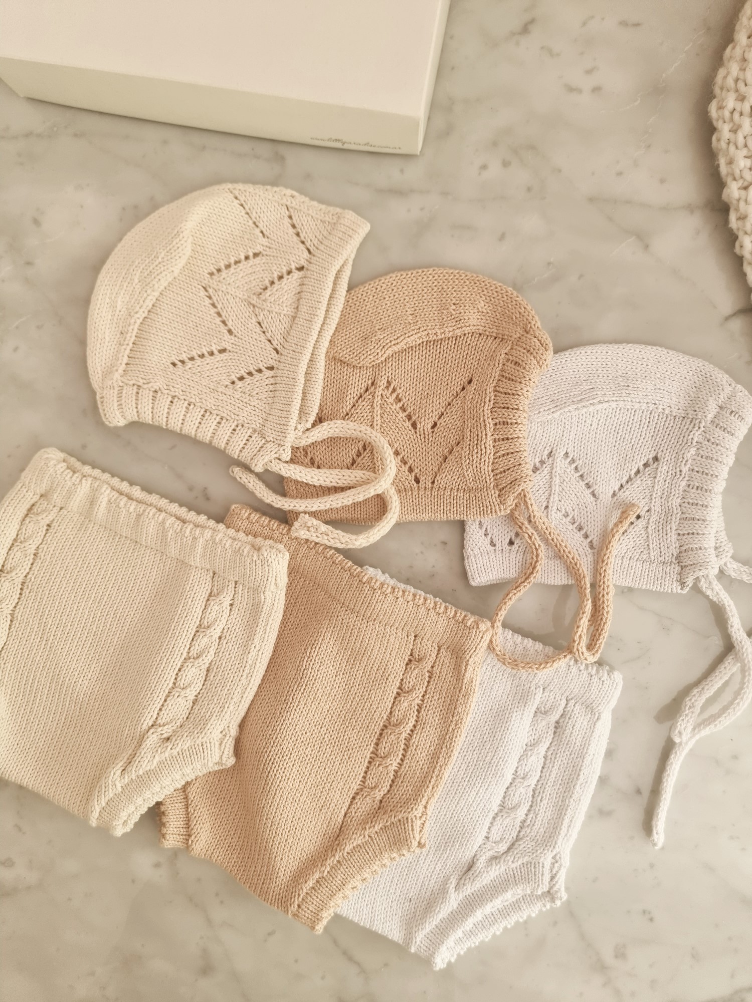 Conjunto de capota y bombachudo tejidos en hilo 100% algodón.