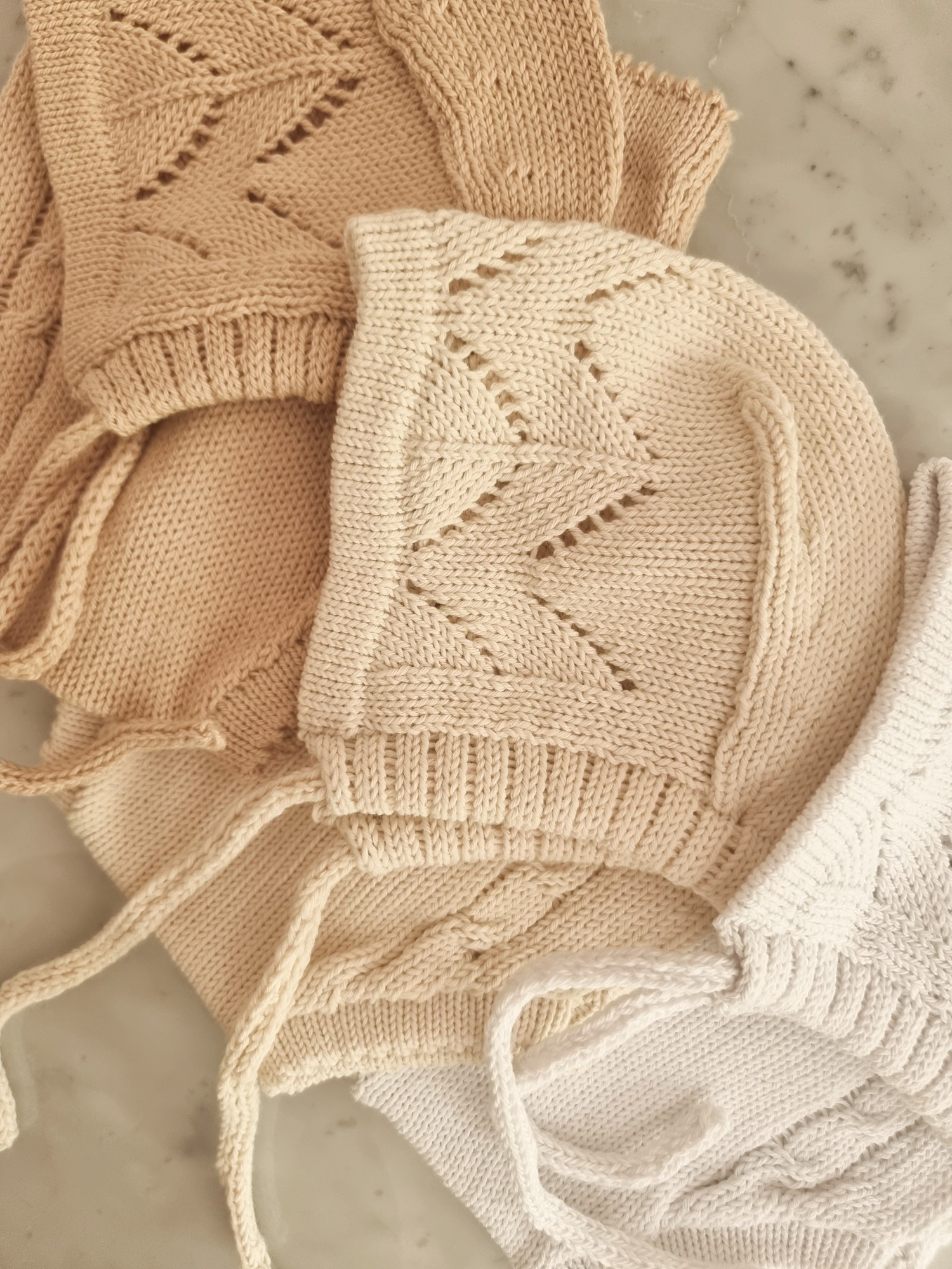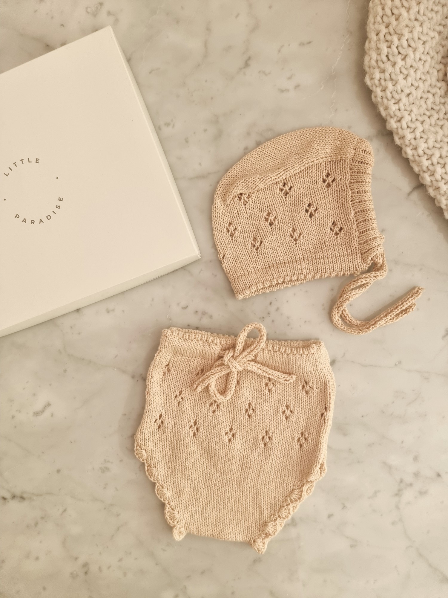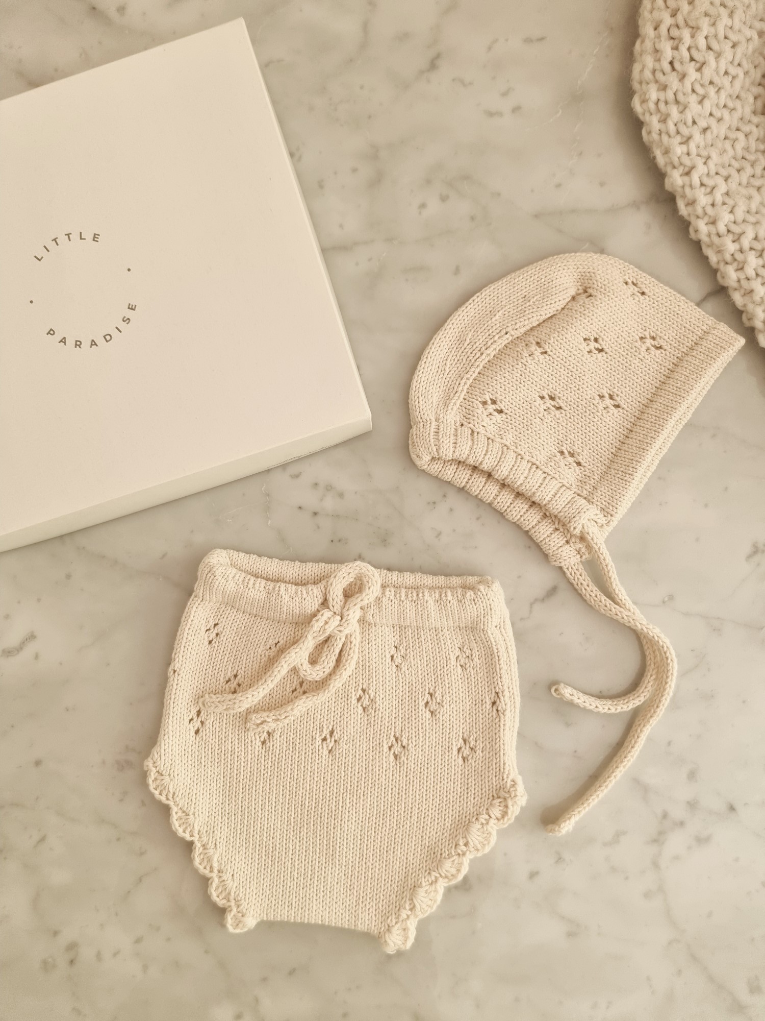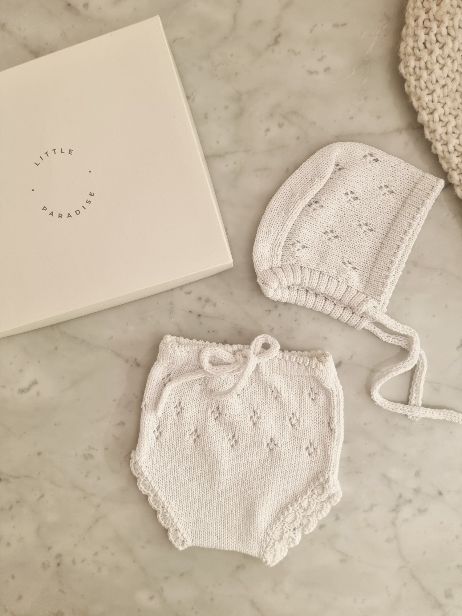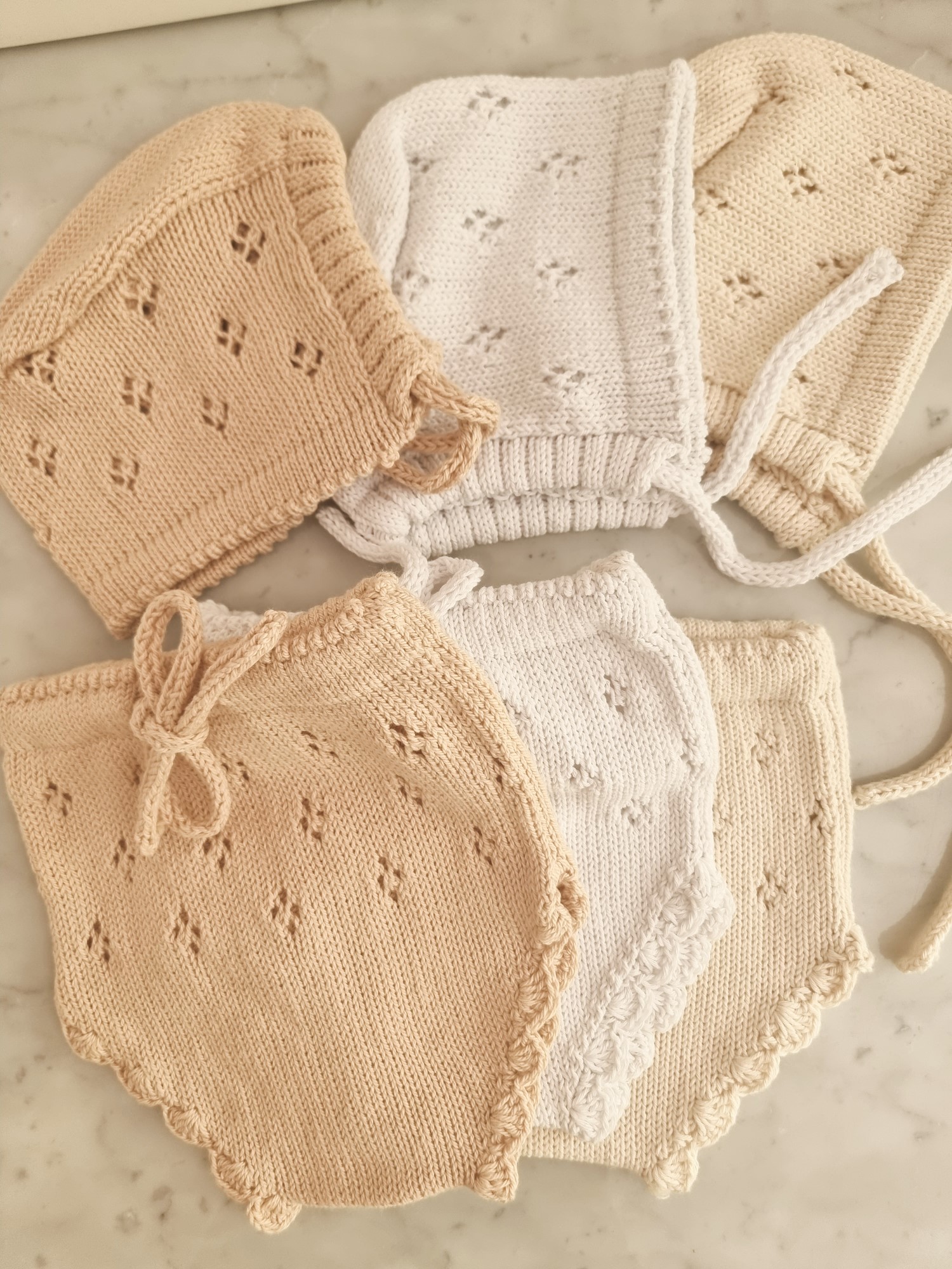 Conjunto de capota y bombachudo tejidos en hilo 100% algodón.