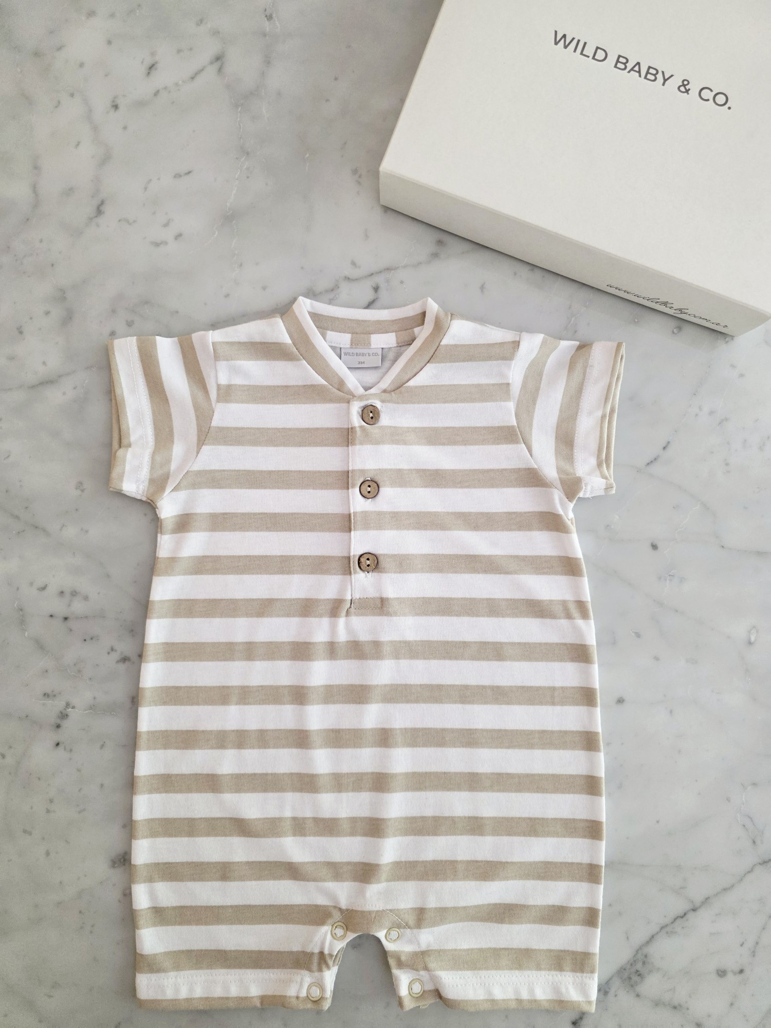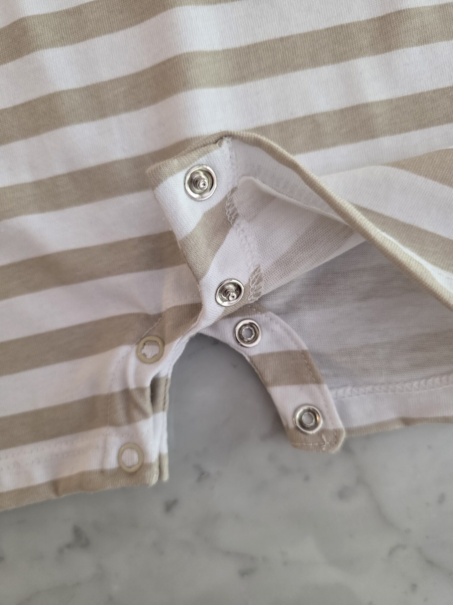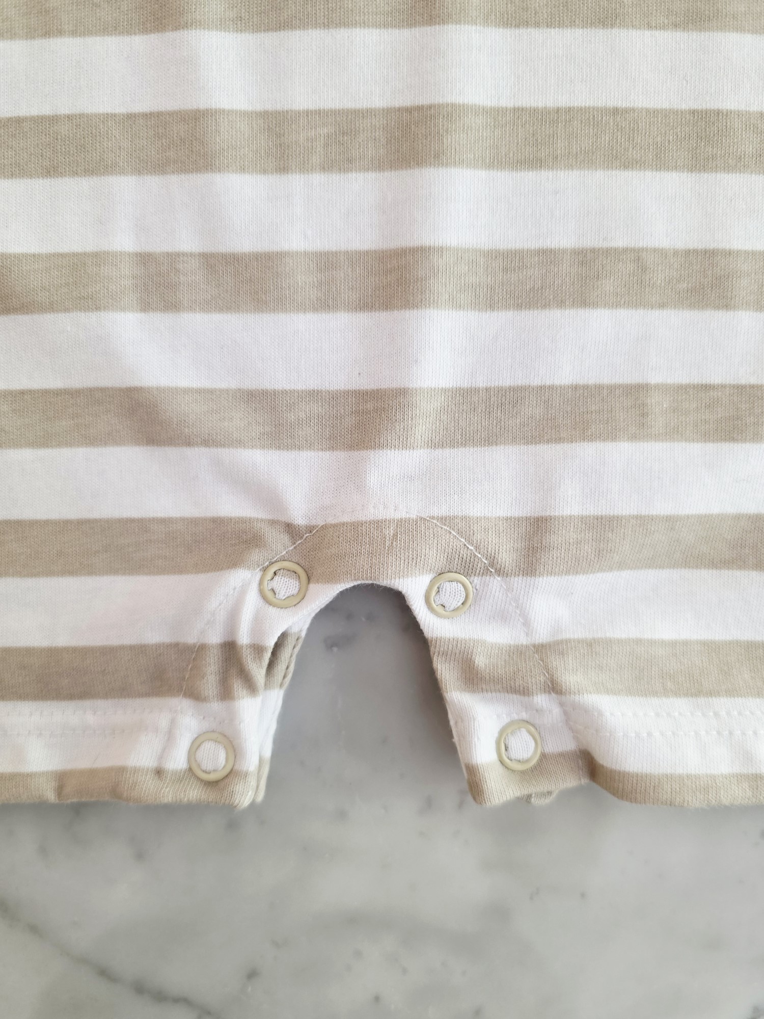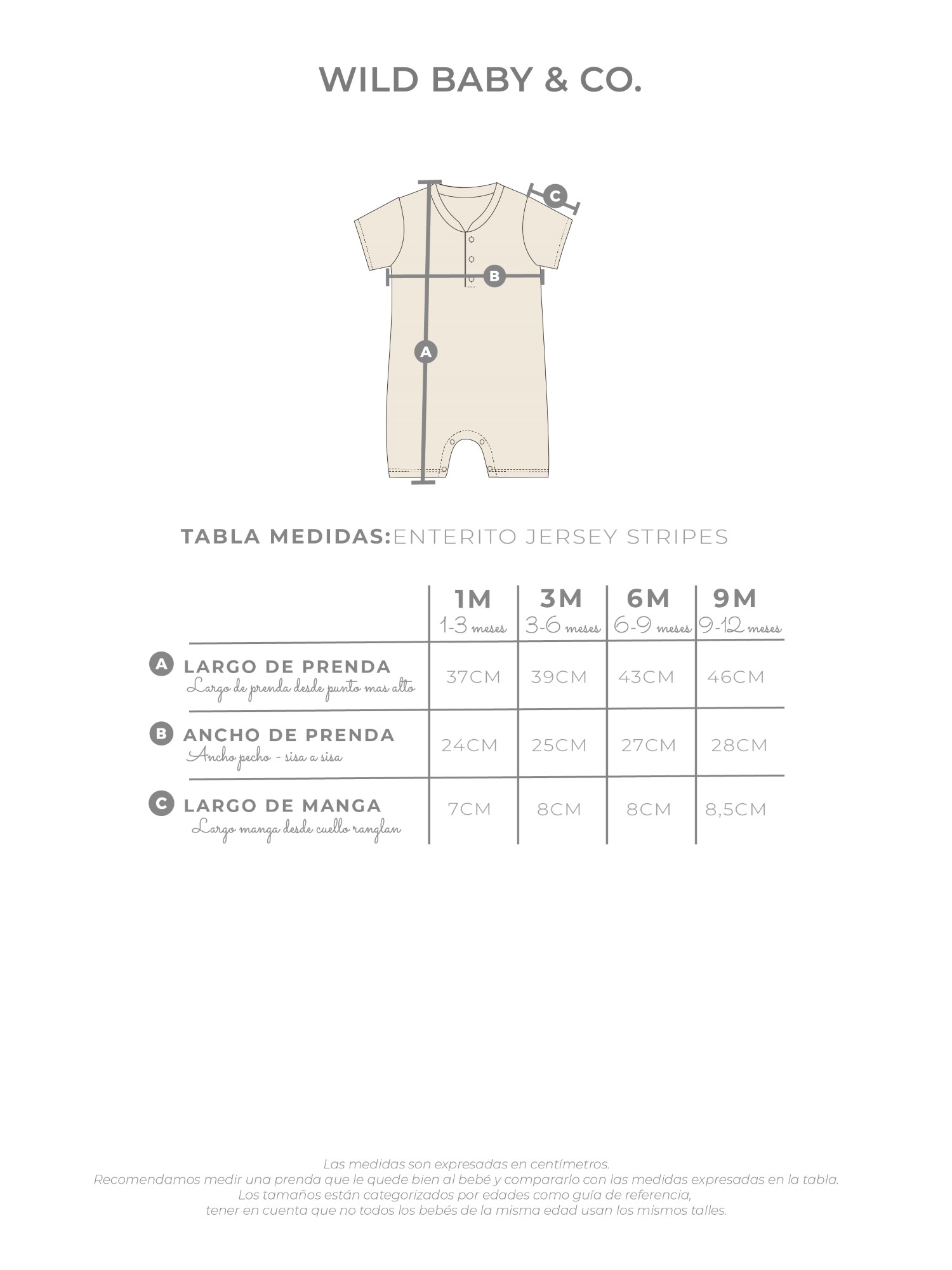 Enterito confeccionado en jersey 100% algodón. Presenta un cuello redondo limpio, manga corta y una cartera con botones de coco que suma un detalle natural y discreto 🌿.