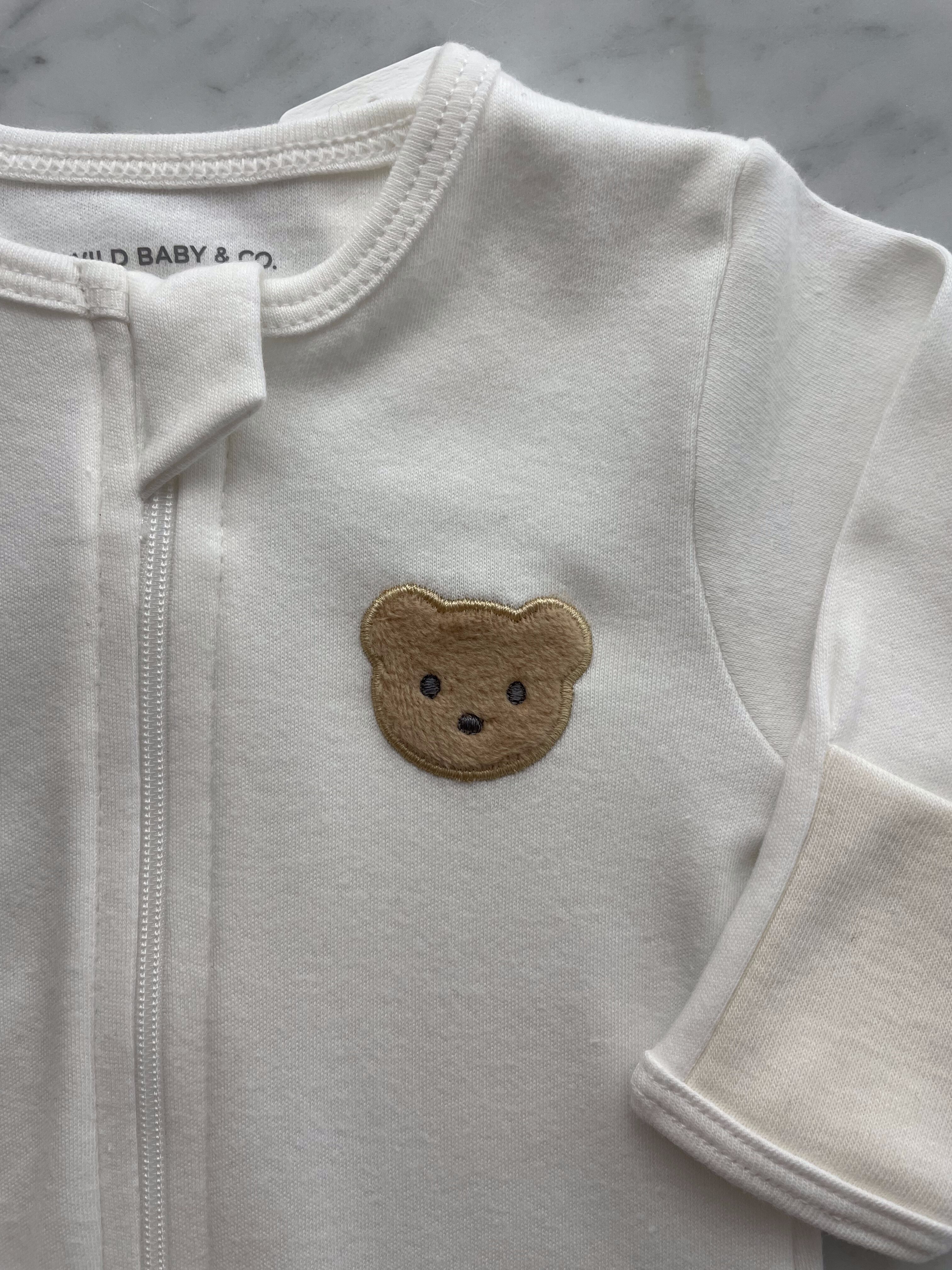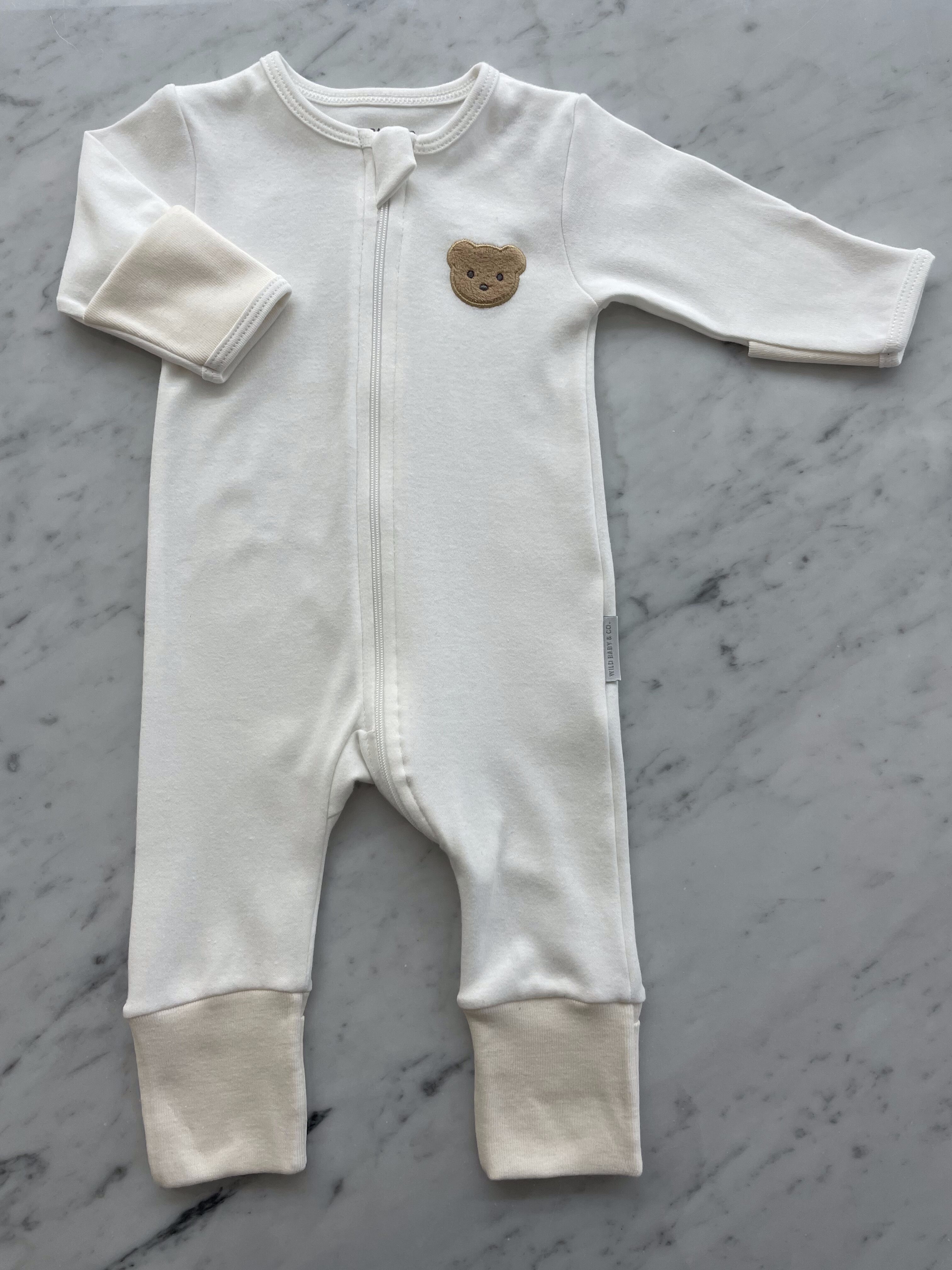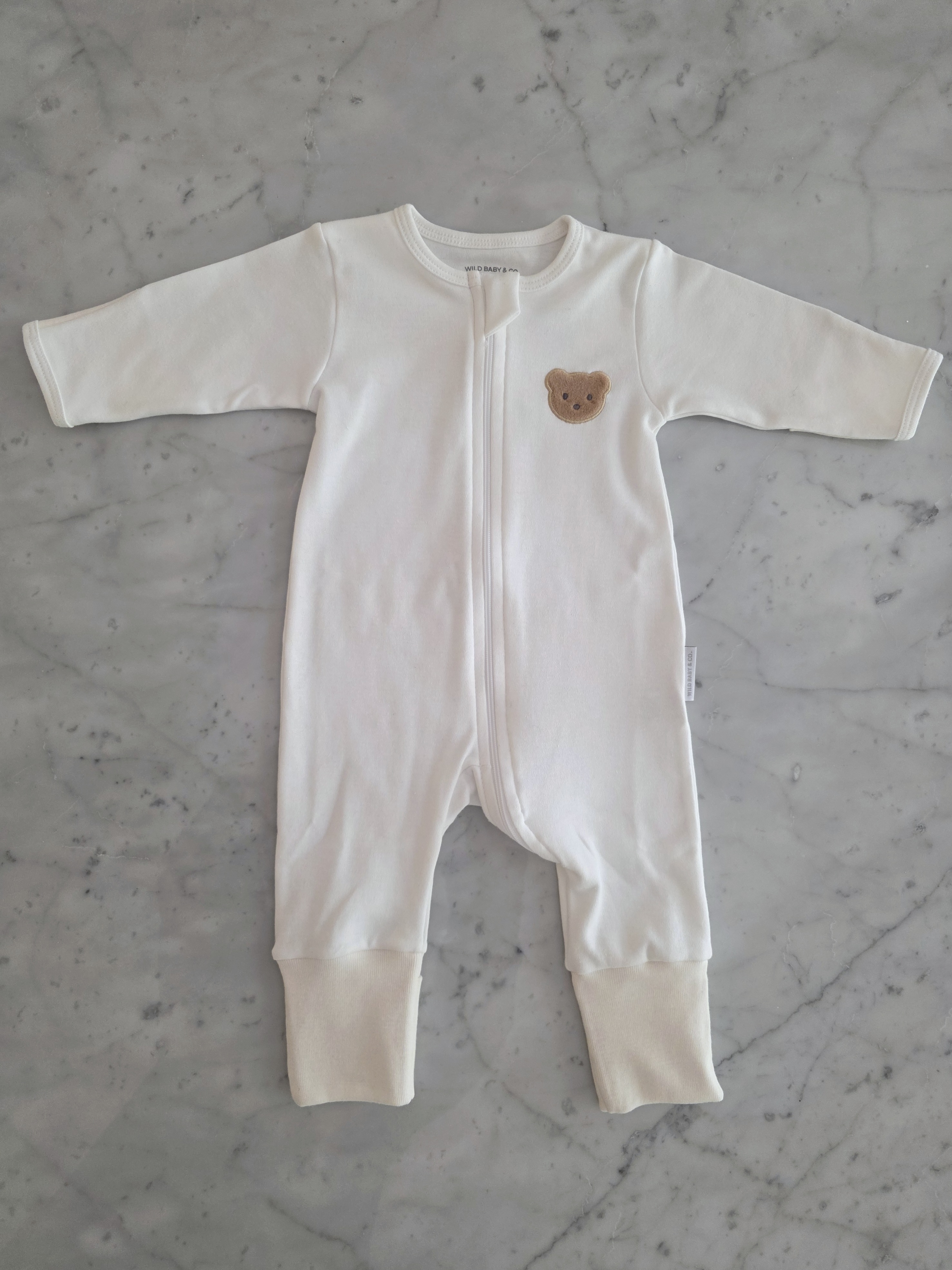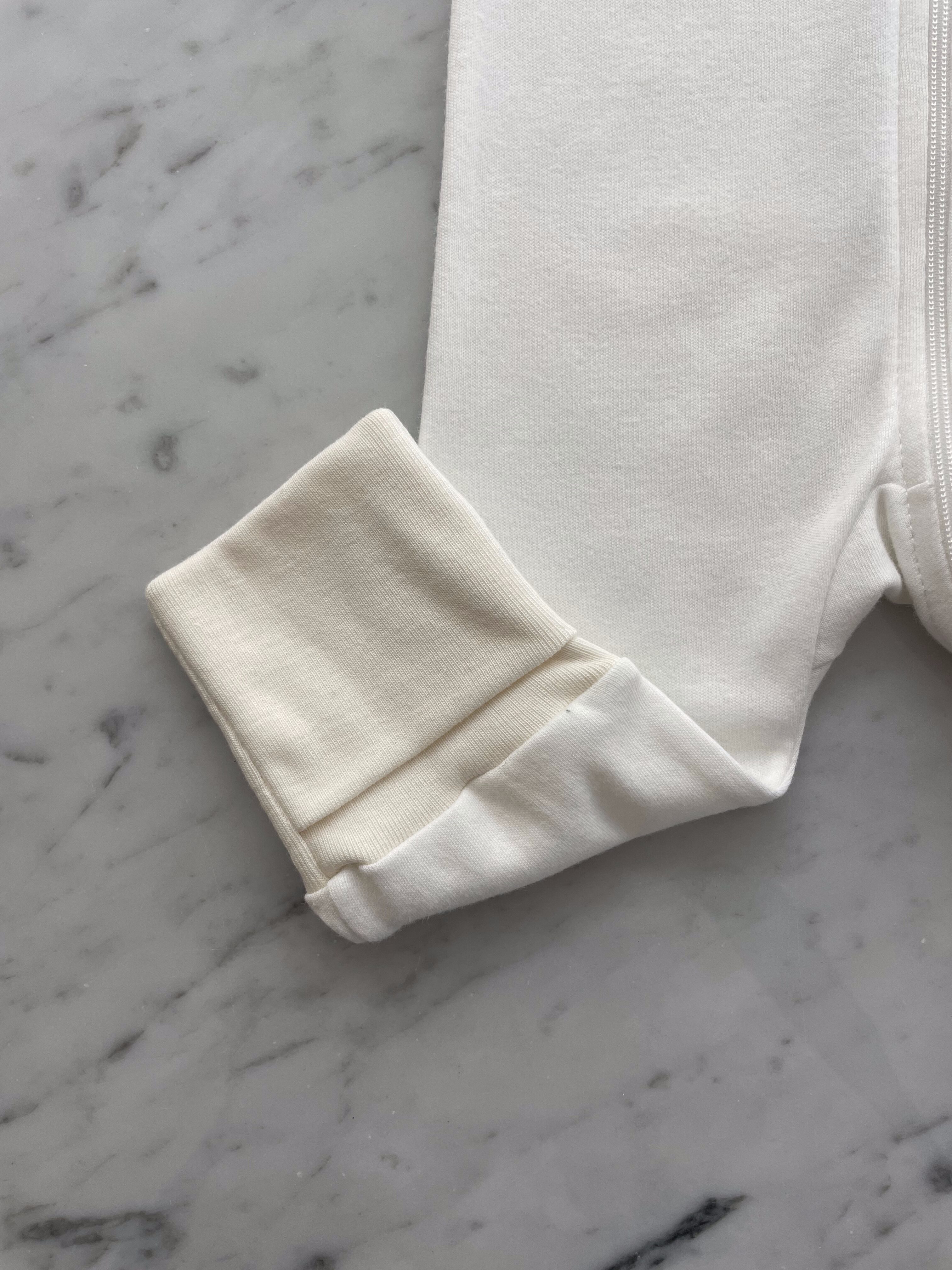 Mangas largas y pies incorporados, con cubrepies en los puños.
