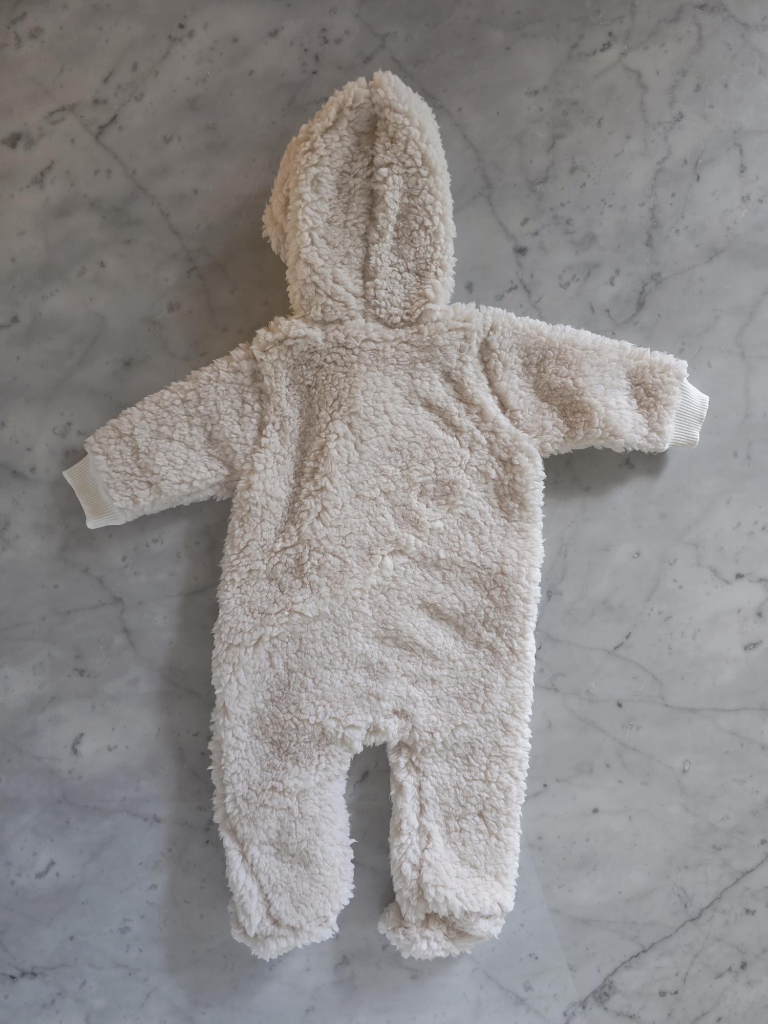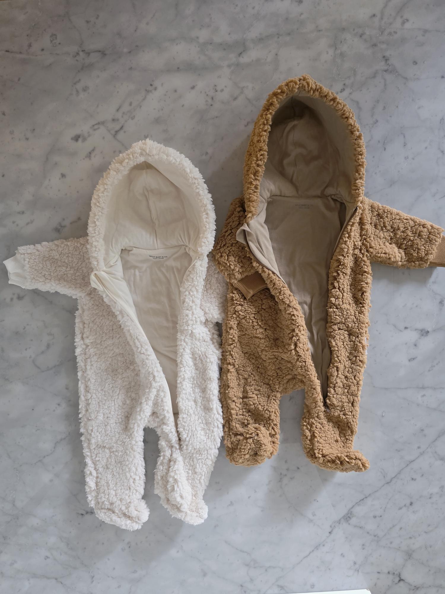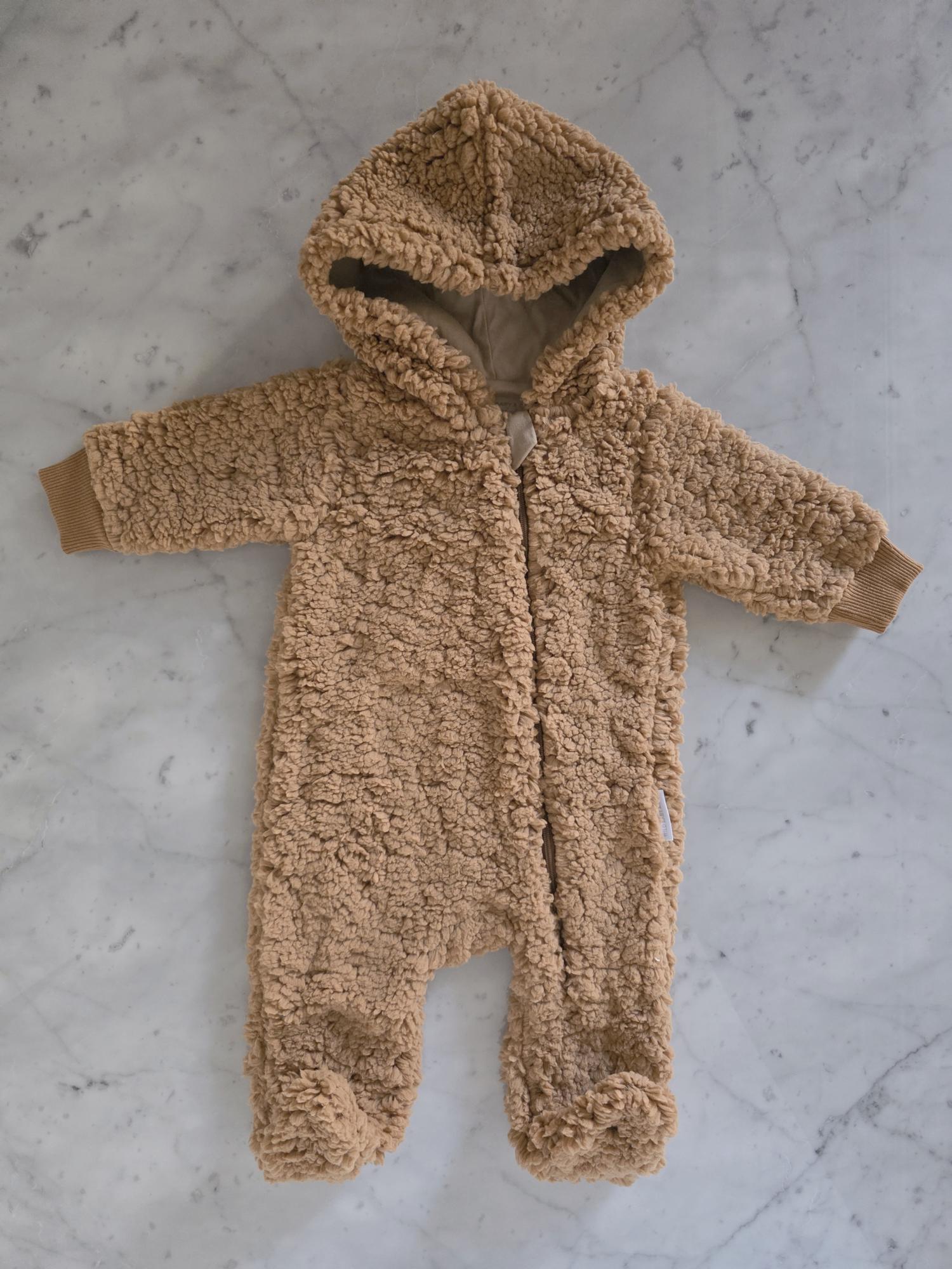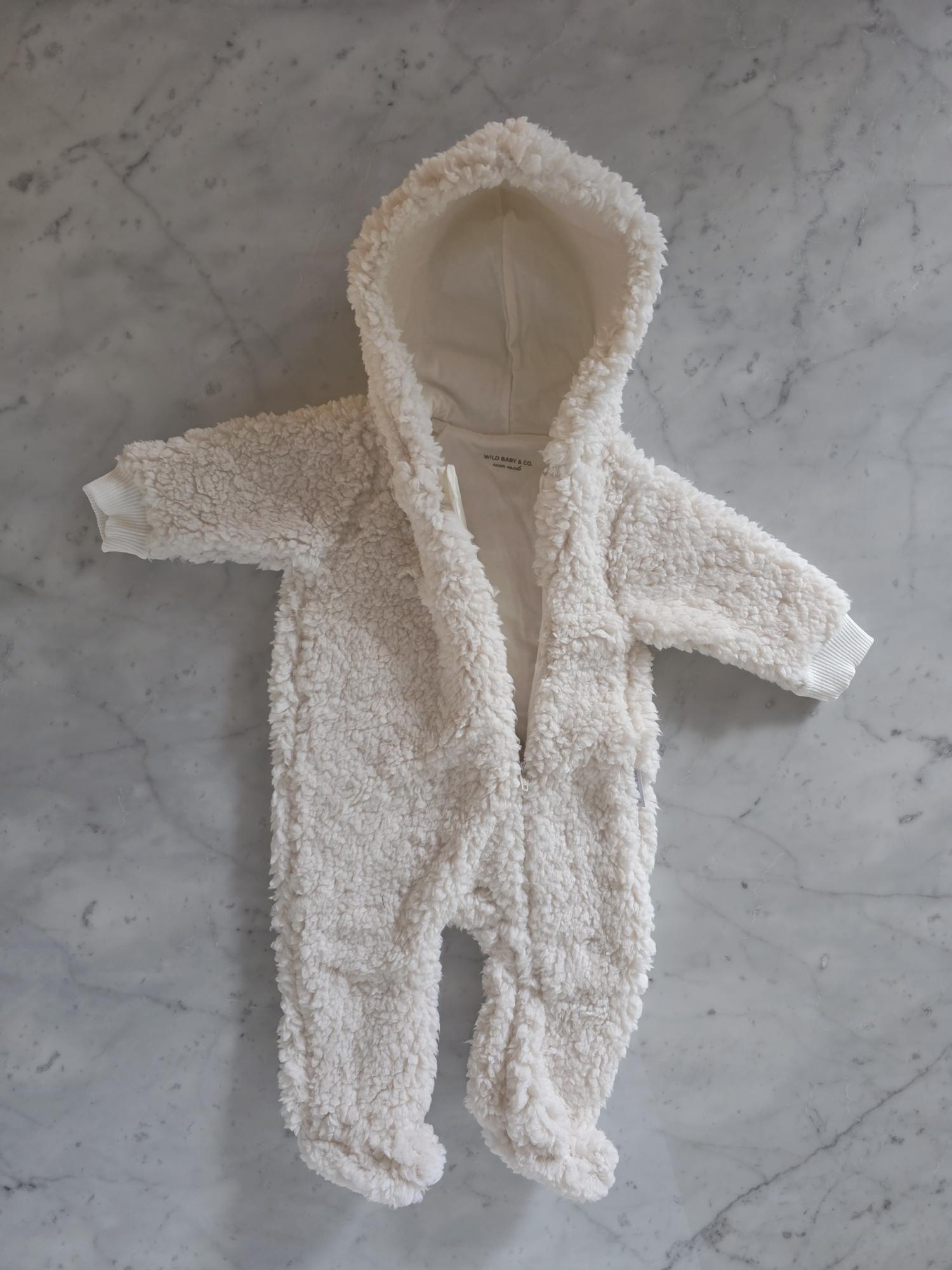 Enterito con capucha confeccionado en corderito sherpa: abrigo, suavidad y ternura en una sola prenda.