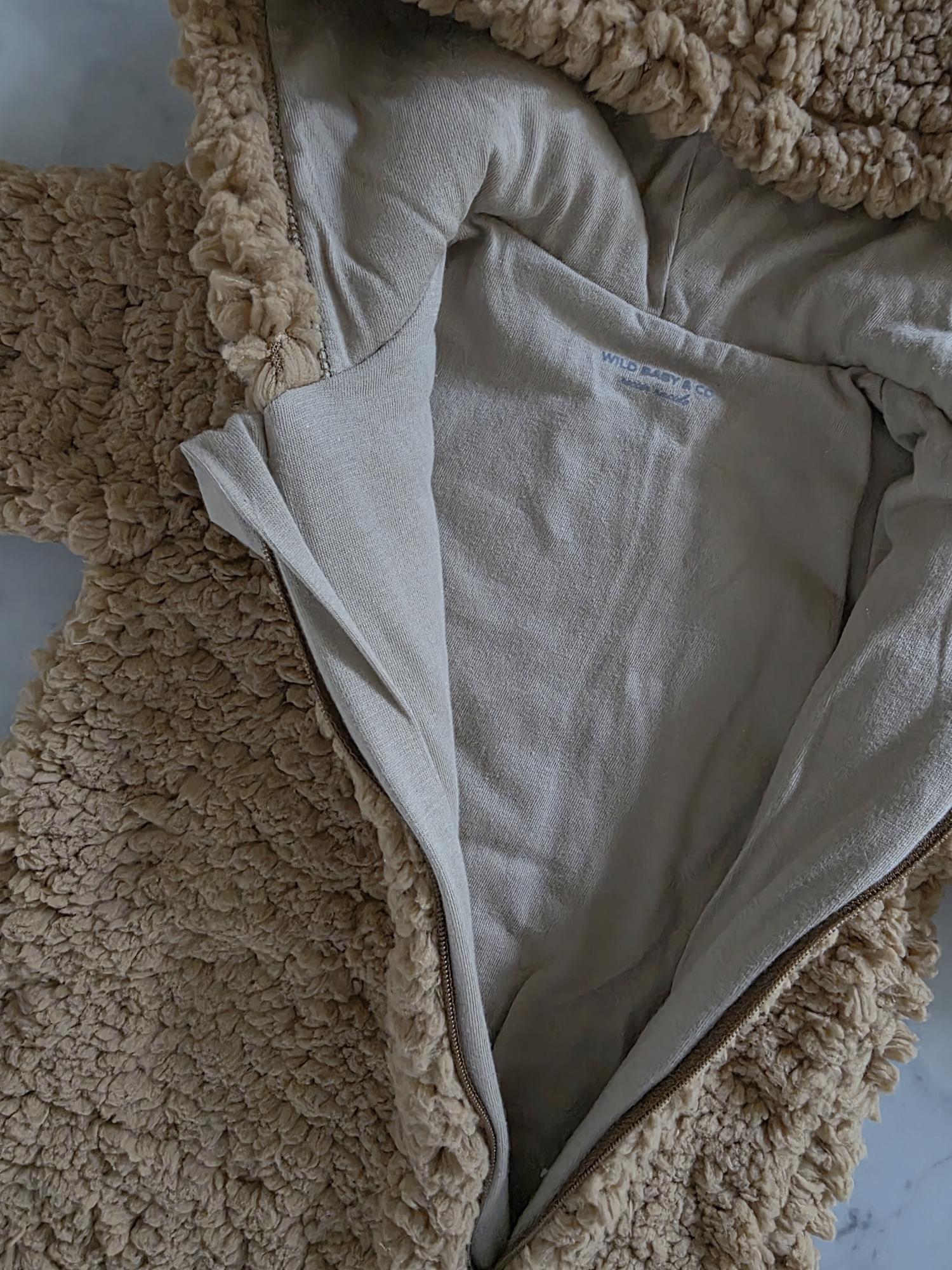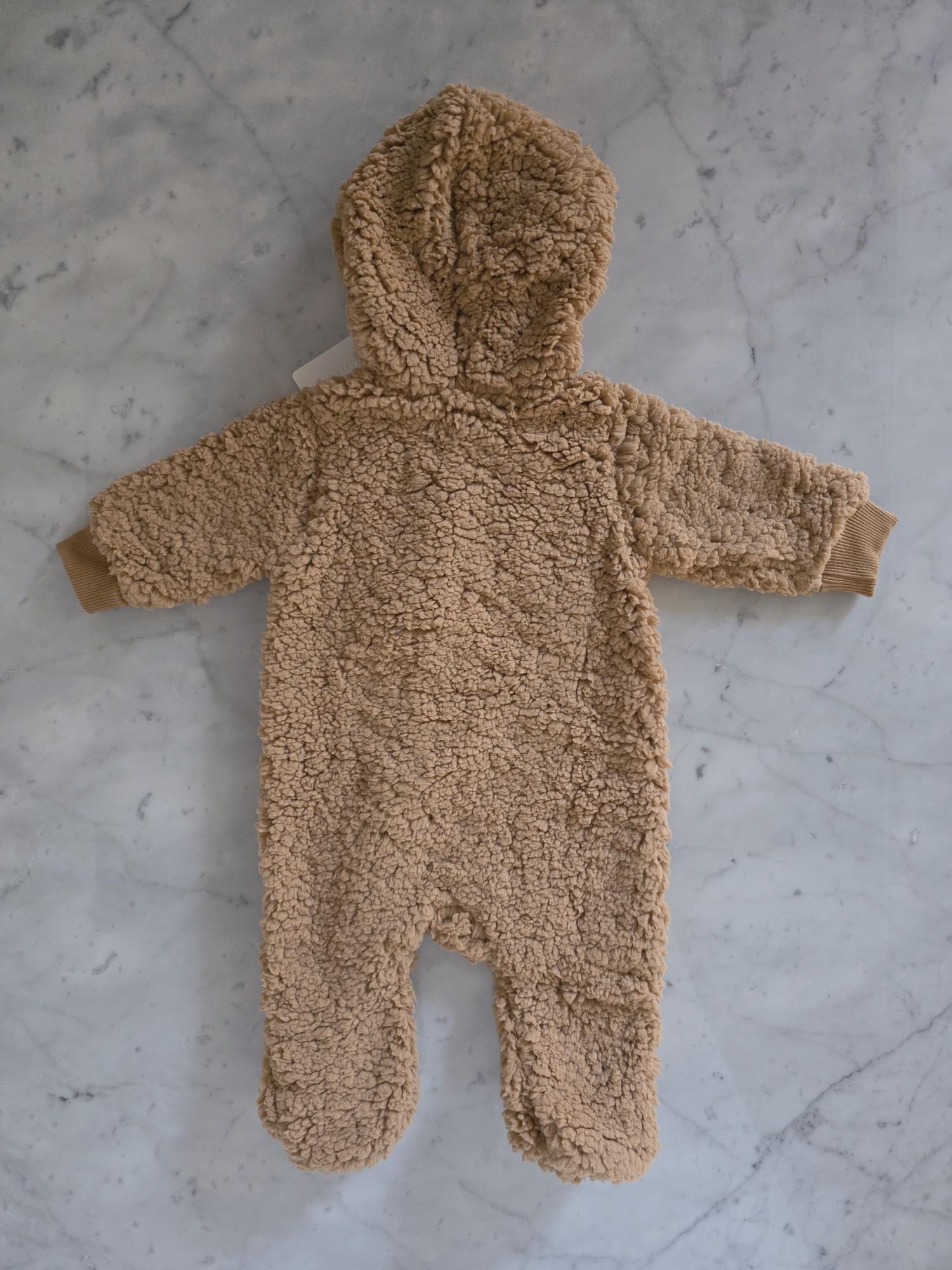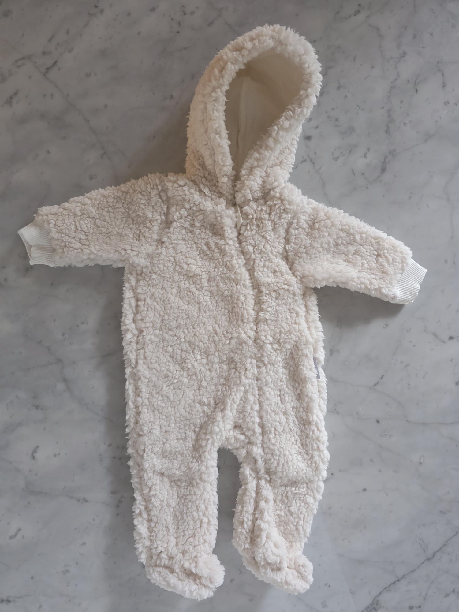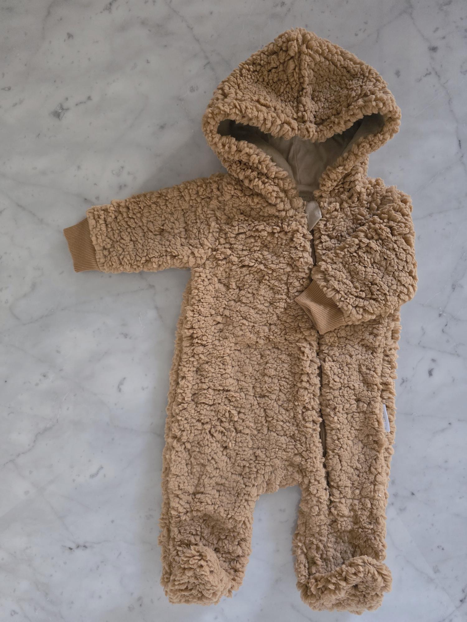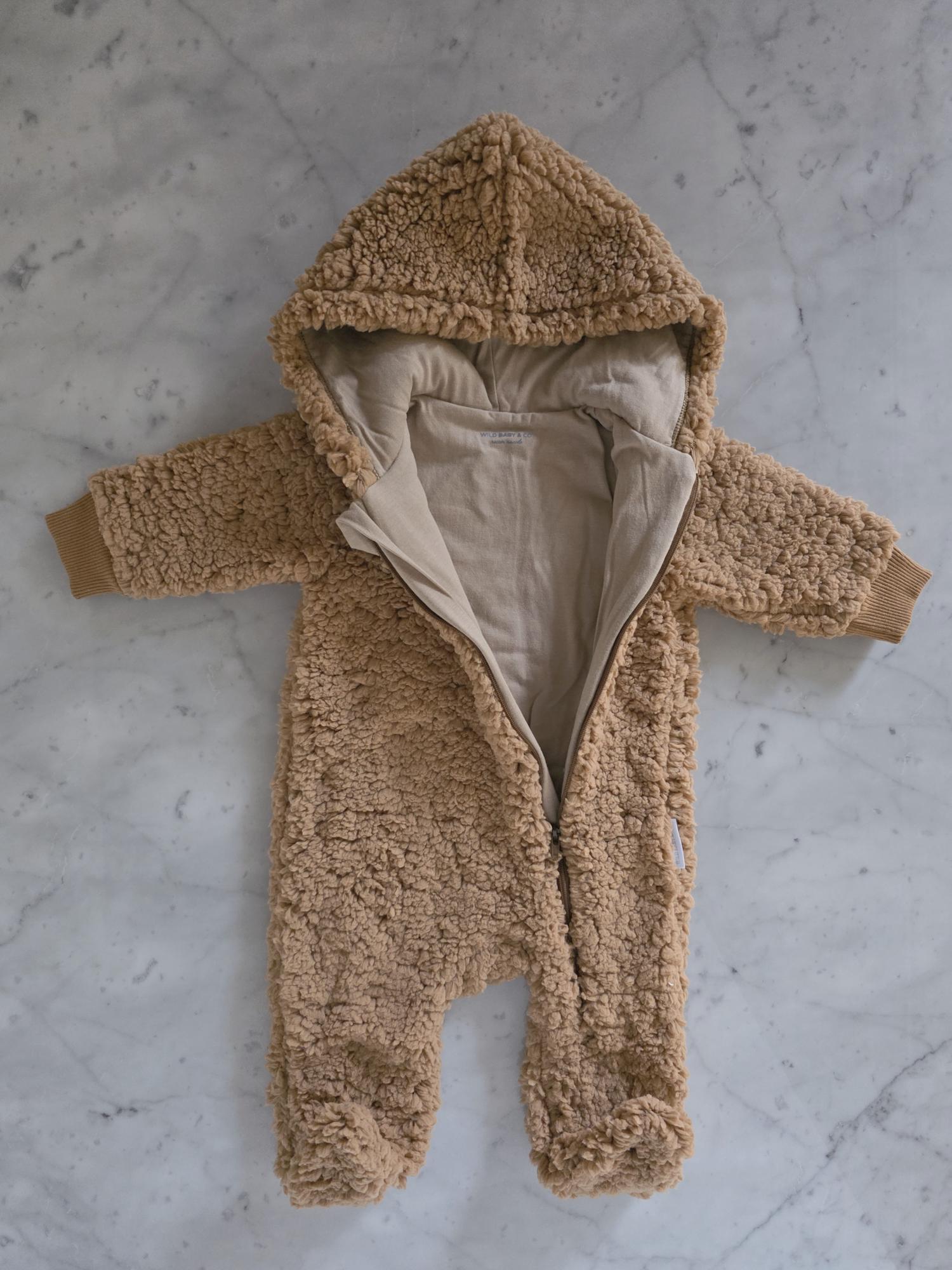 Enterito con capucha confeccionado en corderito sherpa: abrigo, suavidad y ternura en una sola prenda.