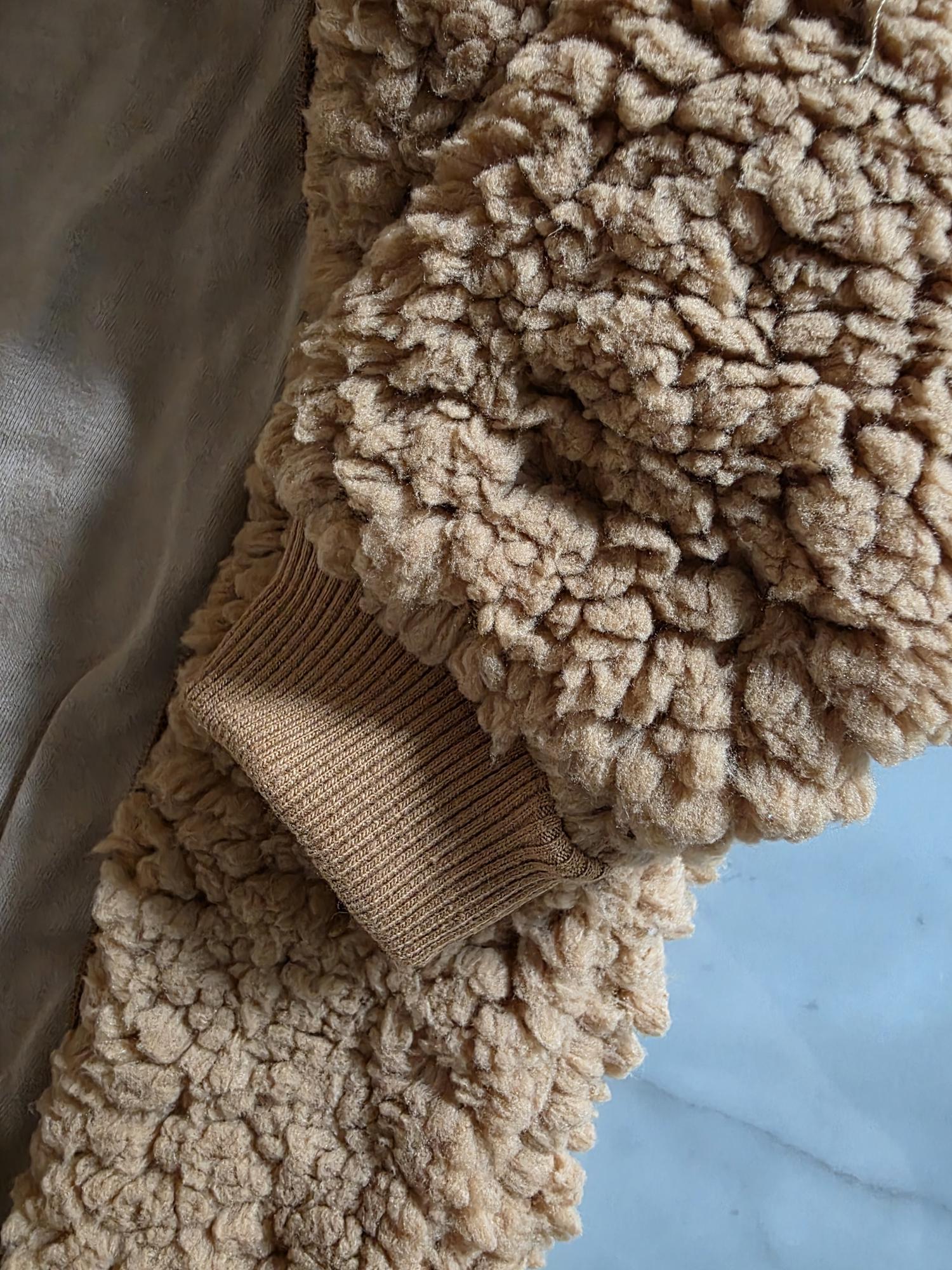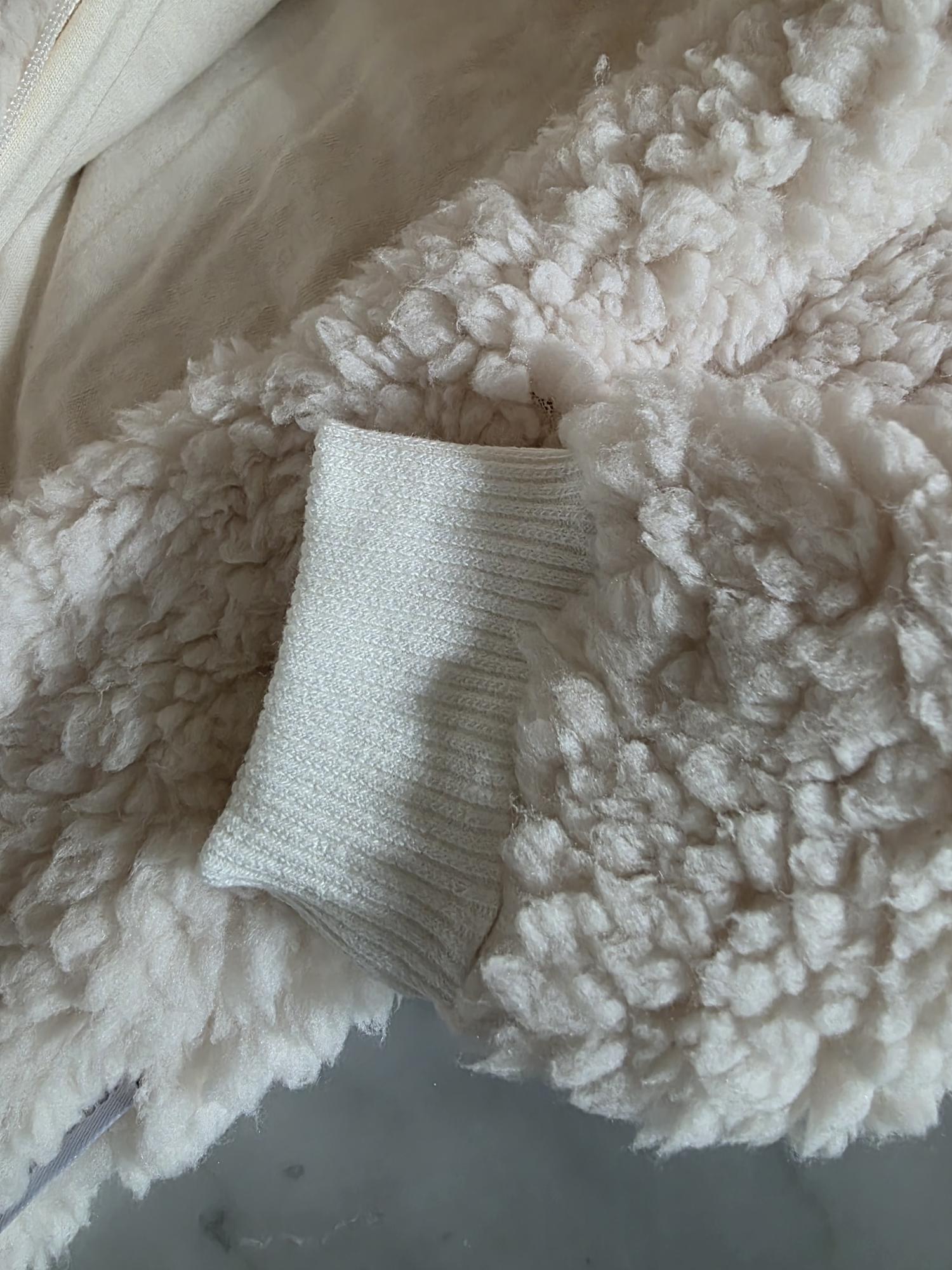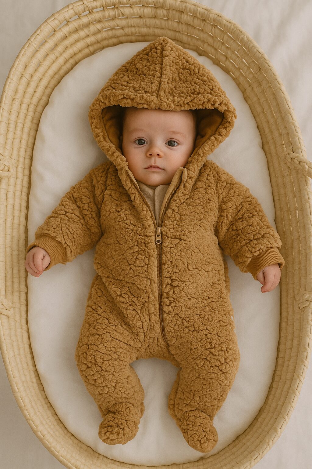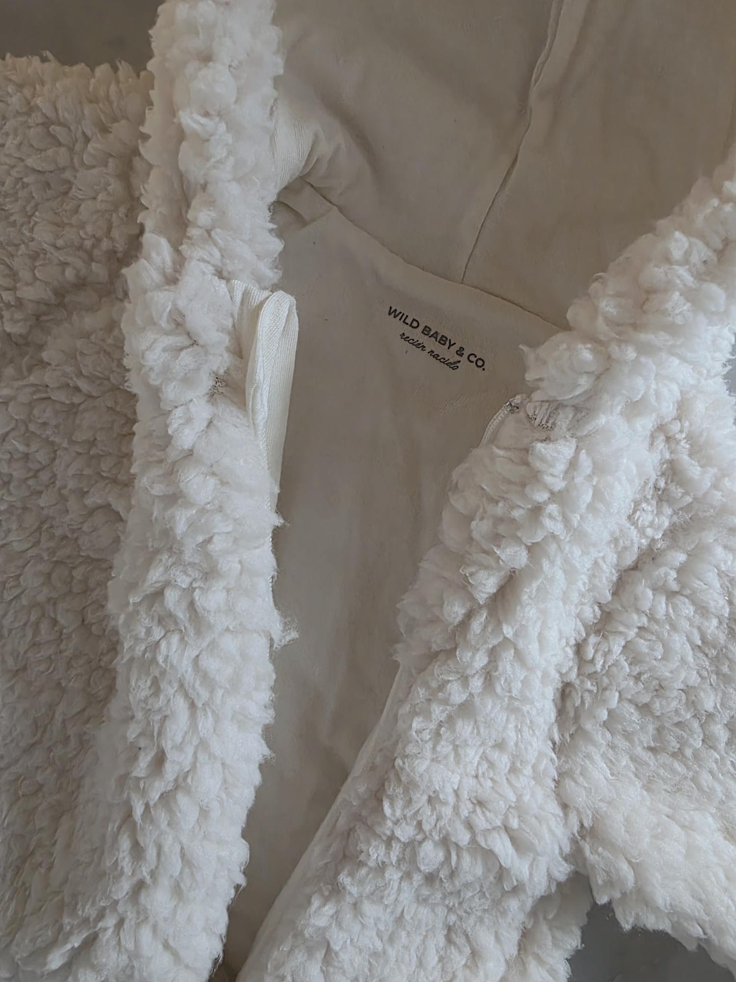Enterito con capucha confeccionado en corderito sherpa: abrigo, suavidad y ternura en una sola prenda.