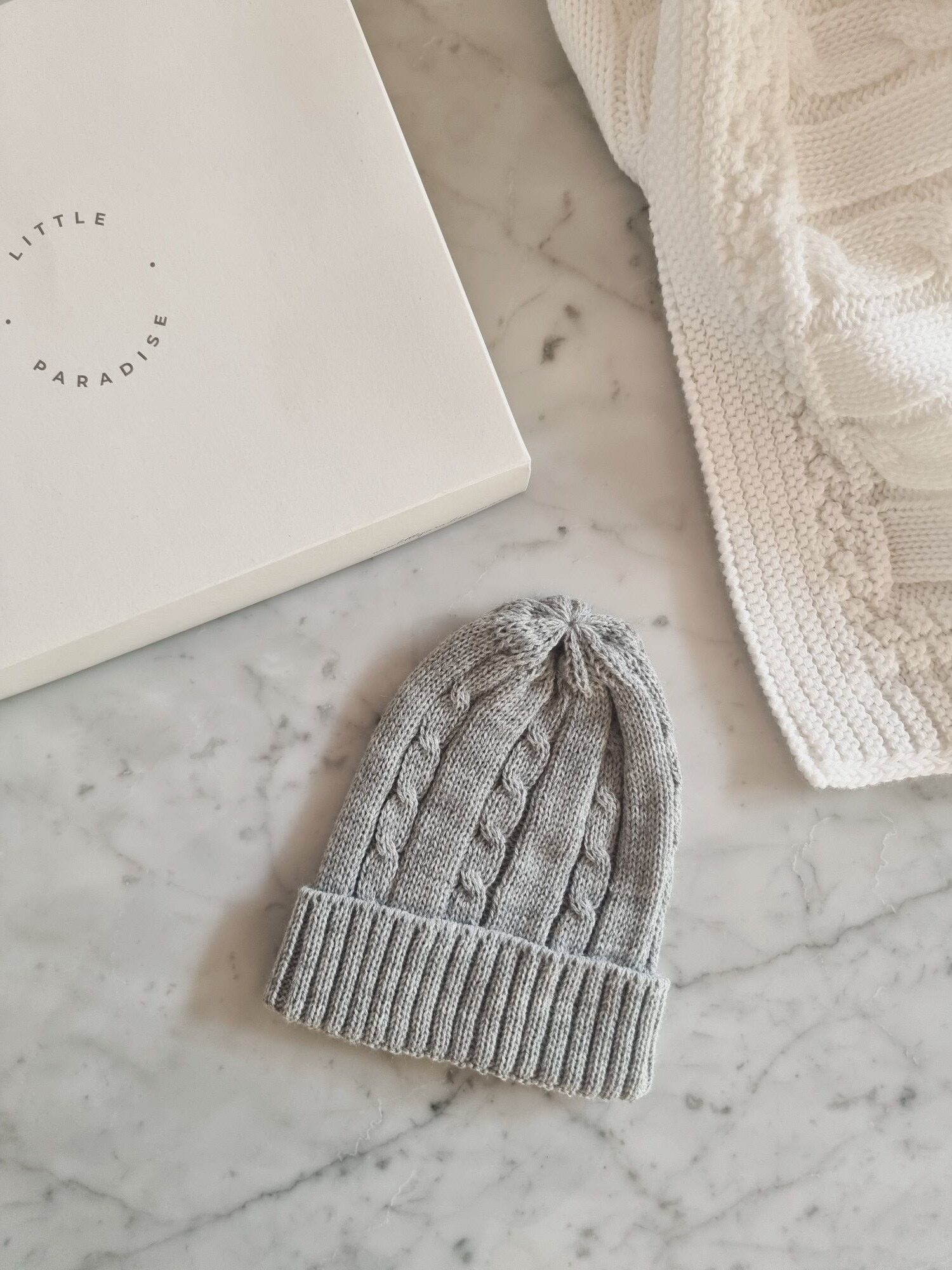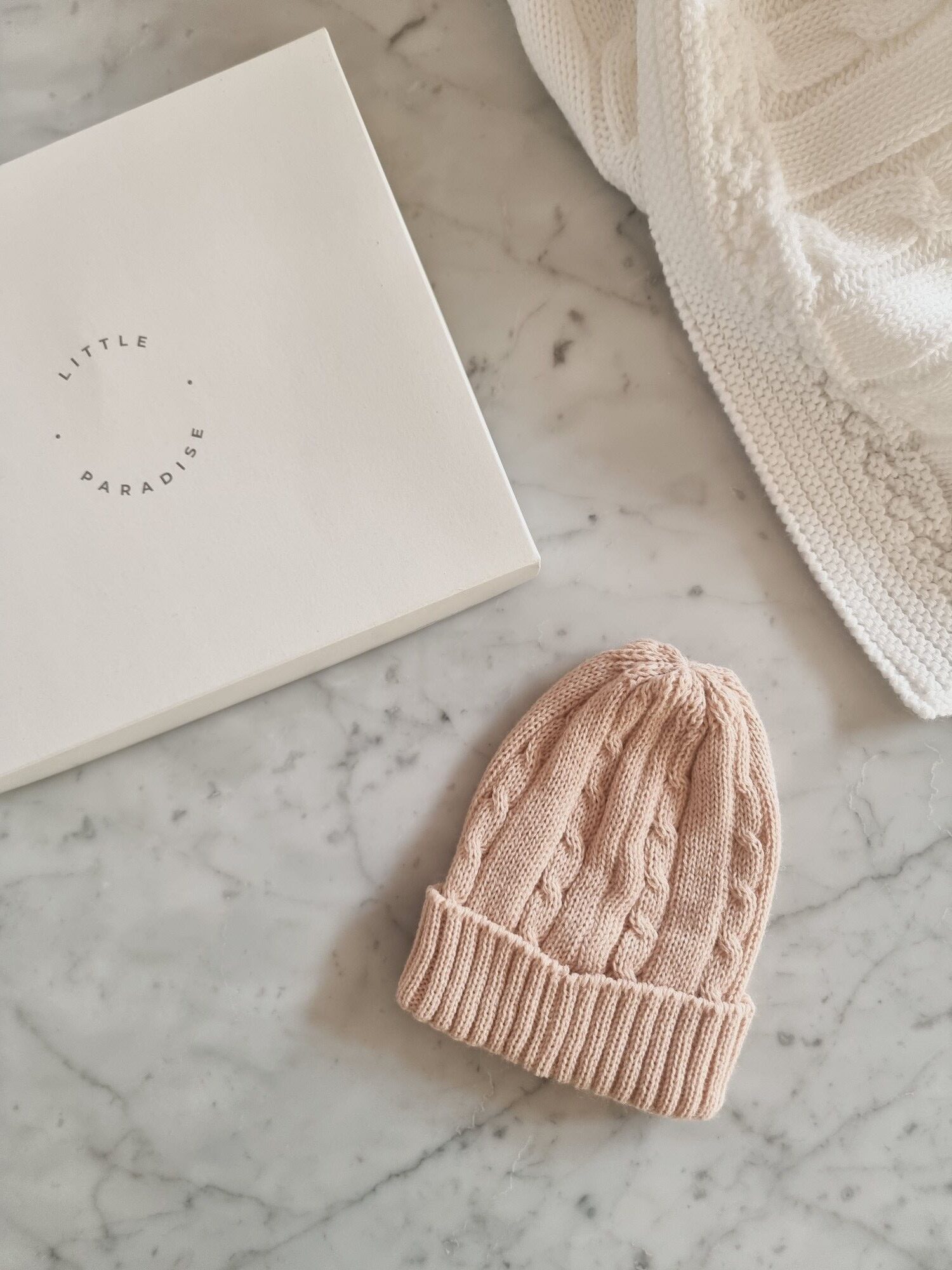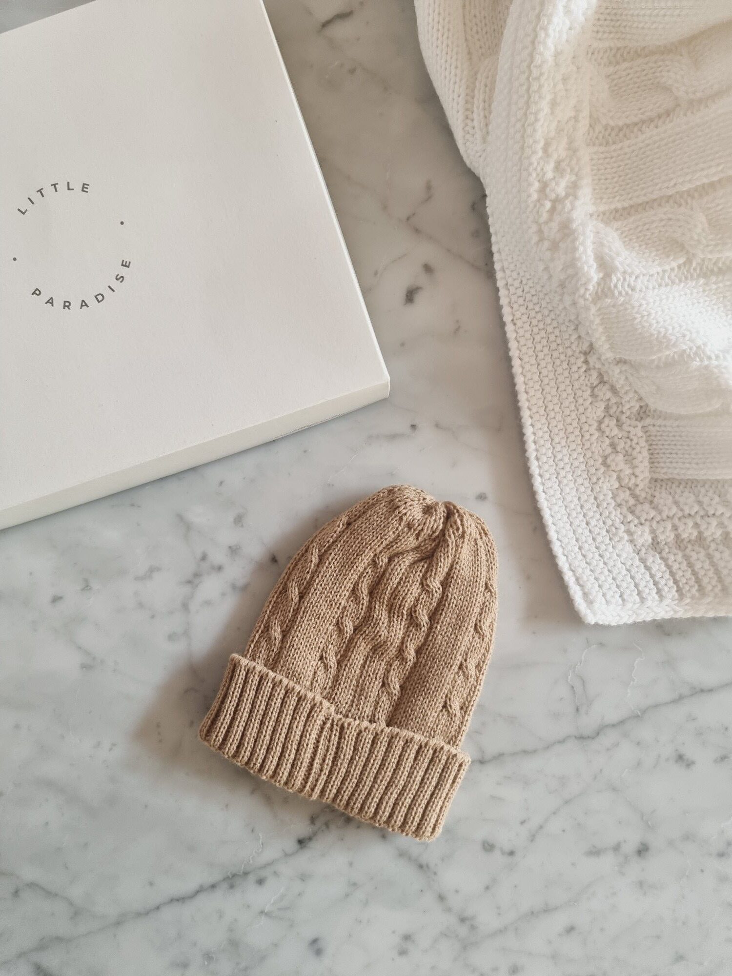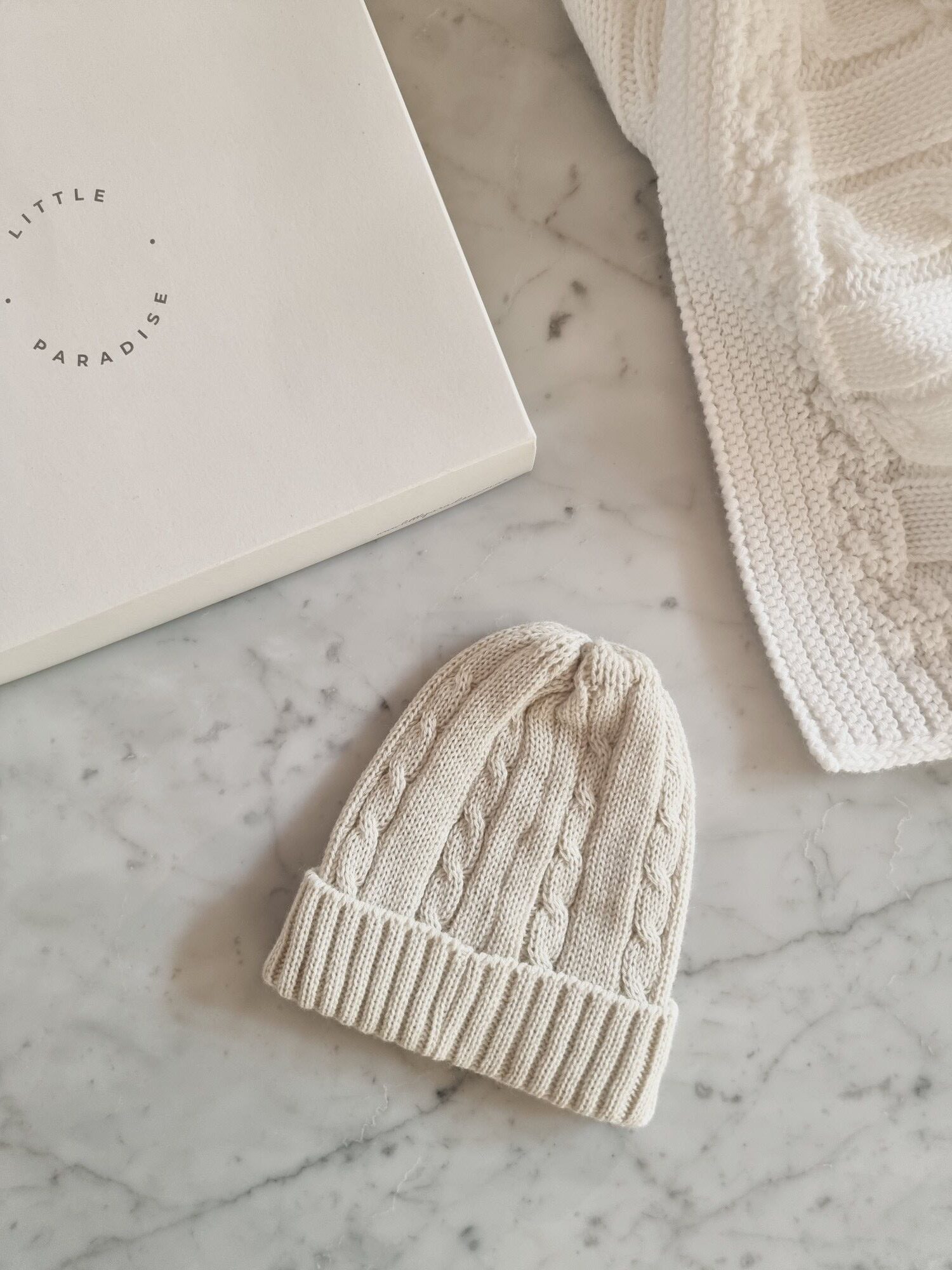 Gorrito tejido en punto de ochitos. Confección y terminaciones de calidad, muy suave al tacto!