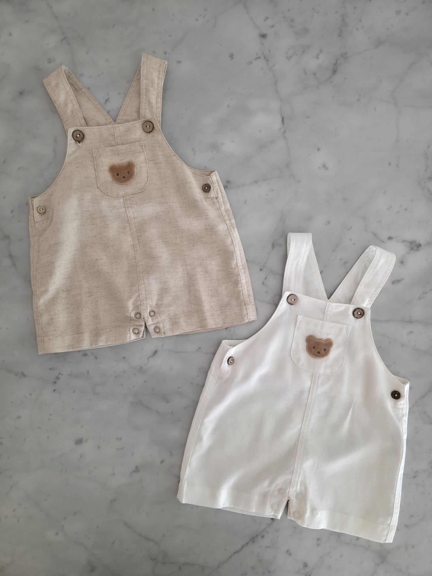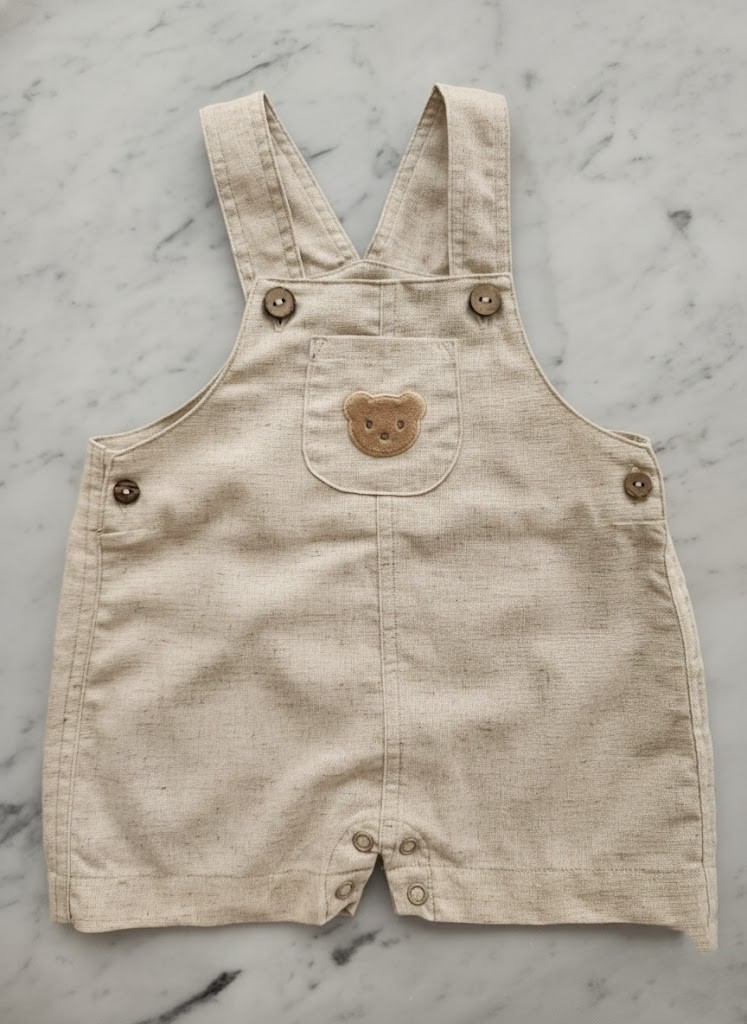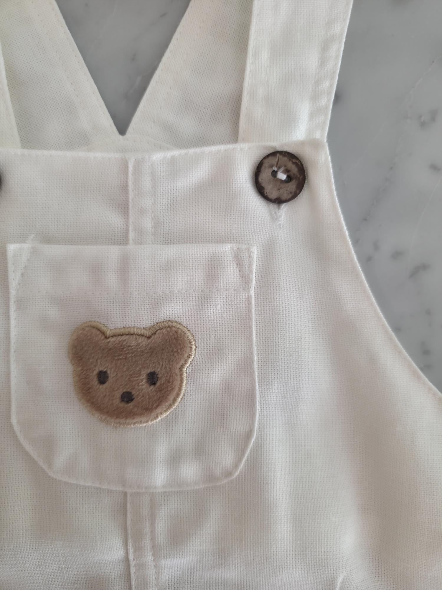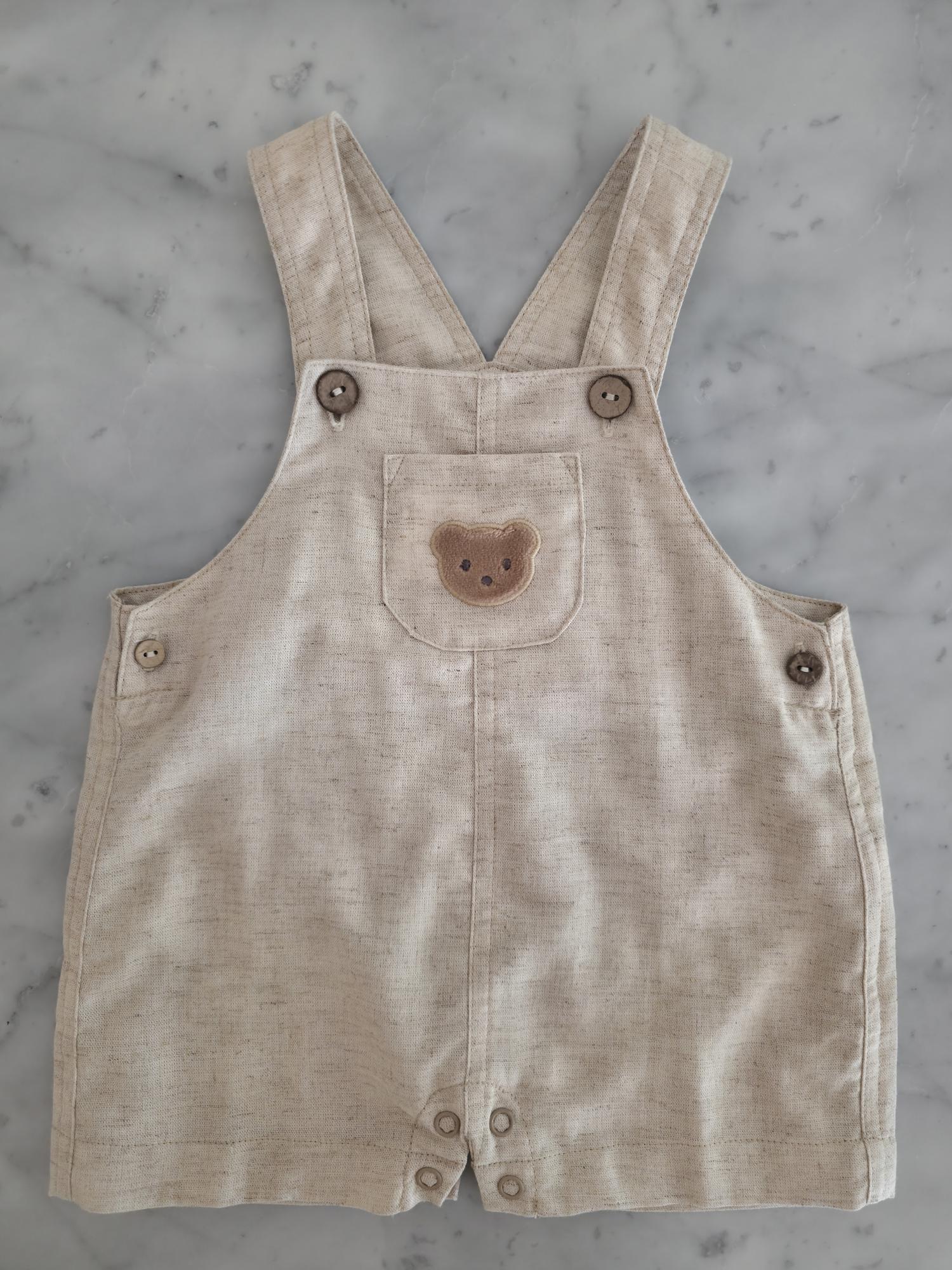 Jardinero confeccionado en Lino 100% algodón 🌿., liviano y respirable, ideal para acompañar al bebé durante los días cálidos. Su diseño de líneas simples incluye breteles con botones y un bolsillo frontal con osito aplicado, que aporta un detalle sutil y encantador.