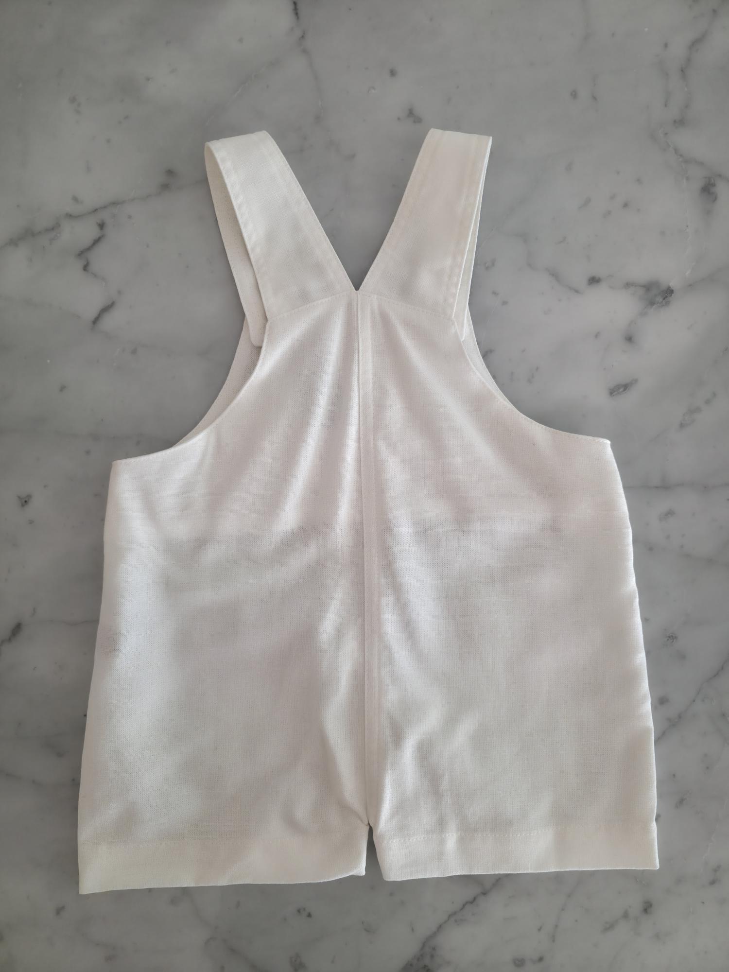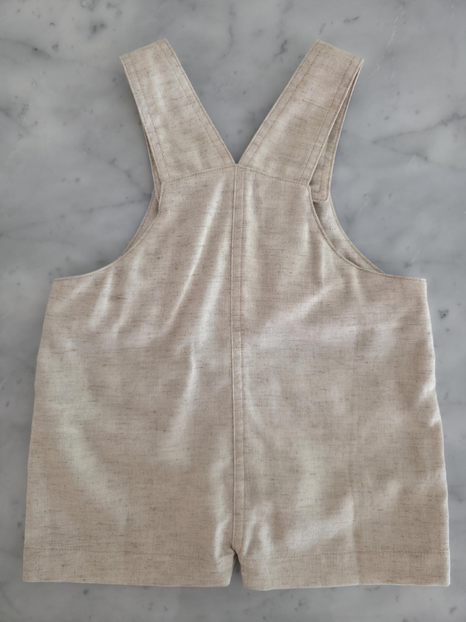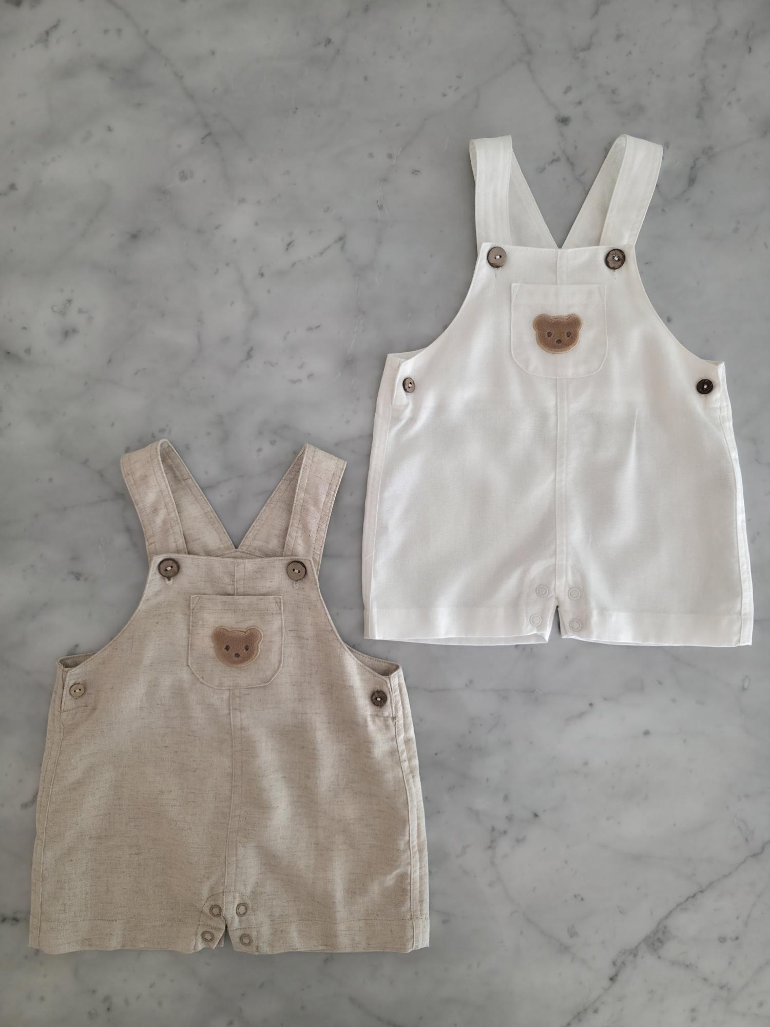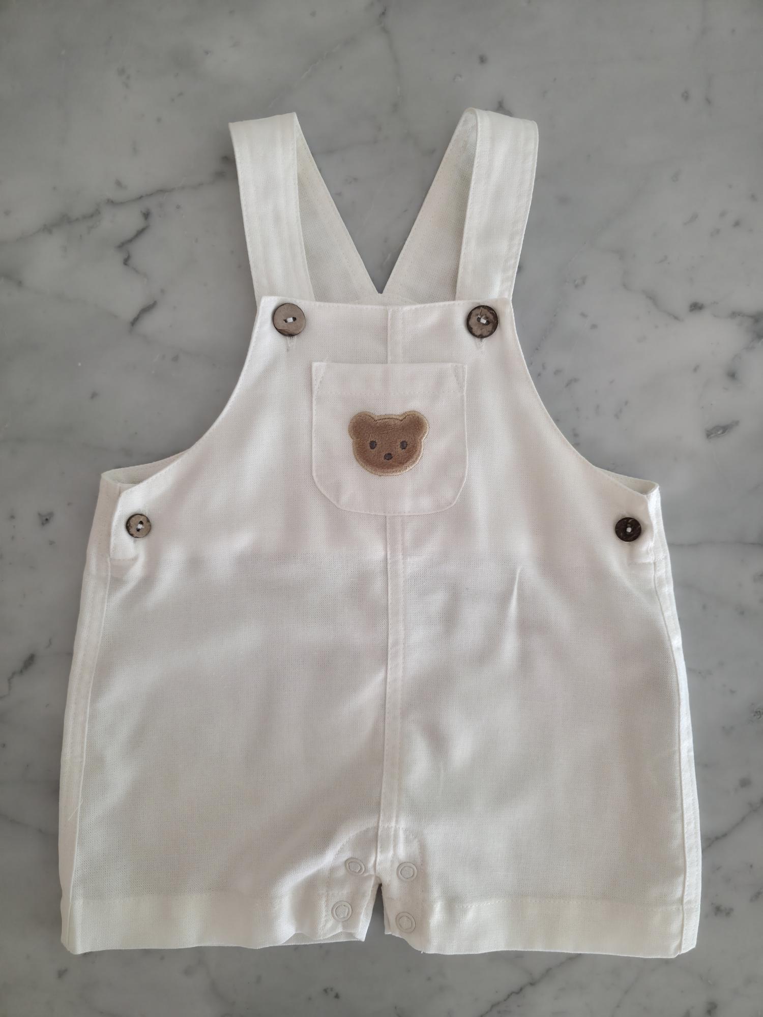 Jardinero confeccionado en Lino 100% algodón 🌿., liviano y respirable, ideal para acompañar al bebé durante los días cálidos. Su diseño de líneas simples incluye breteles con botones y un bolsillo frontal con osito aplicado, que aporta un detalle sutil y encantador.