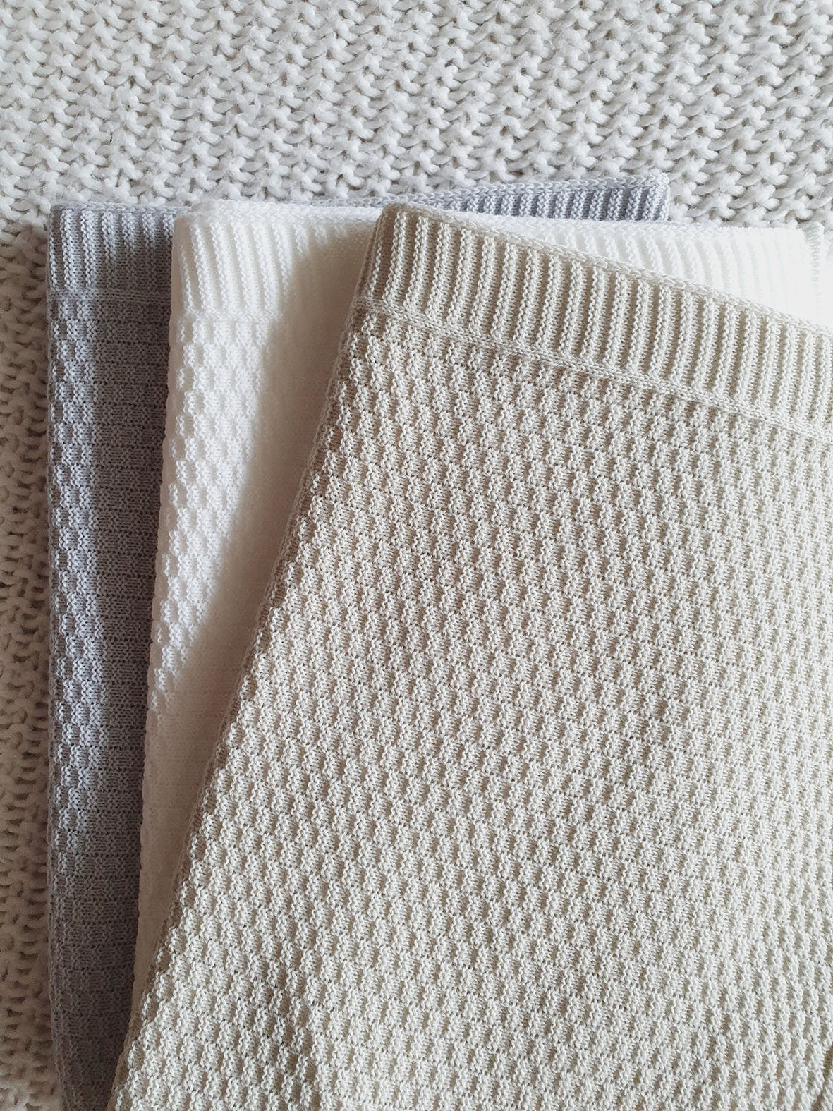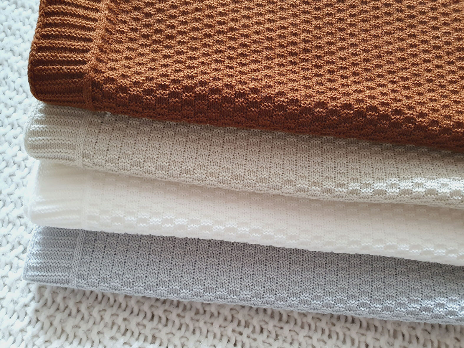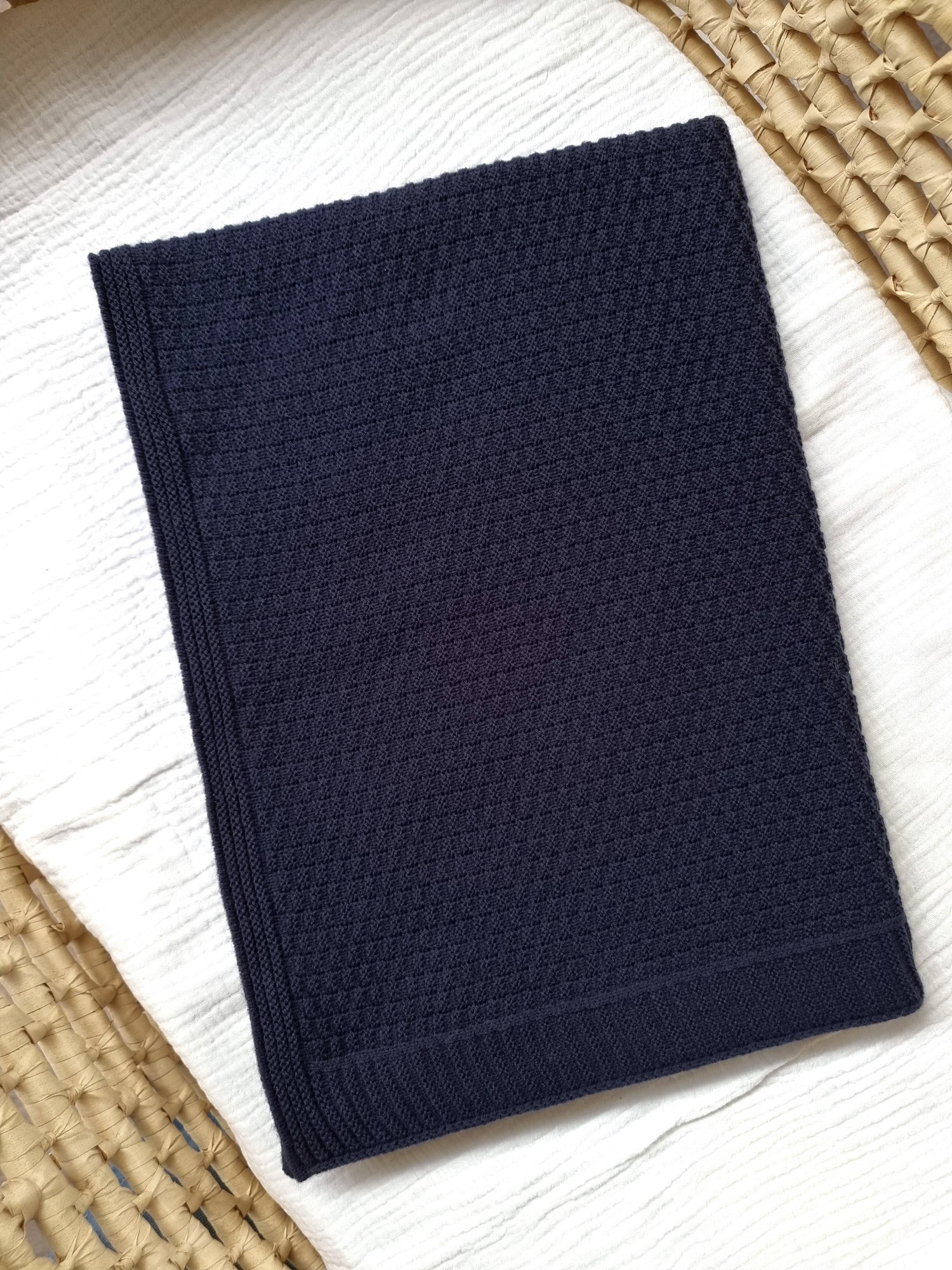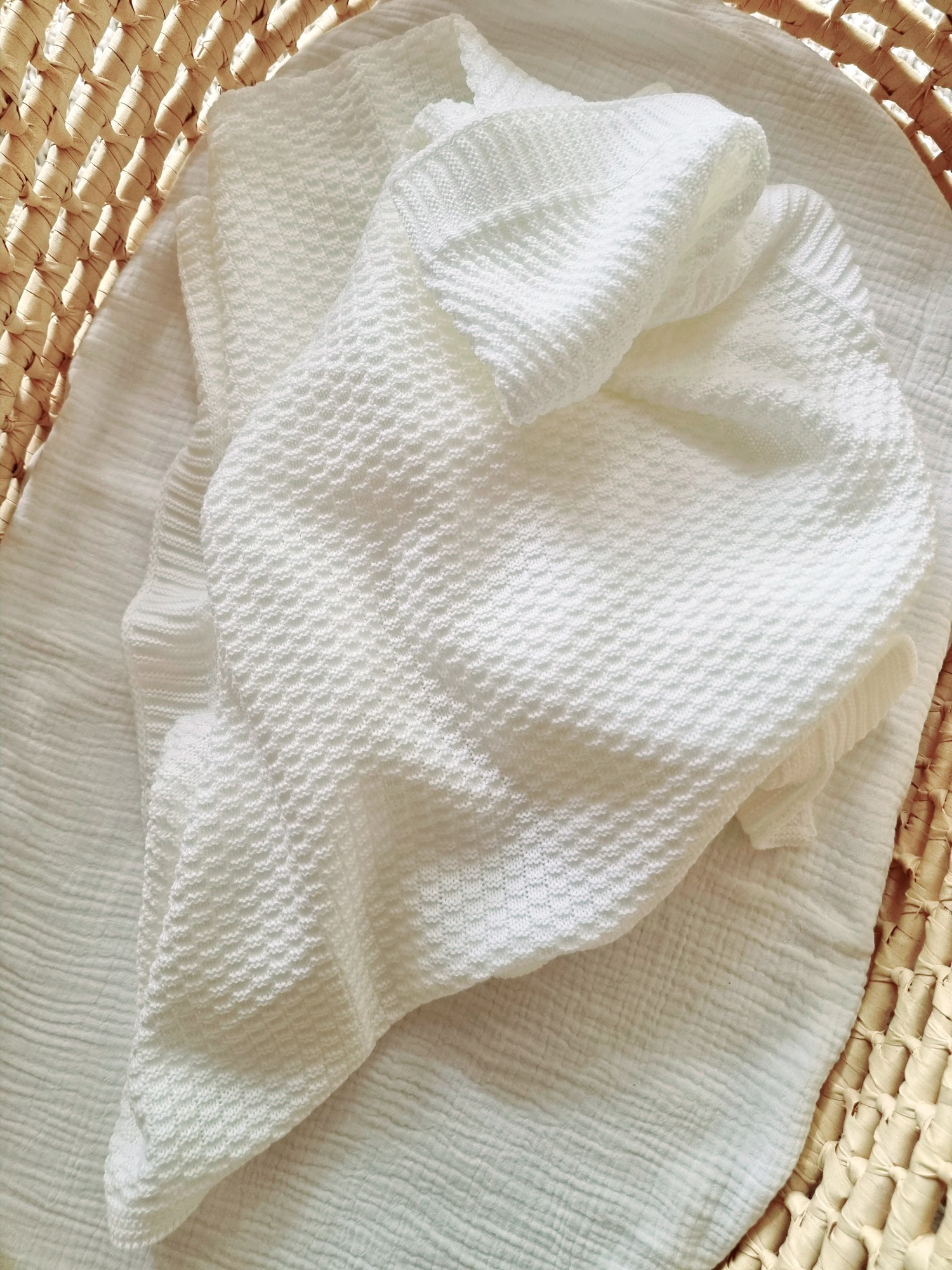 Manta tejida en hilo dralon, con hermoso diseño en punto santa clara. Confección y terminaciones de calidad.