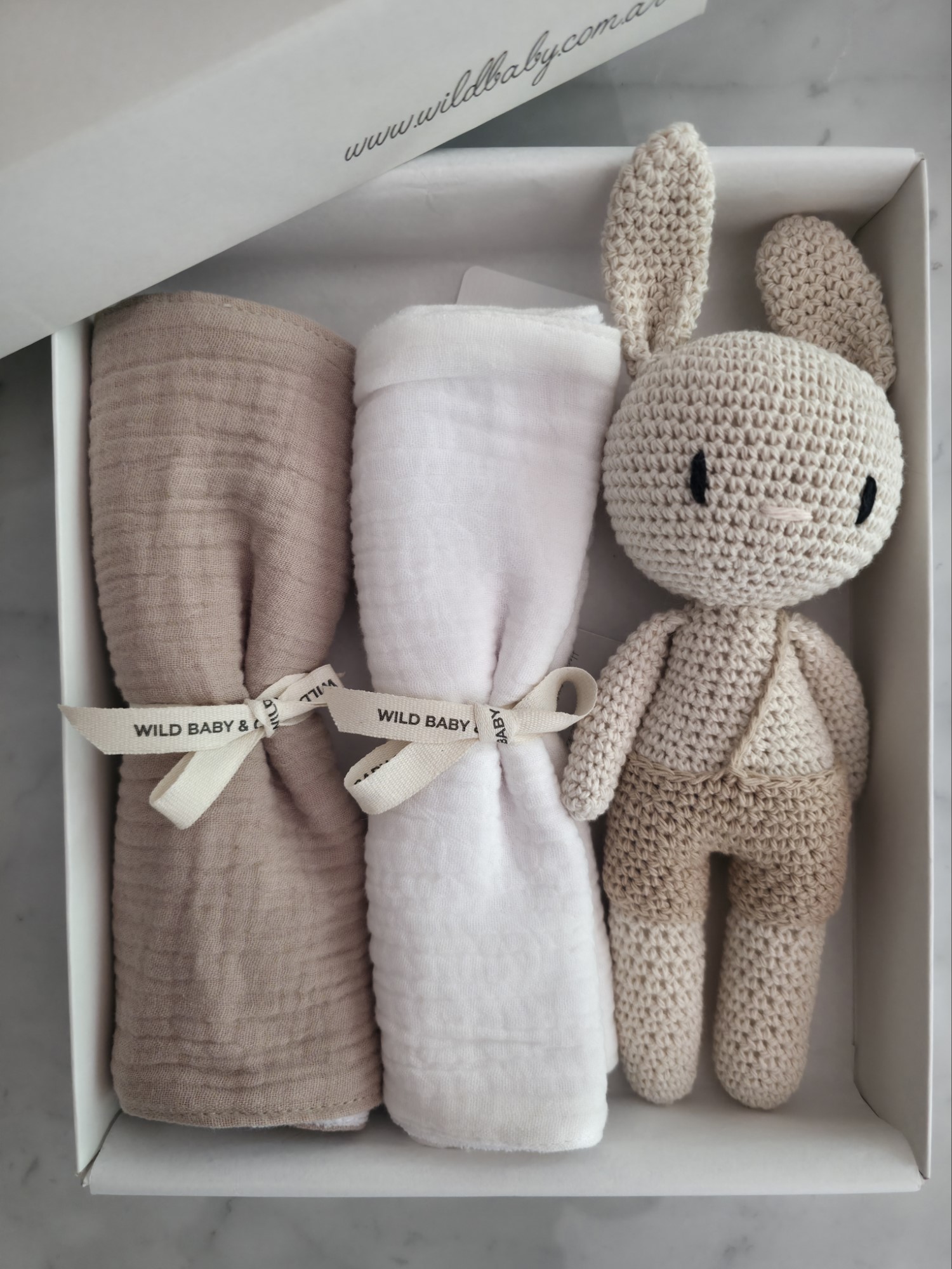 Presentado en nuestra caja exclusiva Wild Baby & Co, envuelto en papel de seda y acompañado de una dedicatoria personalizada. Un regalo pensado para perdurar. 🐰