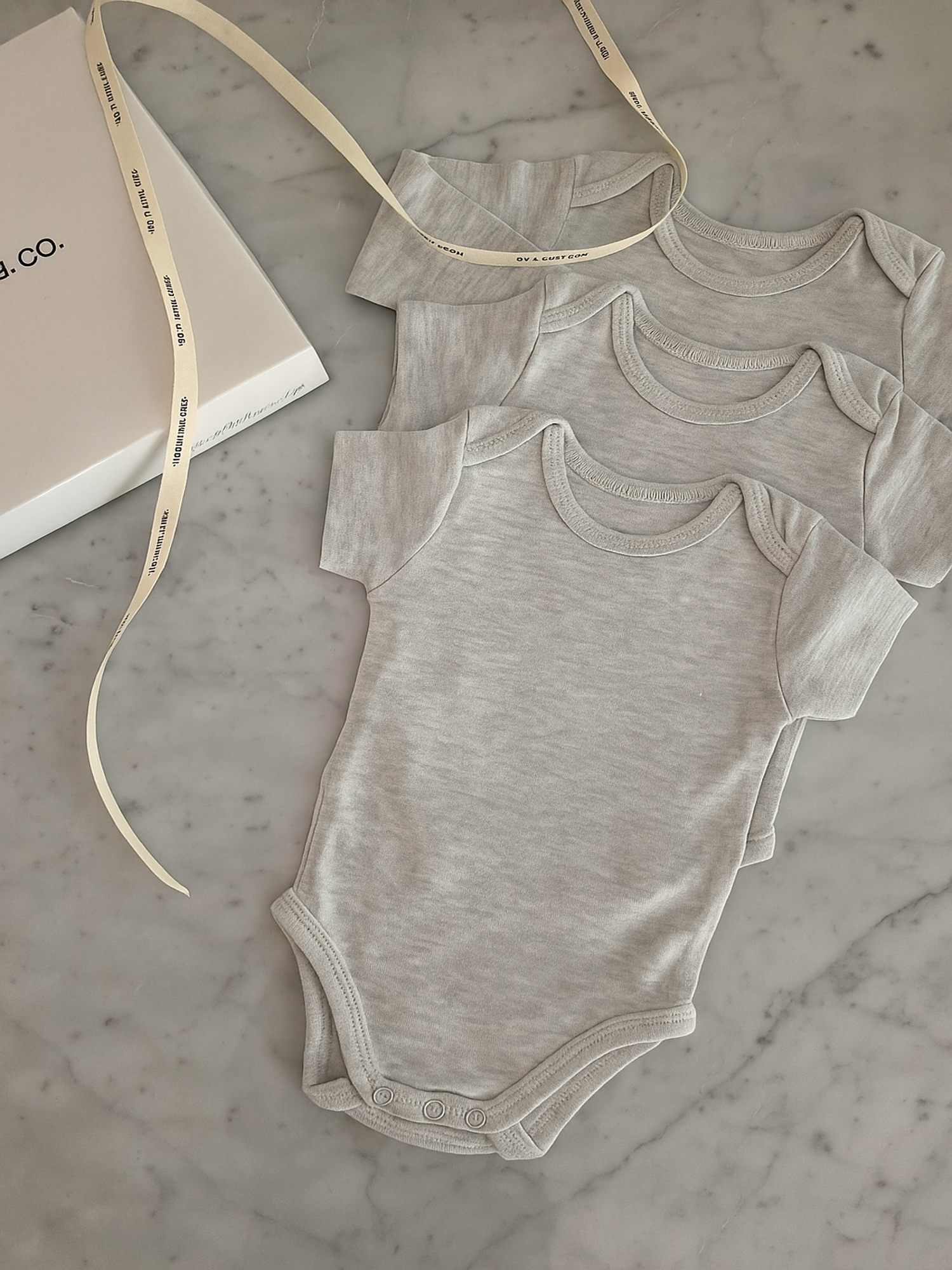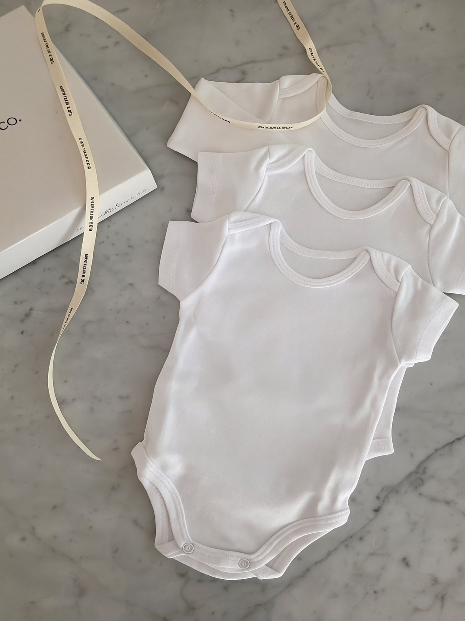 🤍 Un delicado set de tres bodies de algodón pima de manga corta, ideal para los días de verano y los primeros meses del bebé.
