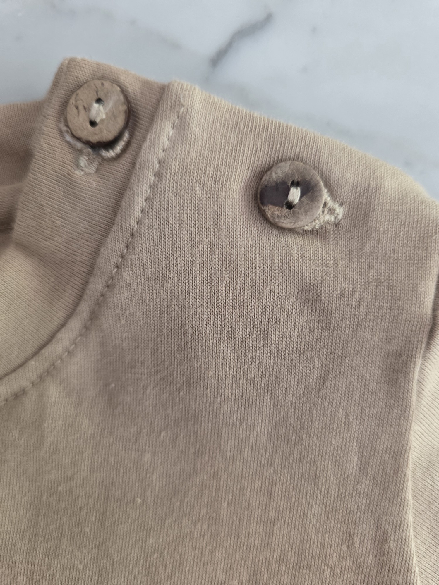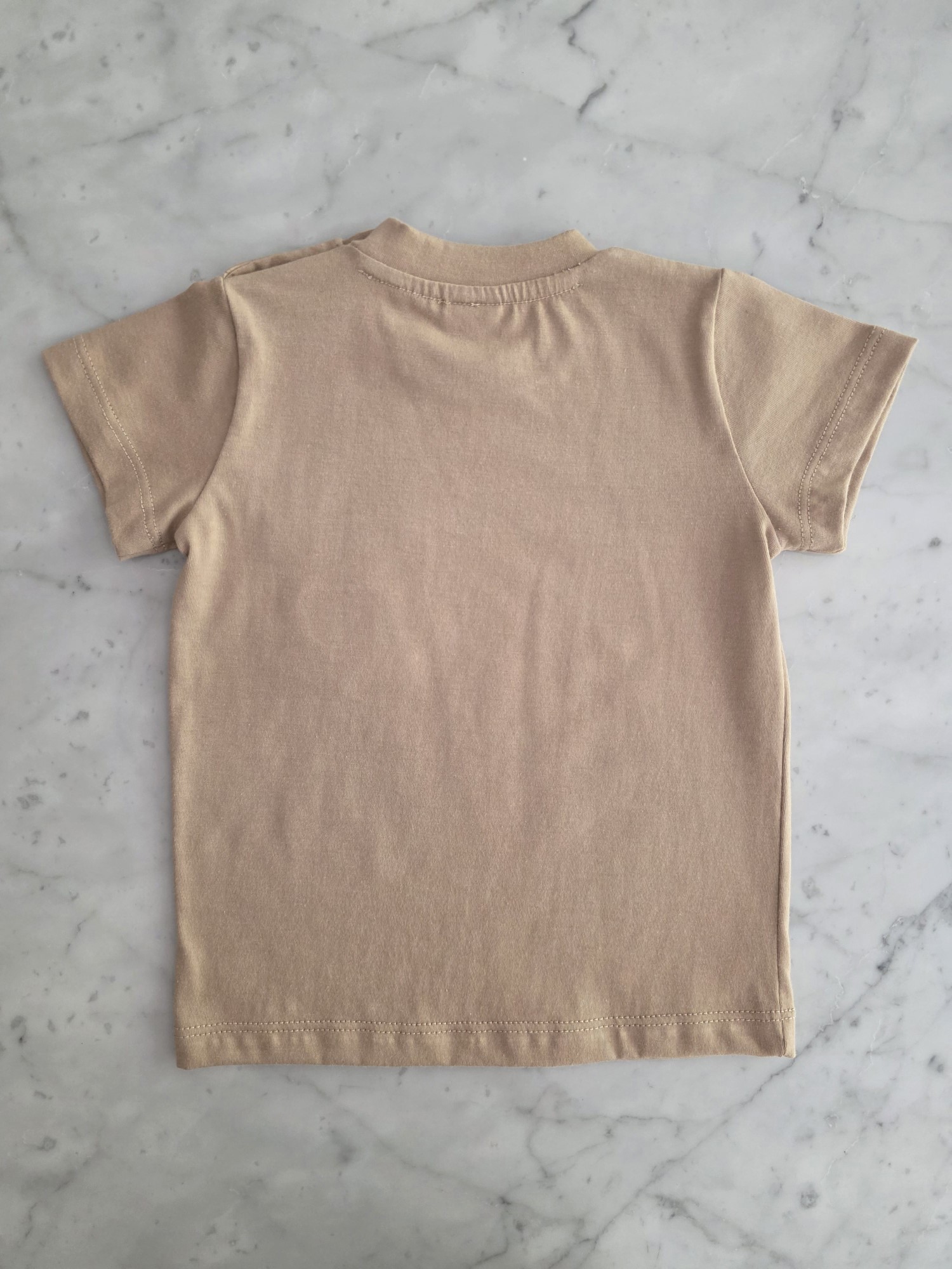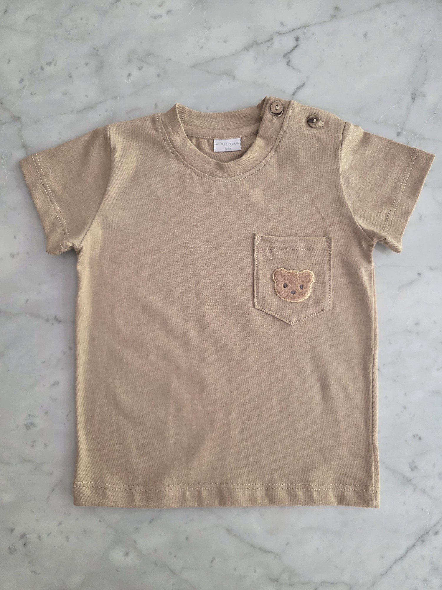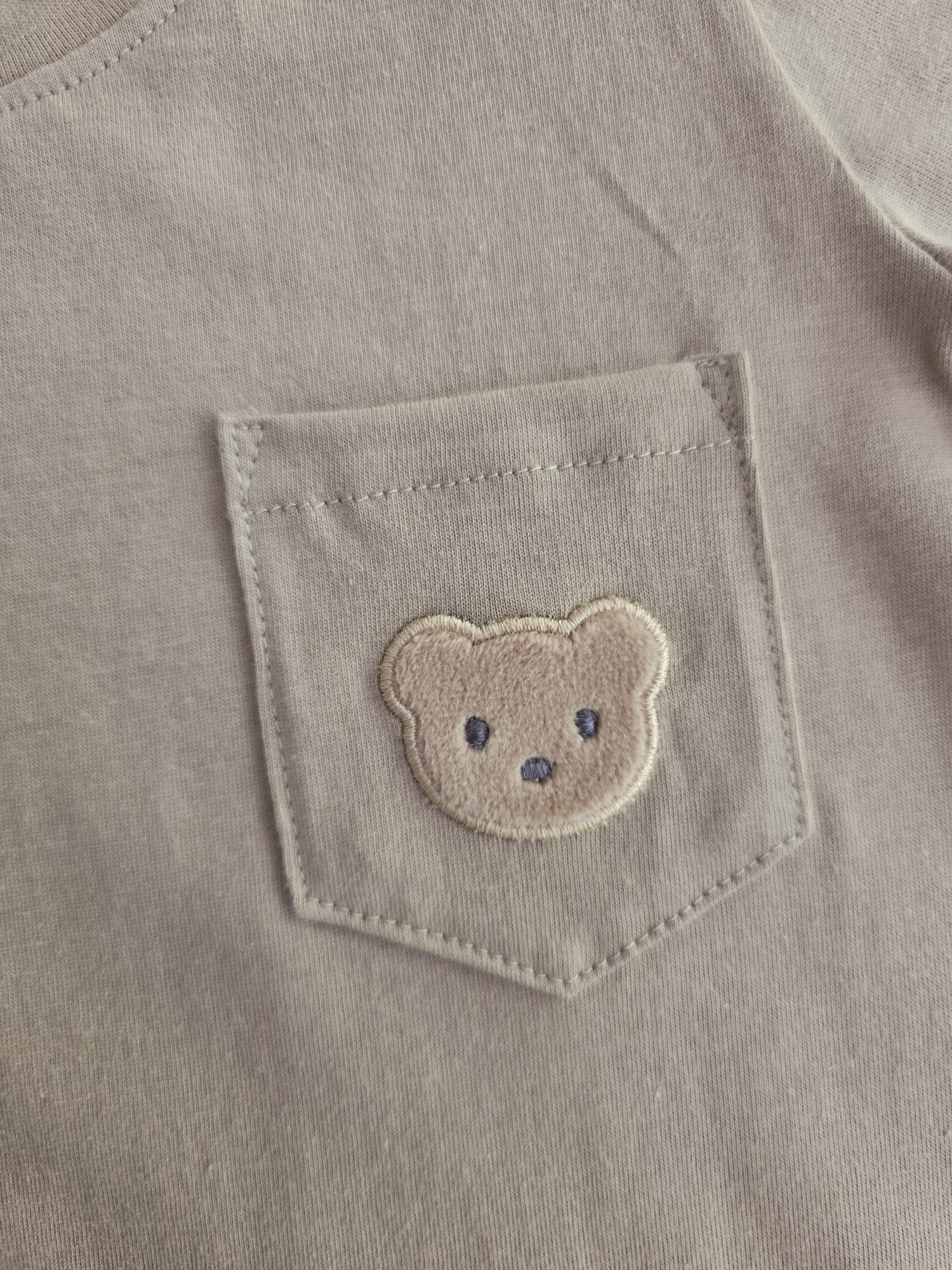 Remera manga corta confeccionada en jersey 100% algodón, liviana y confortable. Presenta un bolsillo frontal con un delicado osito bordado que aporta un detalle sutil y clásico.