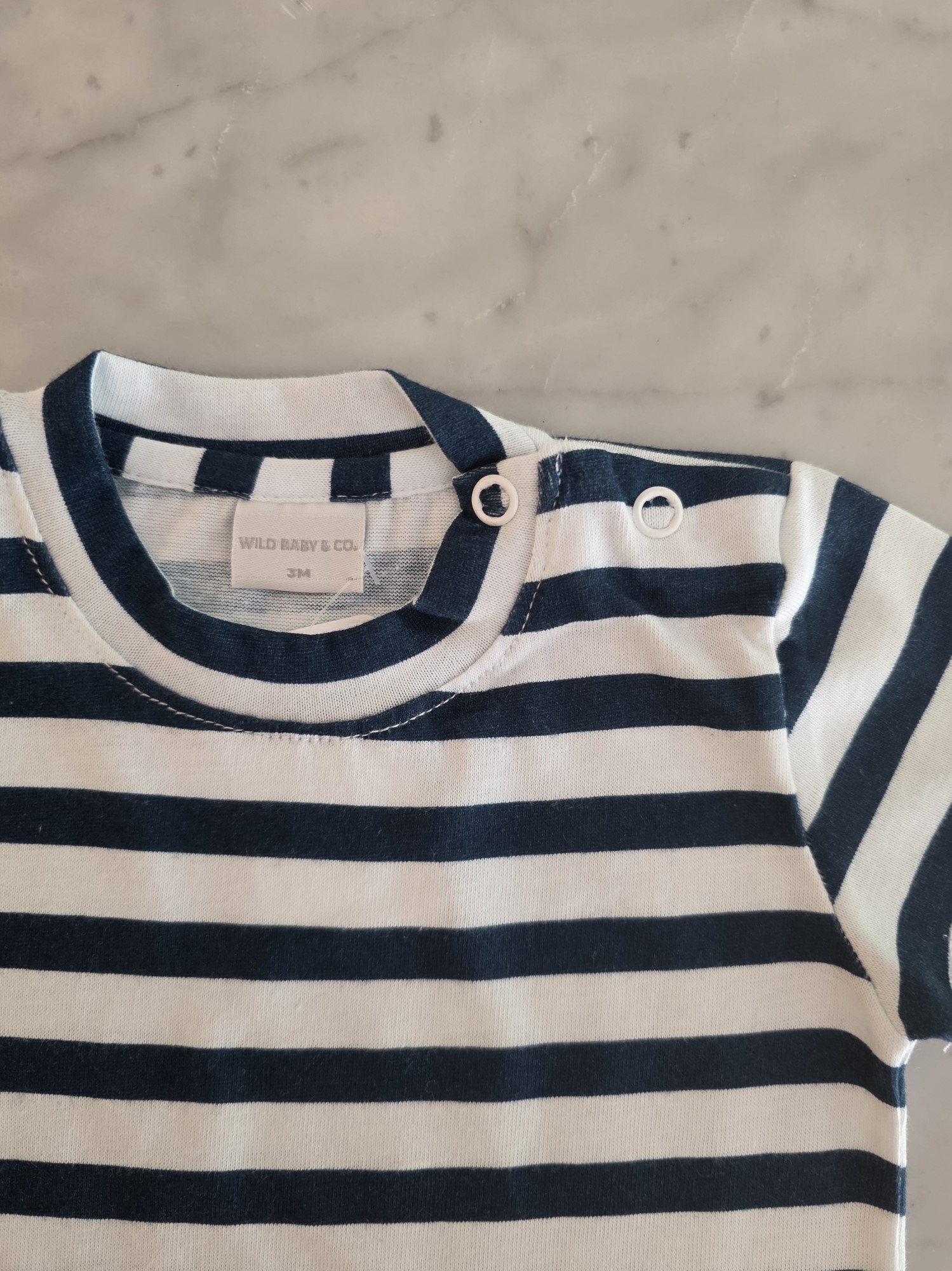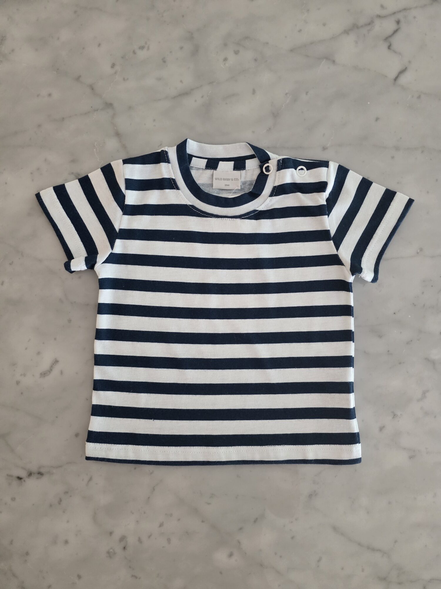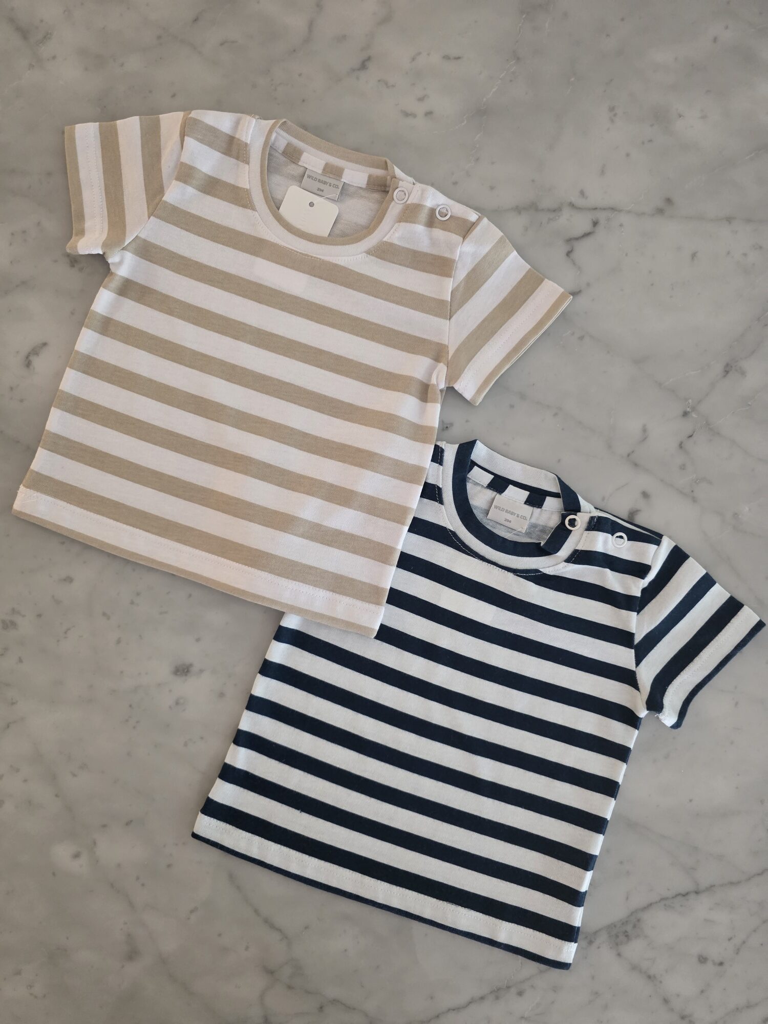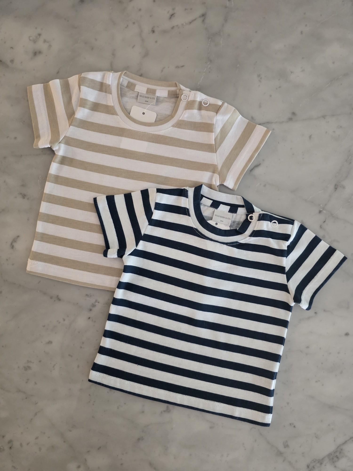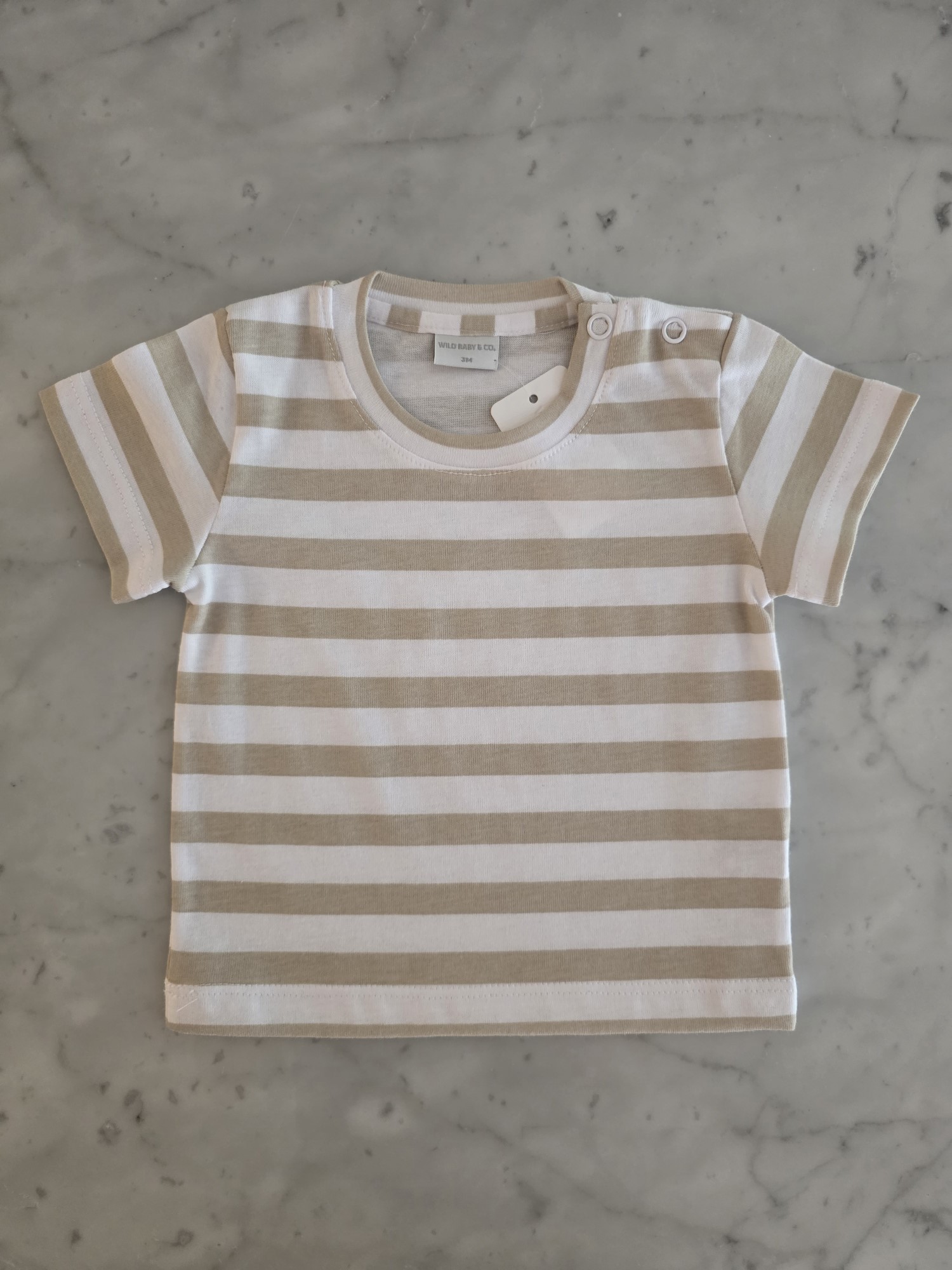 Remera manga corta confeccionada en jersey 100% algodón, liviana y confortable. Incluye broches a tono en el hombro para vestir con mayor facilidad. Estampa rayada disponible en tonos beige y azul, ideal para combinar con cualquier look.