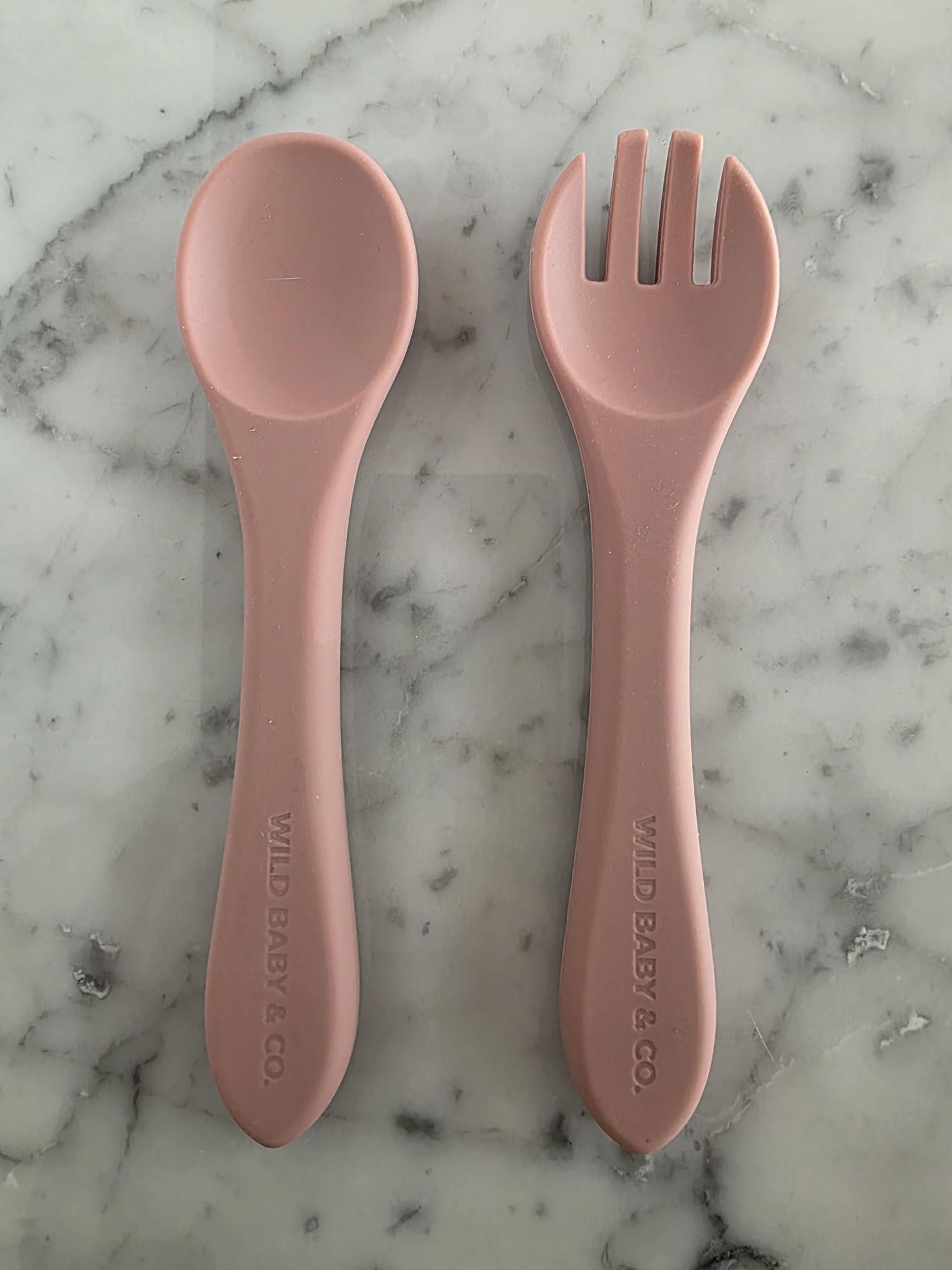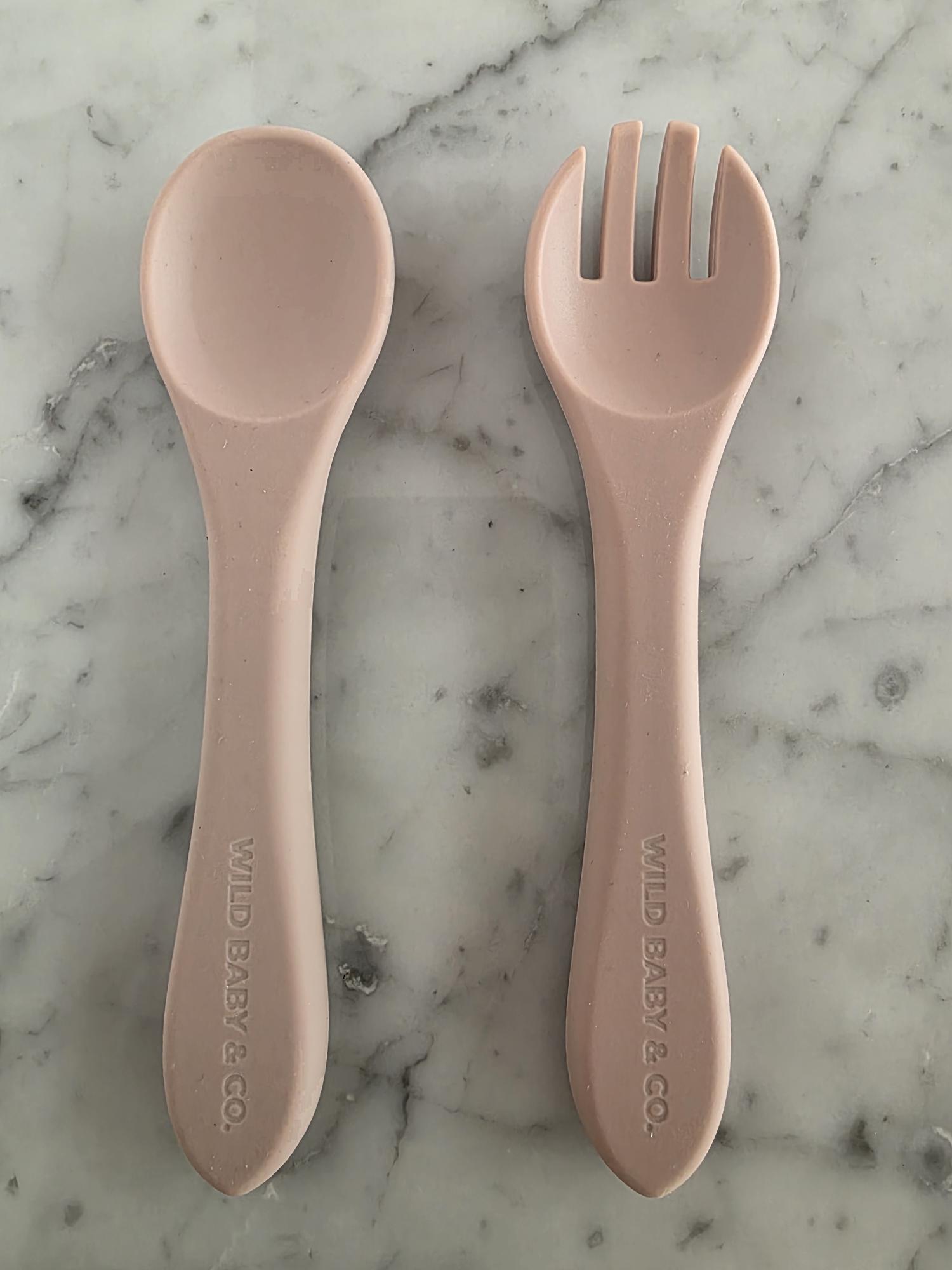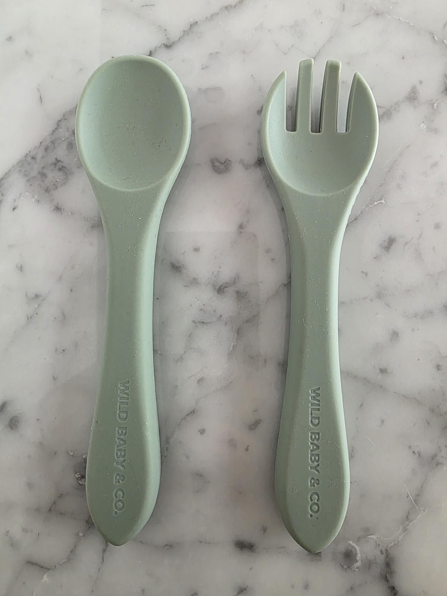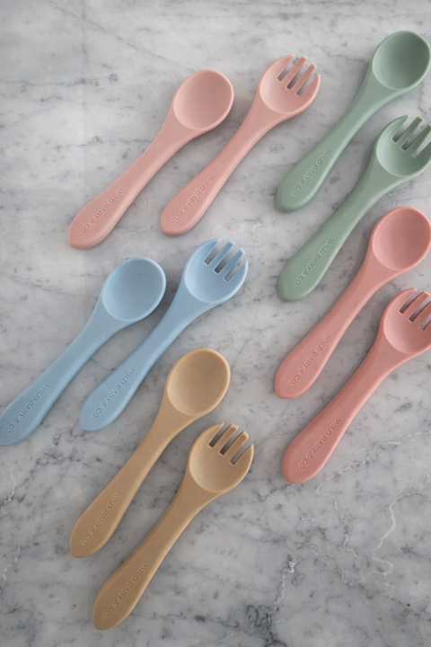 El set de cuchara y tenedor de silicona, perfecto para acompañar al bebé en sus primeras comidas y en el inicio de la alimentación autónoma. Ideal para método BLW.