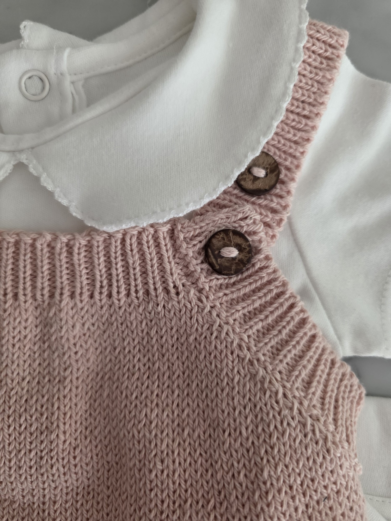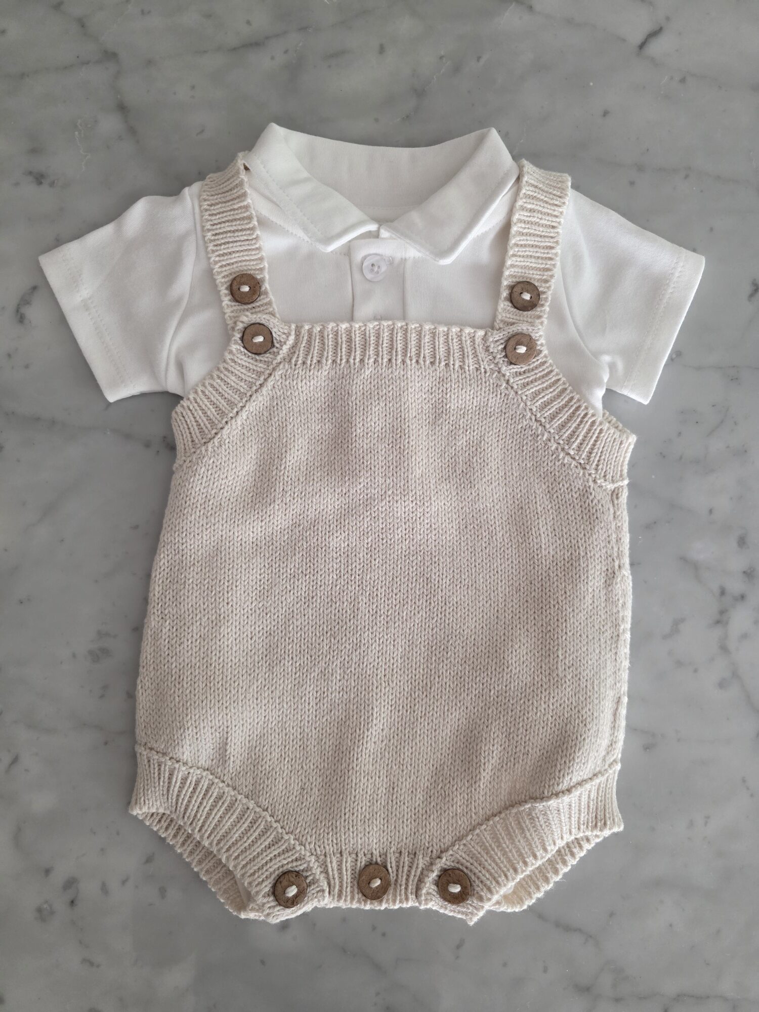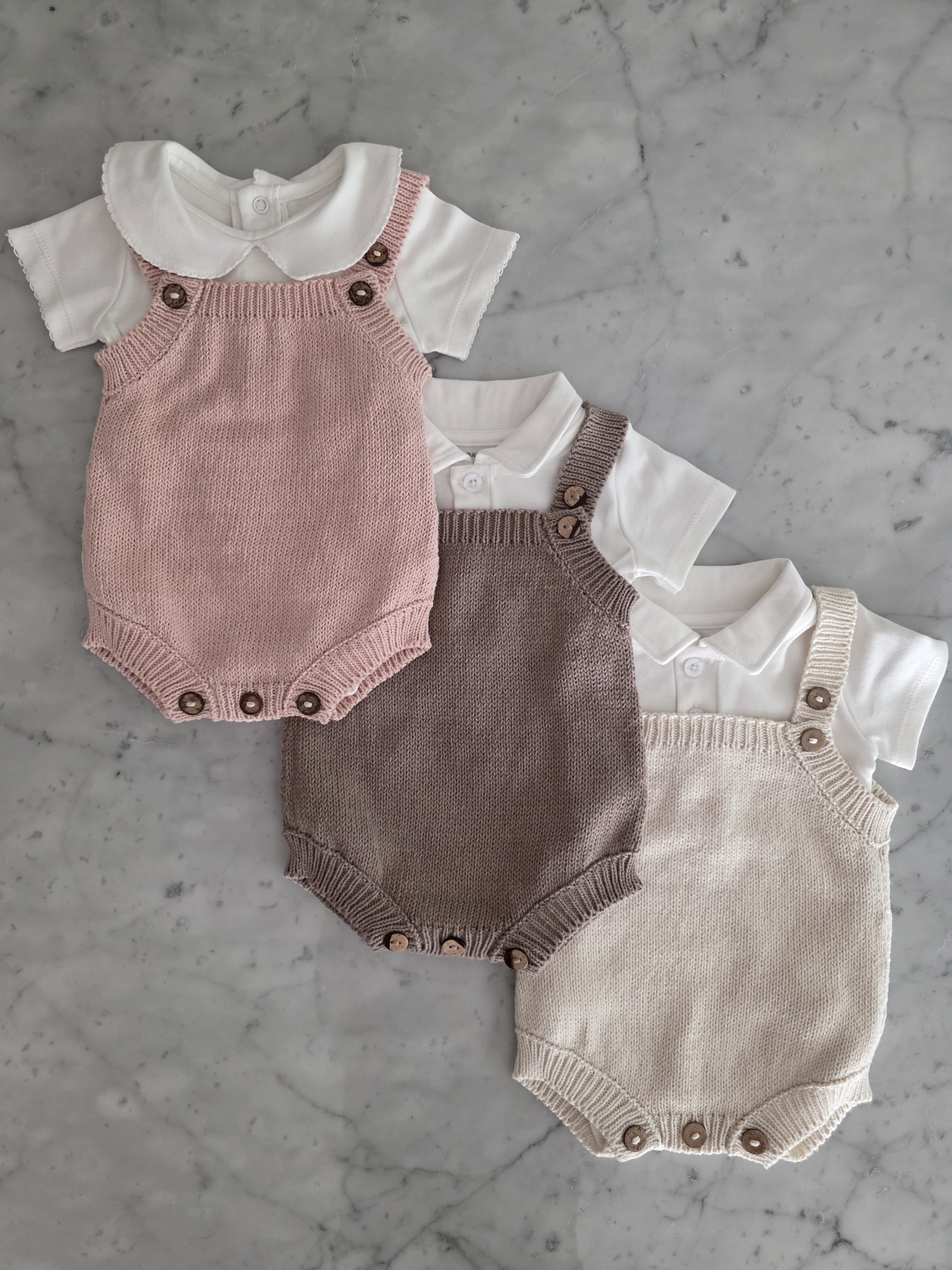 Este set exclusivo combina un body tejido en talle RN y un body de algodón en talle 1 mes, diseñados para acompañar con delicadeza la piel del recién nacido.
