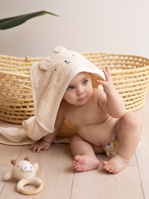Toallón con capucha, con bordado de osito y orejitas aplicadas. Un esencial al momento del baño por su suavidad y funcionalidad.