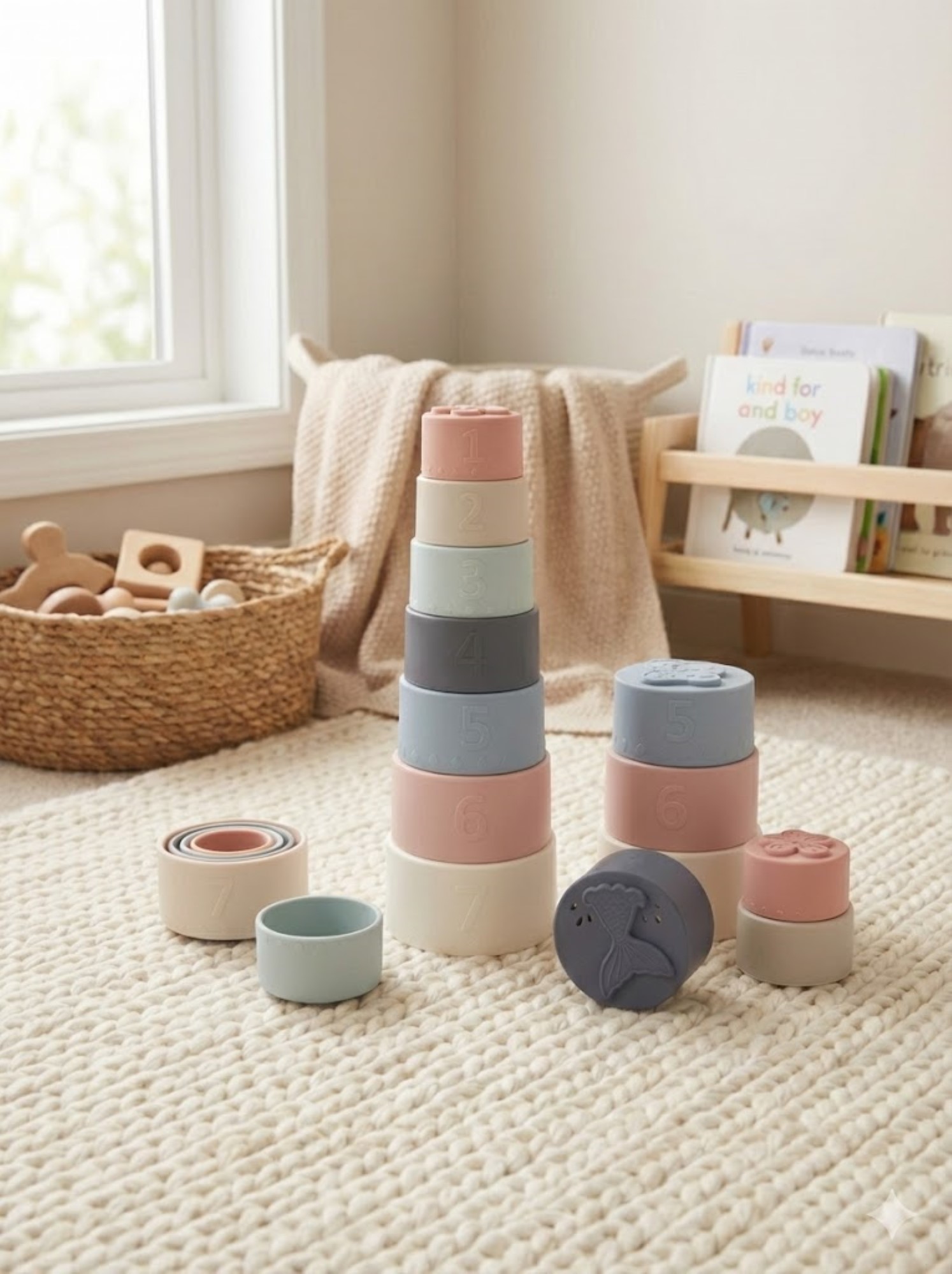 Set de vasos apilables diseñados para acompañar el desarrollo sensorial y motor del bebé de forma simple, segura y consciente.
